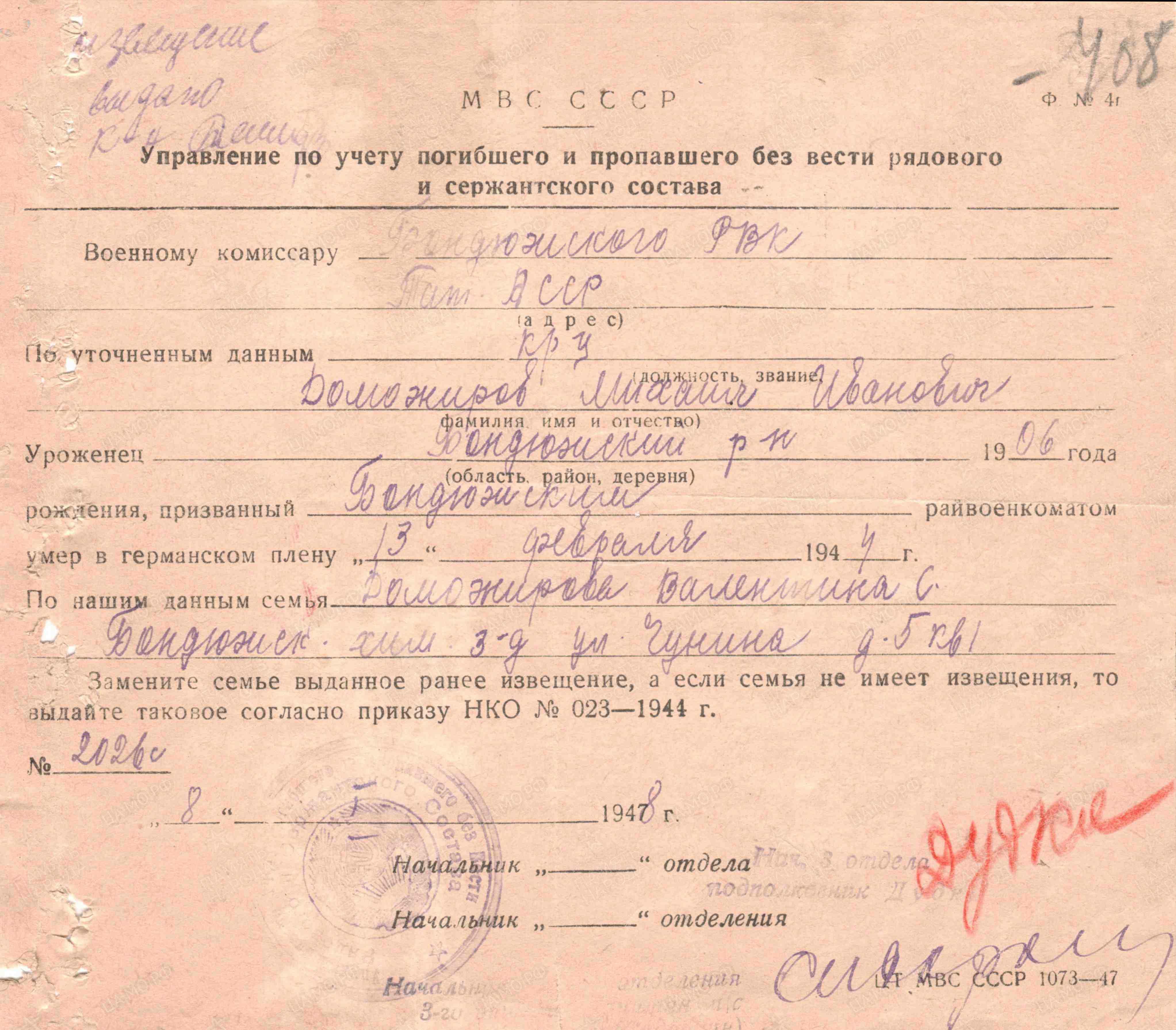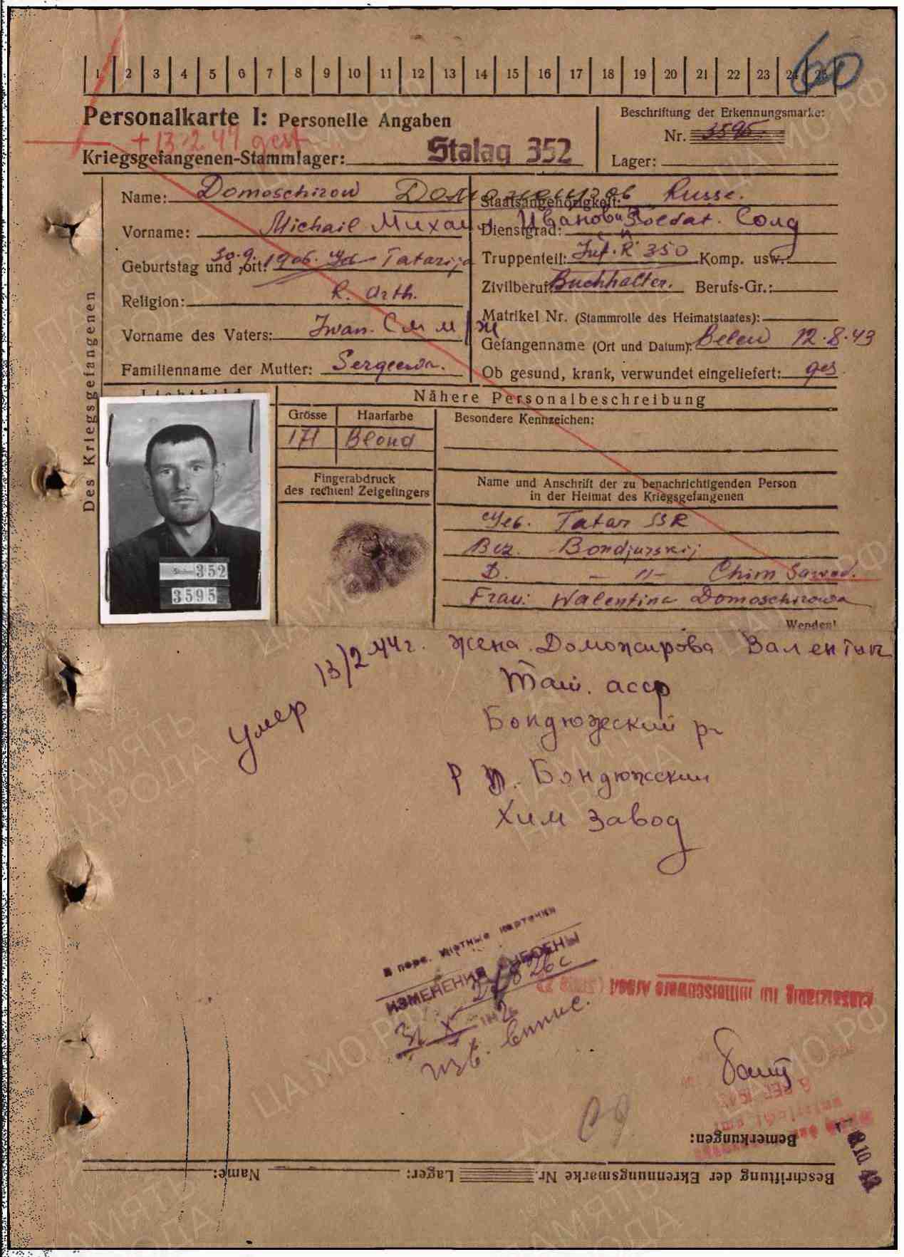 12.08.1943 г. попал в плен г.Белев. Лагерь шталаг 352, лагерный номер 3595. Погиб в плену 1944 г., Германия.