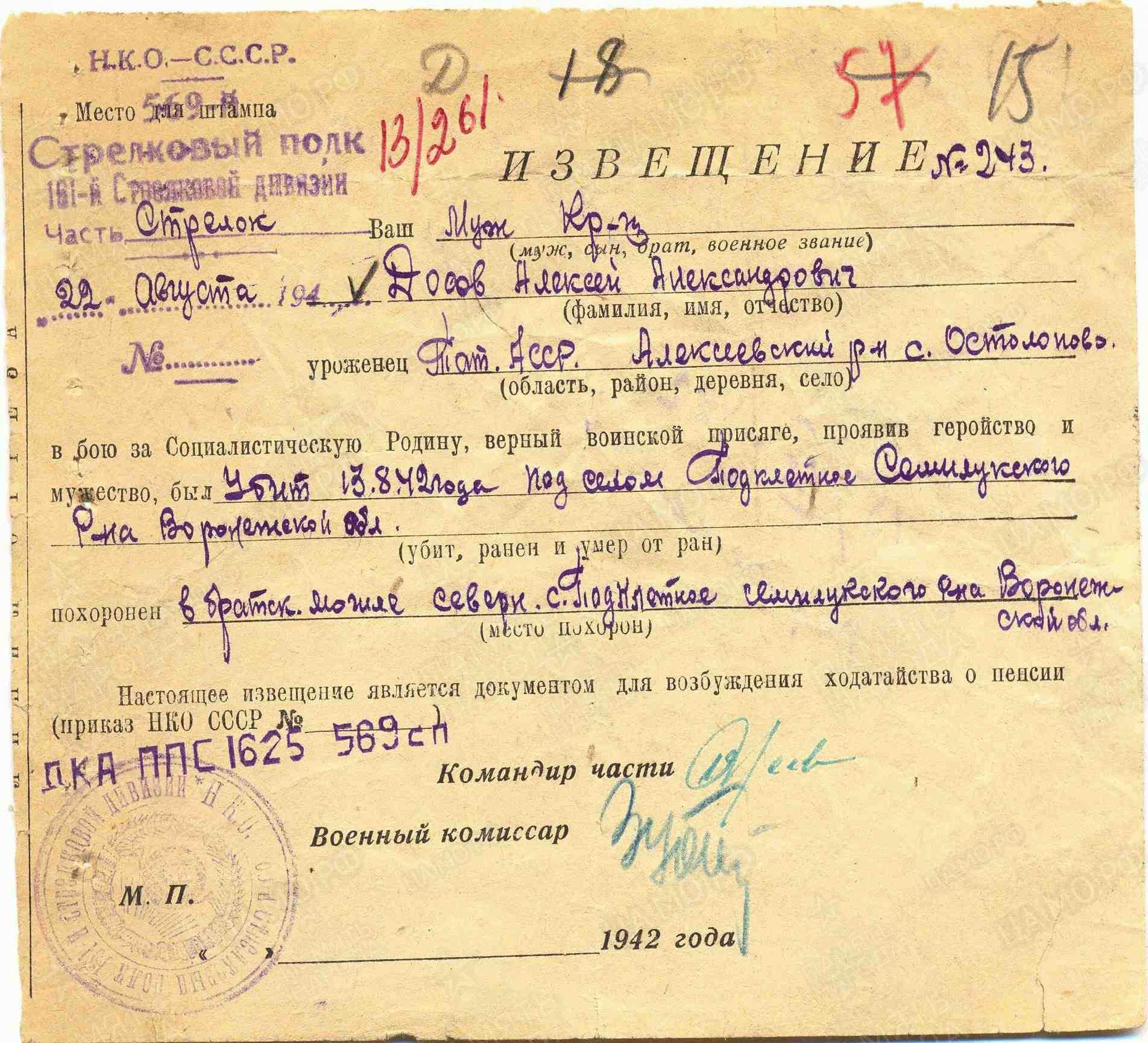 ДОСОВ Алексей Александрович, 1914, с. Остолопово. Жил в г. Чистополь. Мобилизован Чистопольским РВК. Красноармеец 569 СП 161 СД. Погиб 13 августа 1942 г., Воронежская обл., Семилукский р-н, с. Подклетное.