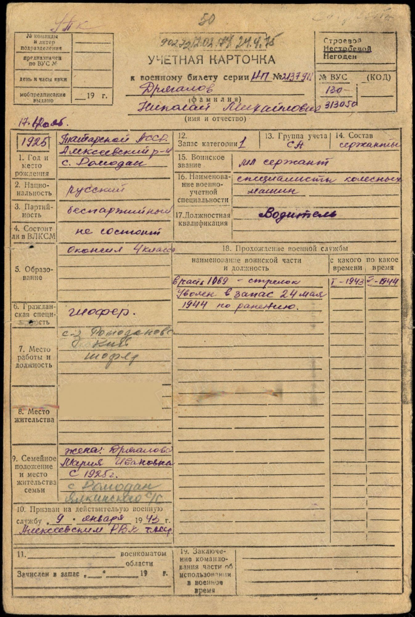 ДРЯГАЛОВ Николай Михайлович, 1925, с. Ромодан. Мобилизован 9/12 янв. 1943 Алексеевским РВК. На фронте с янв. 1944. Мл. сержант, 1069 СП 311 СД 8 А Волховского фронта. Участник полного снятия блокады Ленинграда. Тяжело ранен 16 фев. 1944 в левую руку. Проходил лечение в ЭГ 2856, г. Дзержинск, Горьковская обл. 20 мая 1944 признан негодным в дальнейшей службе. После демобилизации работал шофёром в с-зе «Ромодановский». Награждён орденом Отечественной войны 2 ст. (1985). Умер в 1993.