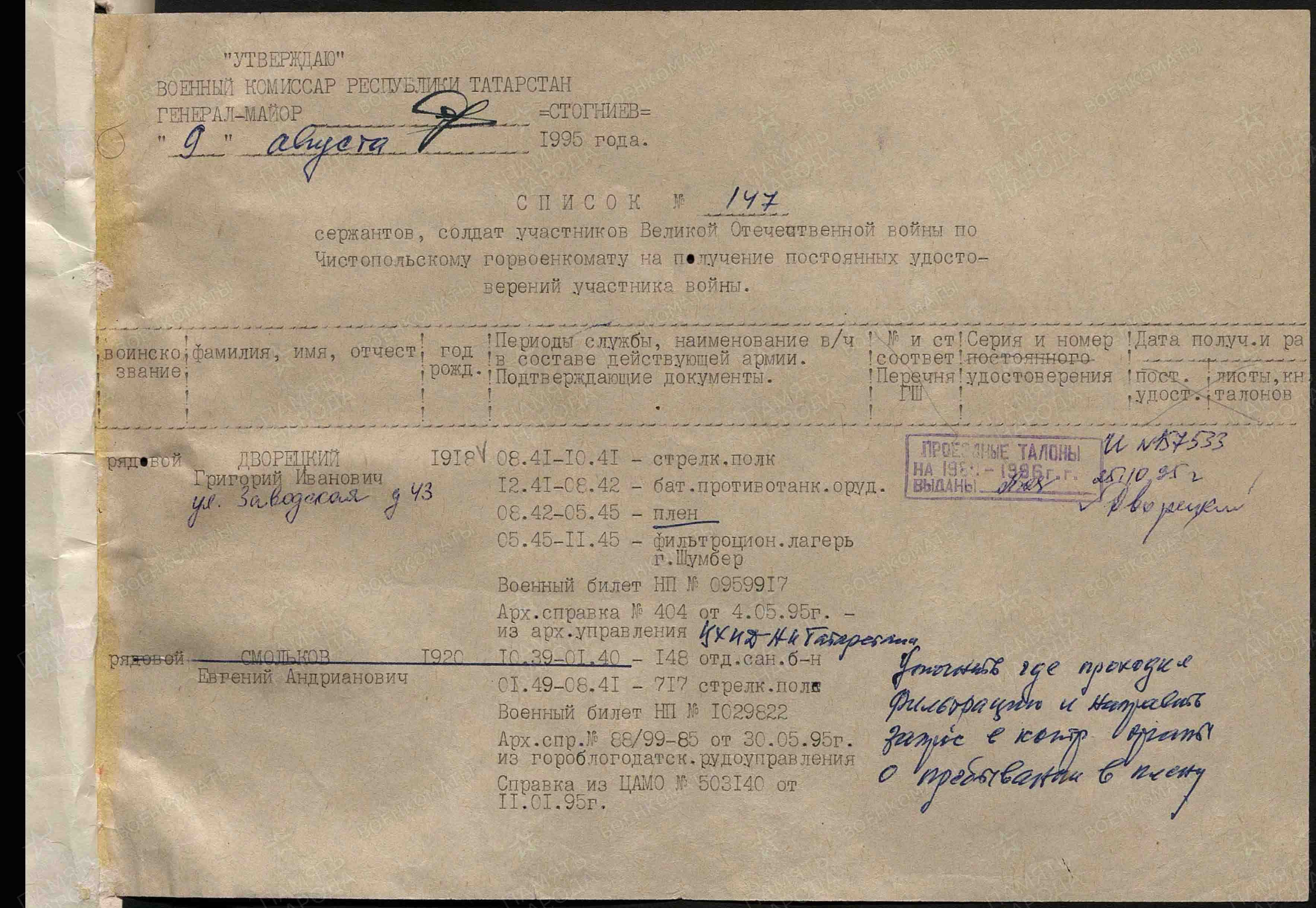 ДВОРЕЦКИЙ Григорий Иванович, 1918, с. Сахаровка. С сент. 1938 по дек. 1940 проходил срочную службу. Мобилизован 28 авг. 1941 Сталинским РВК г. Казань. Красноармеец, орудийный номер противотанковой батареи 122 отд. СБр 48 А Брянского фронта. В авг. 1942, в боях на территории Курской обл., попал в плен. Содержался в лагерях военнопленных в г. Щигры (Курская обл.), г. Нойс, г. Фрайбург (Германия). Освобождён в мае 1945. До нояб. 1945 проходил спецпроверку в фильтрационном лагере в г. Шумперк, Чехословакия. Уволен в запас 10 ноя. 1945. Работал слесарем на обувной фабрике.