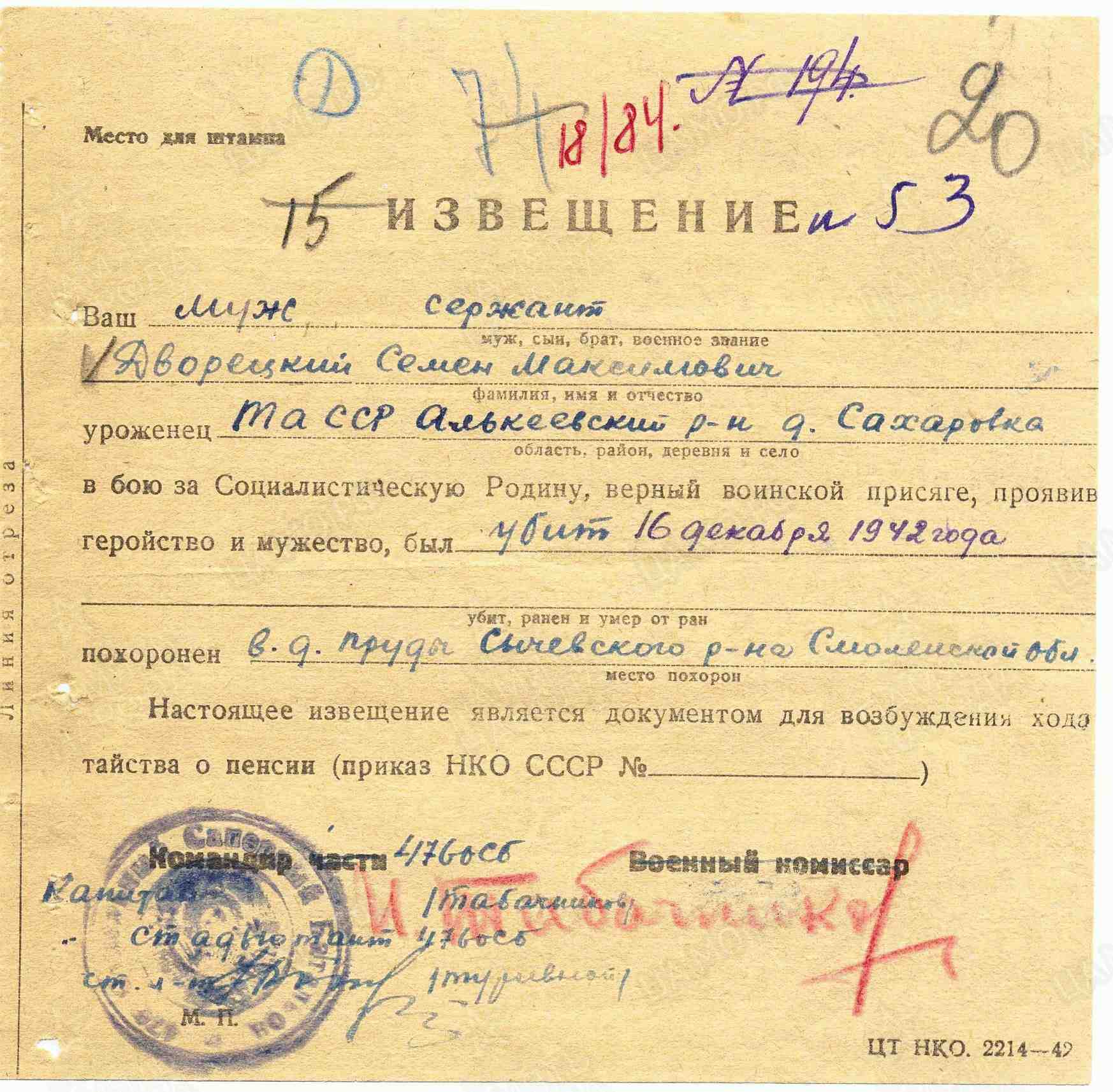 ДВОРЕЦКИЙ Семён Максимович, 1906, с. Сахаровка. Мобилизован 18 июля 1941 Чистопольским РВК. В боях с нояб. 1941. Участник обороны Москвы. Красноармеец/ сержант, сапёр 476 отд. сапёрного батальона 354 СД 16 А/ 5 А/ 20 А/ 31 А Западного фронта. Награждён медалью «За отвагу». Погиб 2 дек. 1942, д. Козловка/ д. Пруды, Сычёвский р-н, Смоленская обл. Увековечен на братском захоронении в д. Аристово.