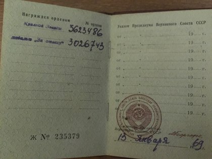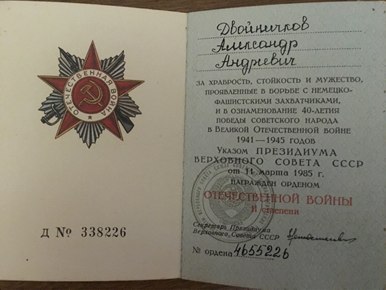 Выписка из приказа о награждении .Приказ 75 гвардейской стрелковой Бахмачской дважды Краснознаменной ордена Суворова II-й степени дивизии №122\н. Наградной лист №311 от 17.04.1945г. при форсировании р.Одер тов.Двойничков А.А. доставил боеприпасы под сильным обстрелом противника на левый берег р.Одер и в тот же день вывез пушку на прямую наводку. За проявленное мужество и отвагу наградить тов . Двойничкова А.А. орденом Красной Звезды.