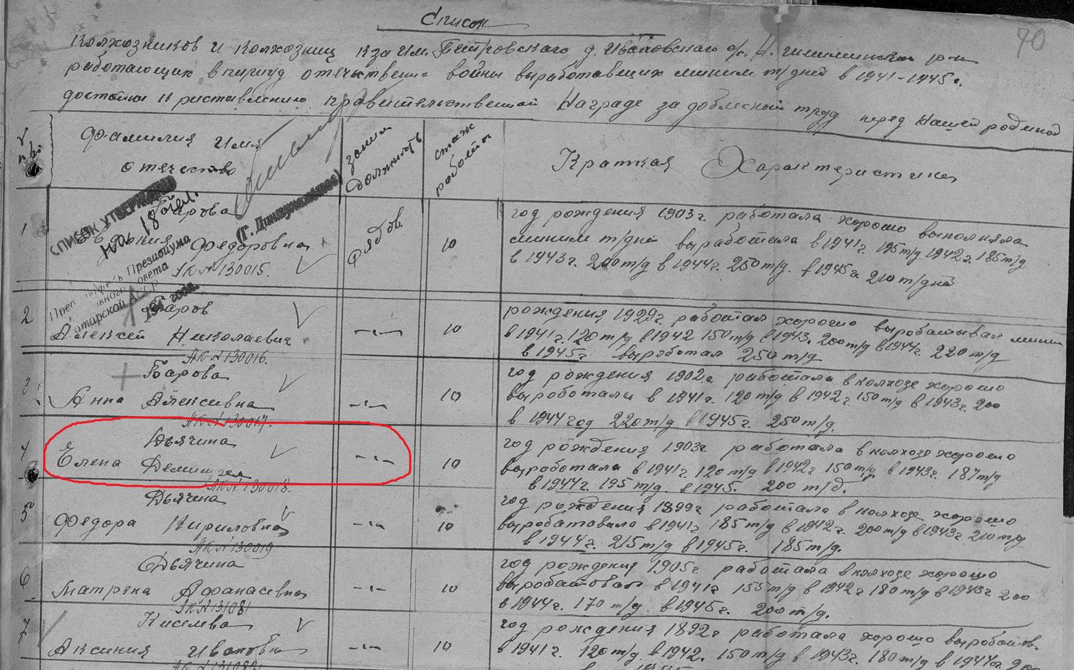 Дьячина Елена Дмитриевна родилась в 1902 году в д.Ивановка Мензелинский район. Место жительства: д.Дальняя Ивановка Ново-Шешминский район ТАССР (ныне Альметьевский район РТ). В годы Великой Отечественной войны работала в колхозе им.Петровского рядовой колхозницей. Награждена медалью "За доблестный труд в Великой Отечественной войне 1941–1945 гг." (Акт от 28 апреля 1947 г, фонд 3610, опись 2, дело № 325, лист 70, № 130018). Выбыла в с.Новошешминск в 1951г. Умерла в 1986 году, похоронена на сельском кладбище с.Новошешминск.