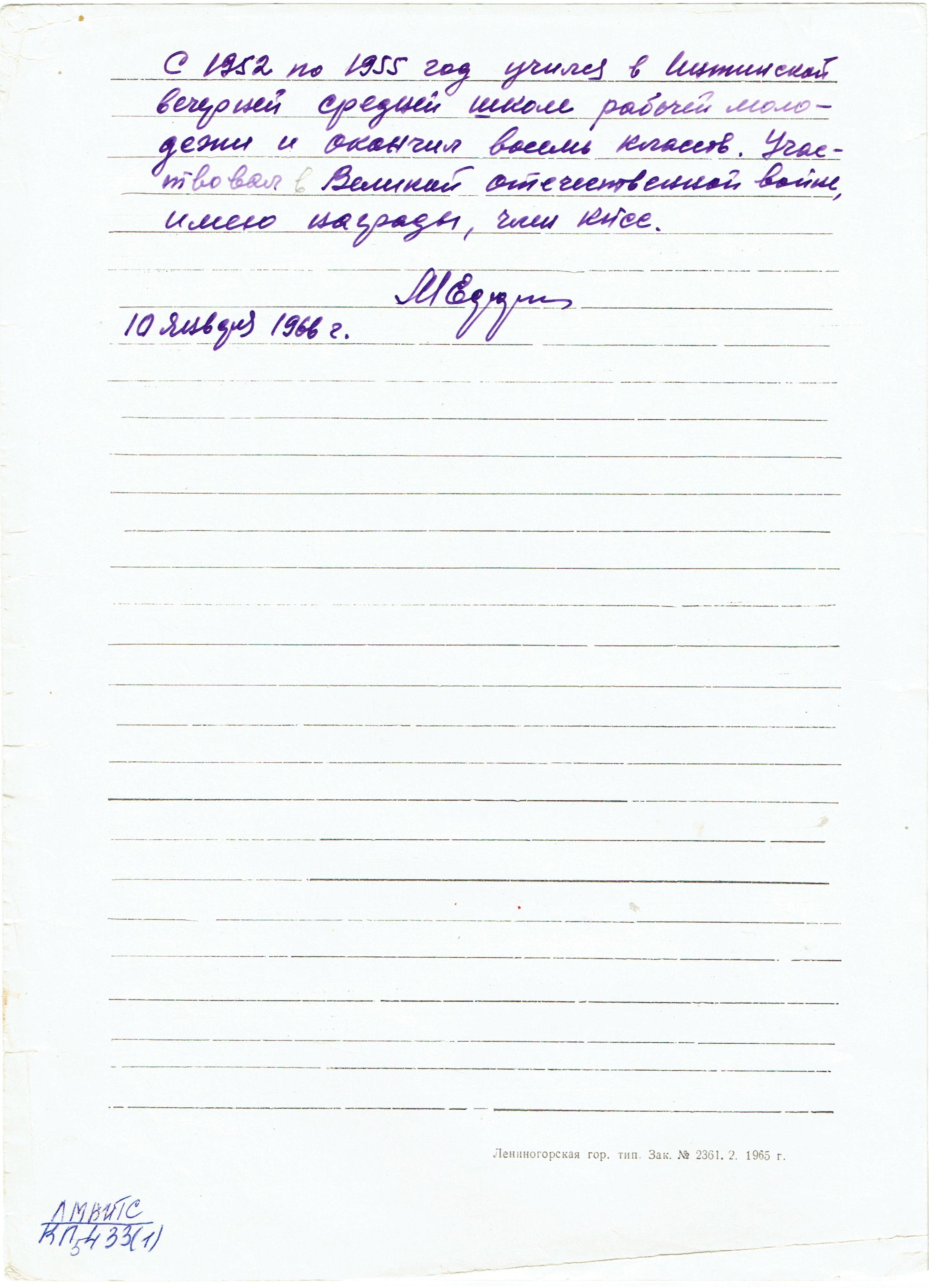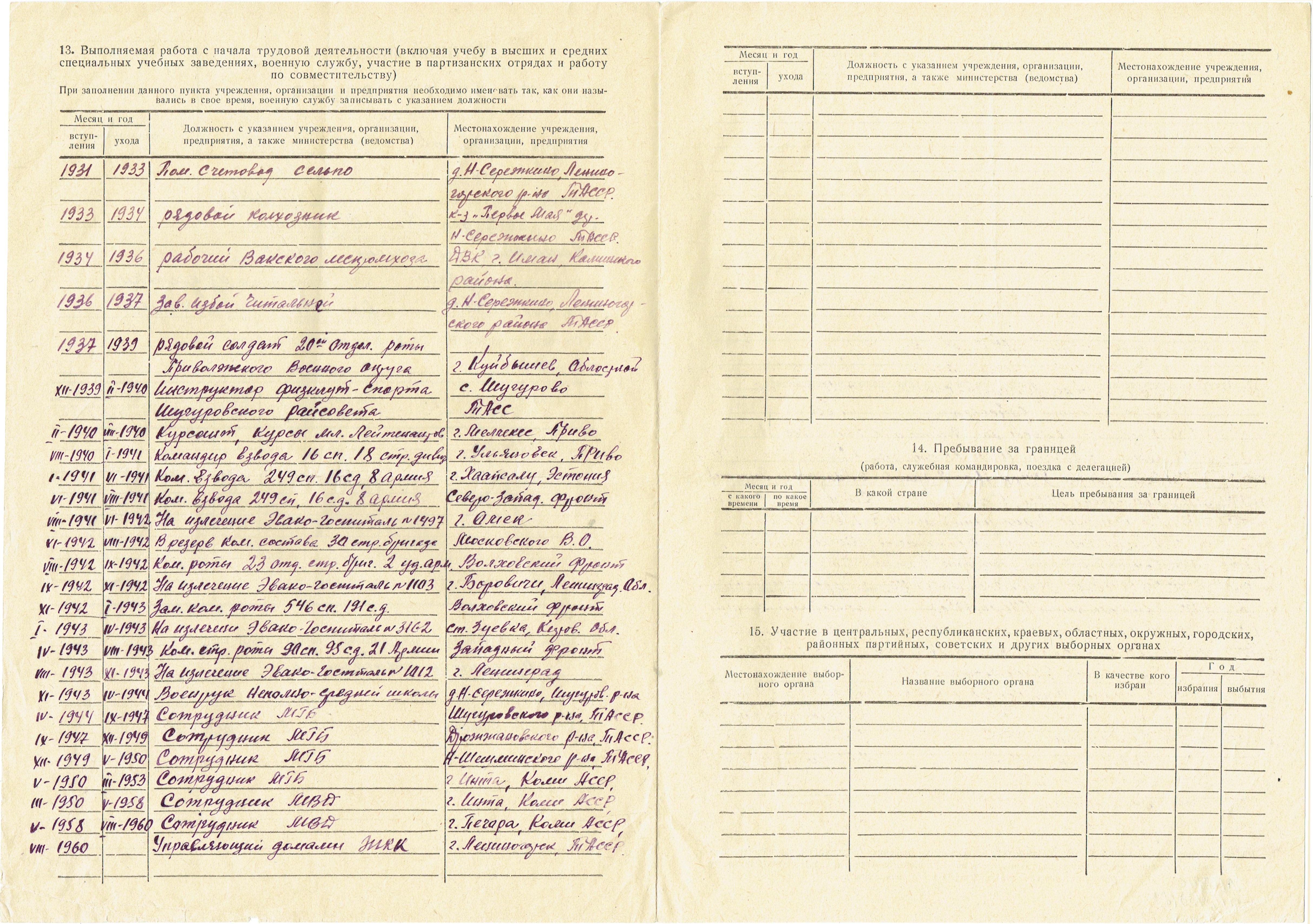 Призван 15.11.1937г. Шугуровским РВК, Татарская АССР, Воинское звание мл. лейтенант; лейтенант; ст. лейтенант. Воинская часть 546 стрелковый полк 191 стрелковой дивизии 23 стрелковая бригада; 20 отдельная стрелковая рота отдела контрразведки "СМЕРШ" 4 армии; 90 стрелковый полк 95 стрелковой дивизии; 16 запасной стрелковый полк.