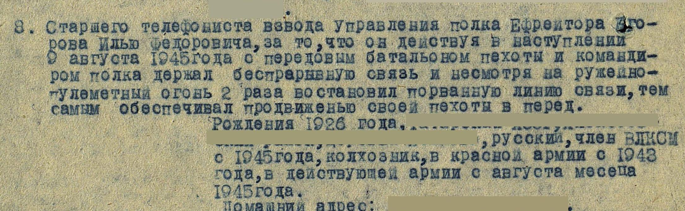 ЕГОРОВ Илья Фёдорович, 1926, д. Языково. Мобилизован Алексеевским РВК в 1943 г. Ефрейтор, ком. отд., телефонист взвода управления 464 мин. полка 53 отд. мин. бр. РГК. Награждён медалями «За отвагу», «За победу над Японией», орденом Отеч. войны 2 ст. (1985).
