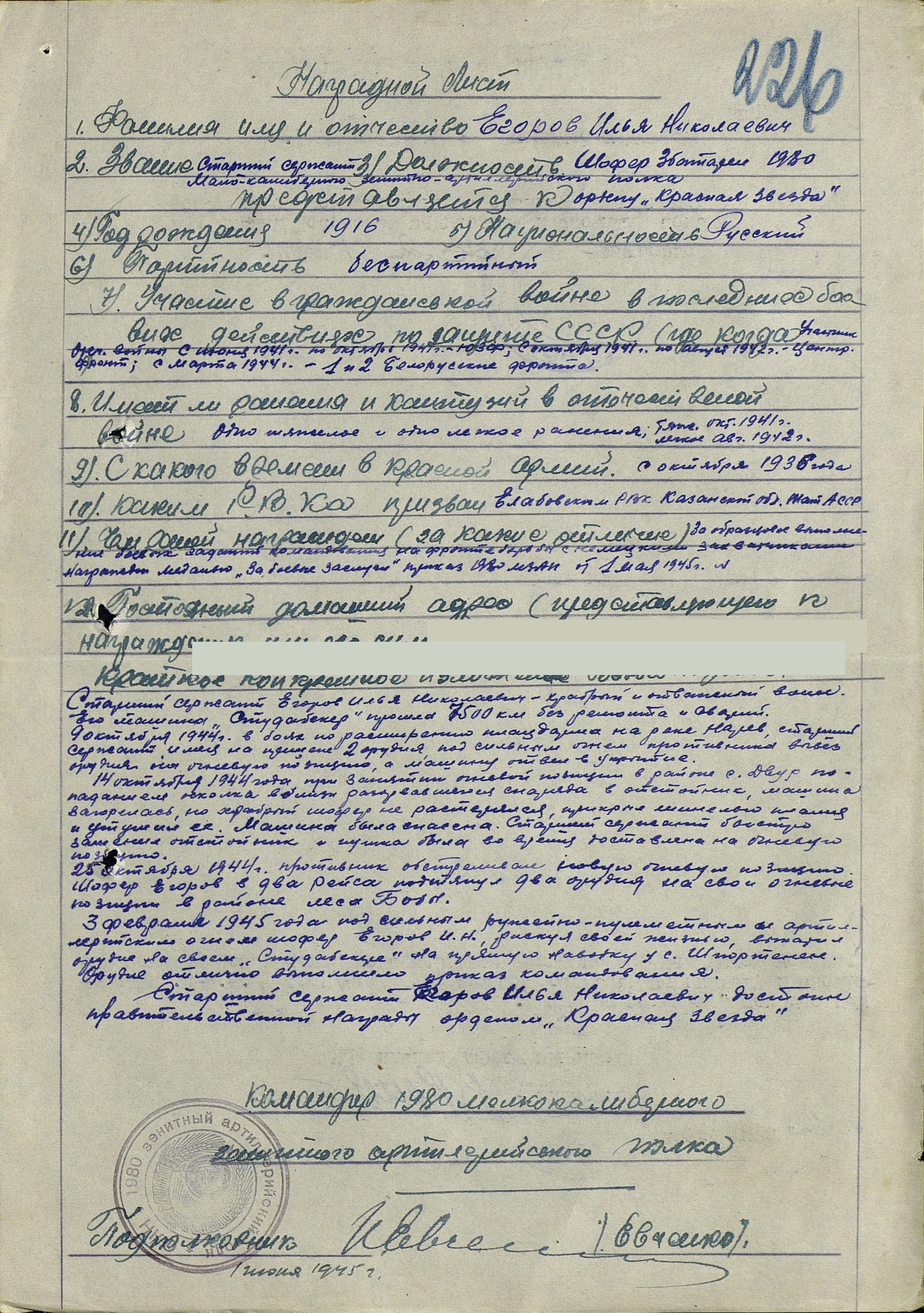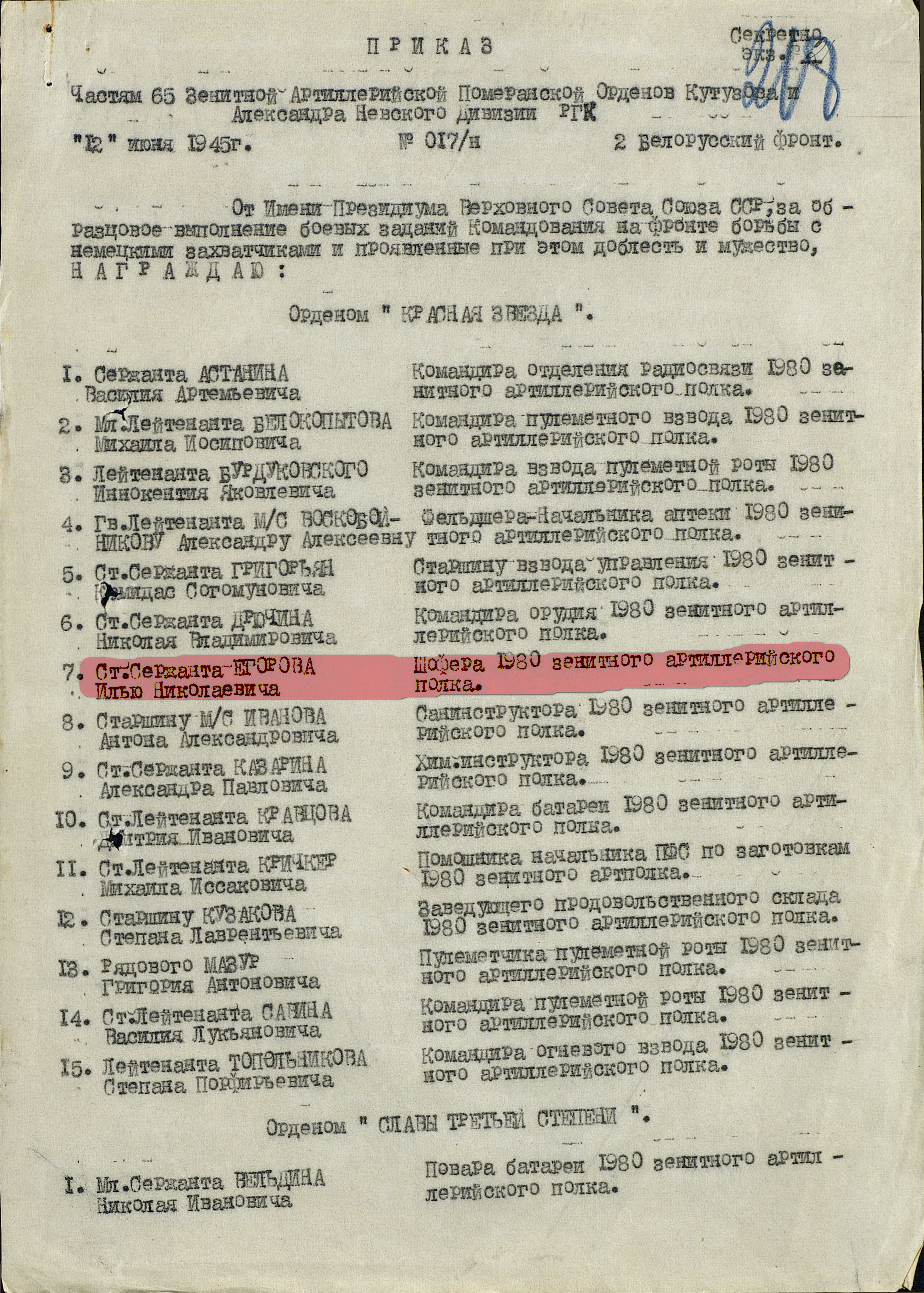 - старшего сержанта – Егорова Илью Николаевича - шофера 1980 зенитного артиллерийского полка.