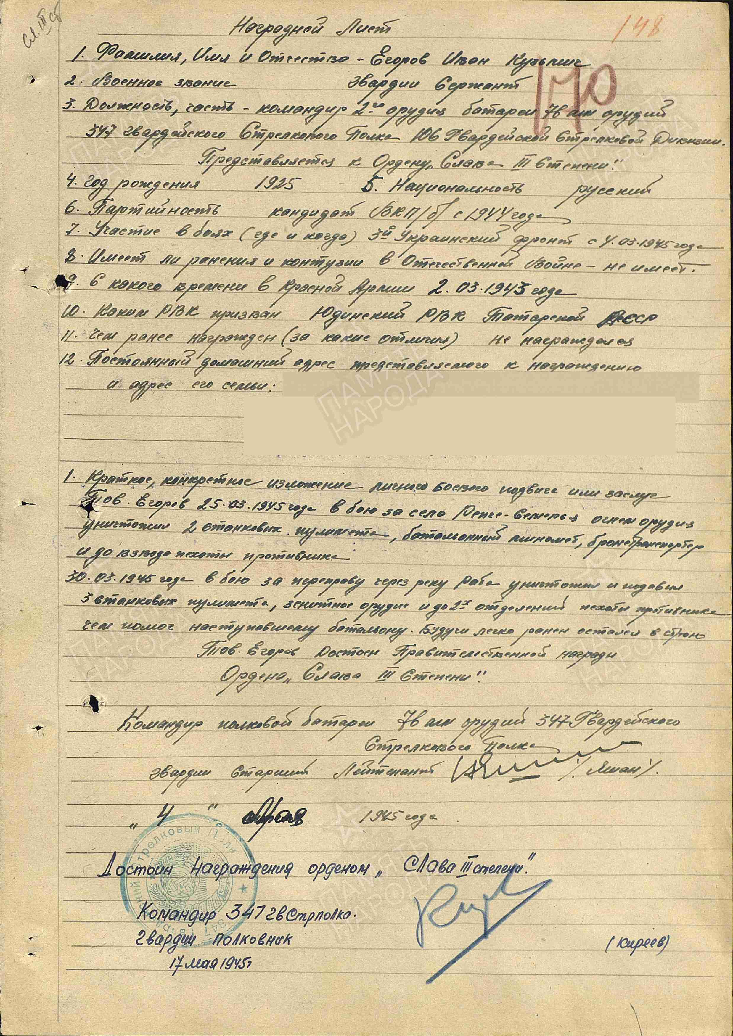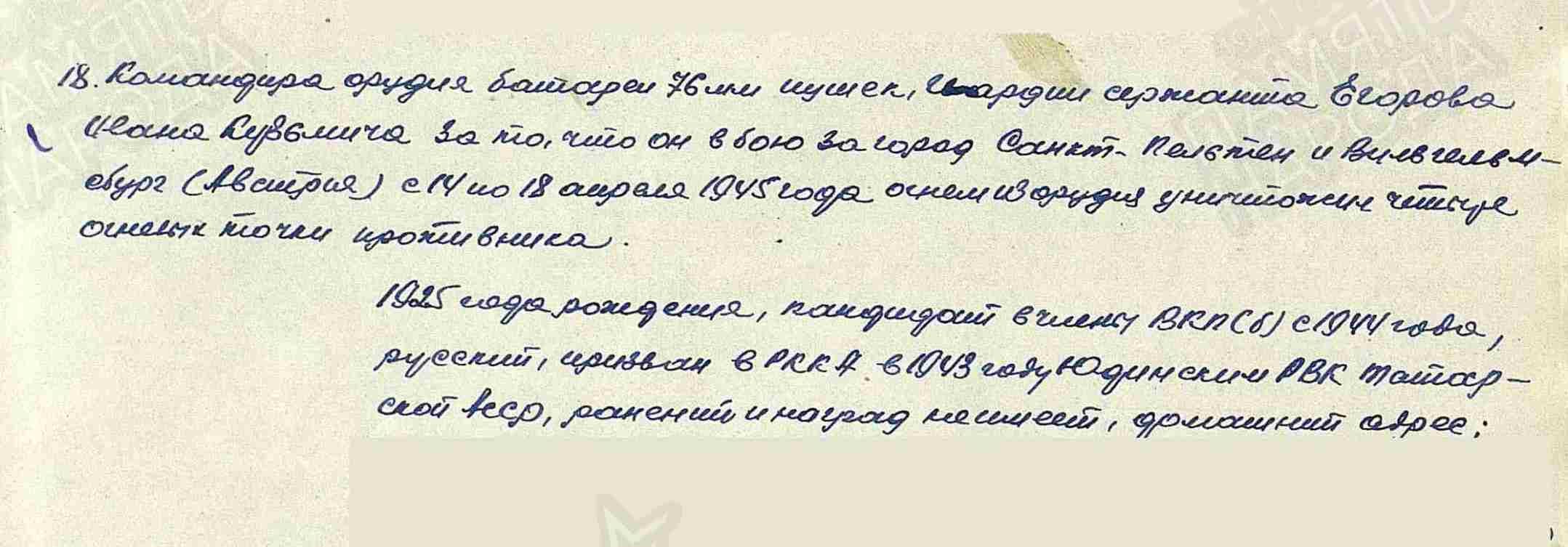 ЕГОРОВ Иван Кузьмич, 1925, с. Берёзовая Грива. Мобилизован Юдинским РВК 2 марта 1943. Член ВЛКСМ/канд. ВКП(б). На передовой с 4 марта 1945. Гв. сержант, ком. орудия полковой батареи 76 мм пушек 347 гв. СП 106 гв. СД 38 гв. СК 9 гв. А 2 и 3 УкрФ. 25 марта 1945, в бою за с. Репче-Семерья, огнём орудия уничтожил два станковых пулемёта, 81 мм миномёт, бронетранспортёр и до взвода пехоты врага. 30 марта 1945, при переправе ч/з р. Раба, уничтожил и подавил три станк. пулемёта, зенитное орудие и до двух отделений пехоты противника. Был легко ранен, но остался в стою. В бою за г. Санкт-Пельтен/Вильгельмсбург, Австрия, с 14 по 18 апр. 1945, огнём орудия уничтожил четыре огневые точки противника. Награждён медалью «За боевые заслуги», орденом Славы 3 ст.