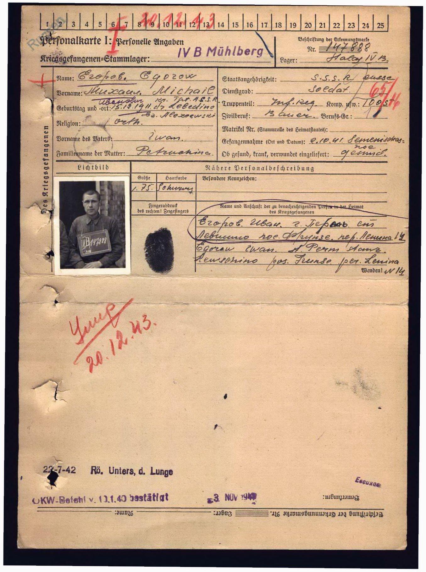 ЕГОРОВ Михаил Иванович (1911 г.р., с. Лебедино). Мобилизован из г. Пермь (Молотов). Красноармеец, стрелок пехоты. Попал в плен 2.10.1941г. Умер 20.12.1943г. в лагере IVB Мюльберг/Нойбурксдорф, Германия.