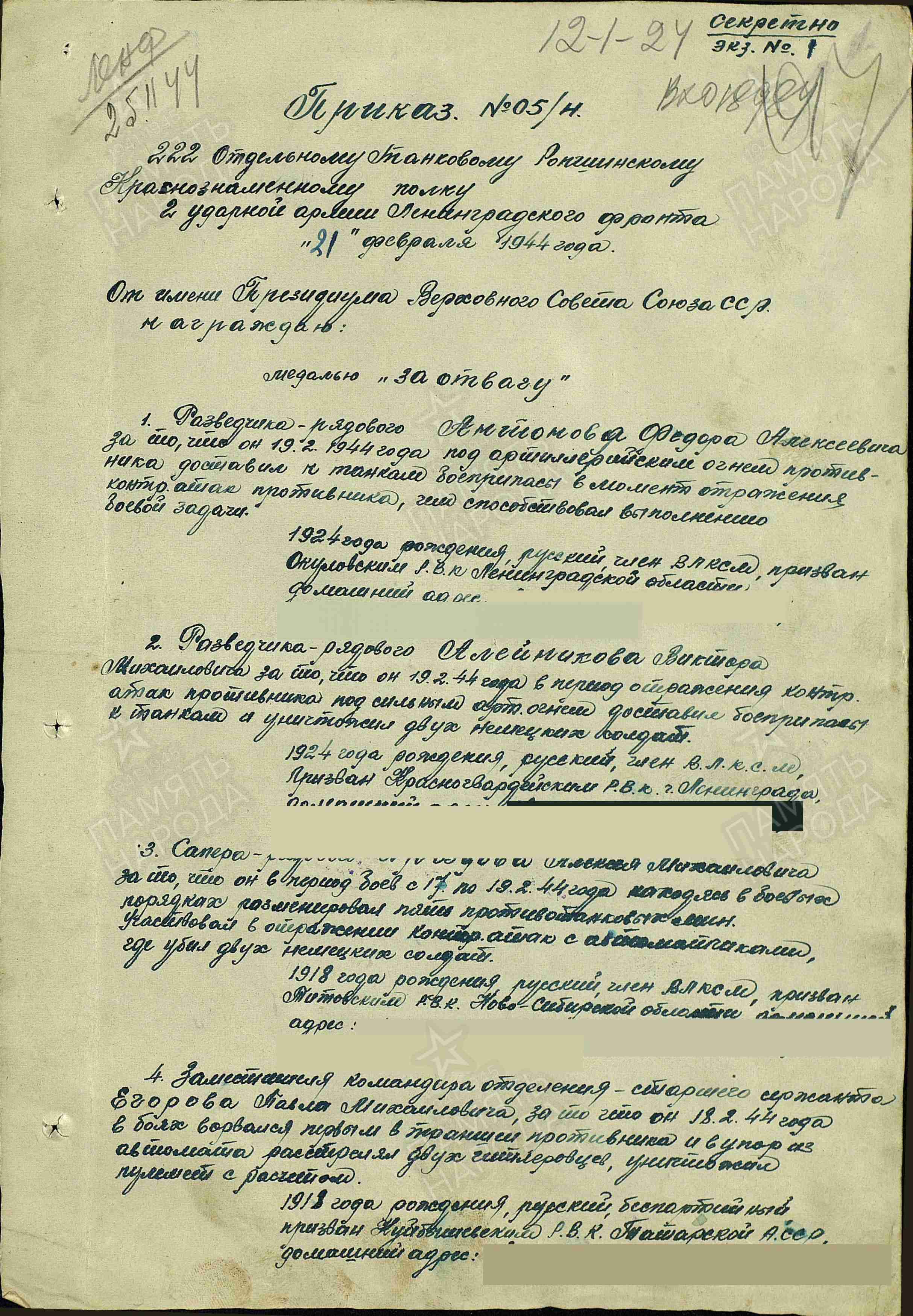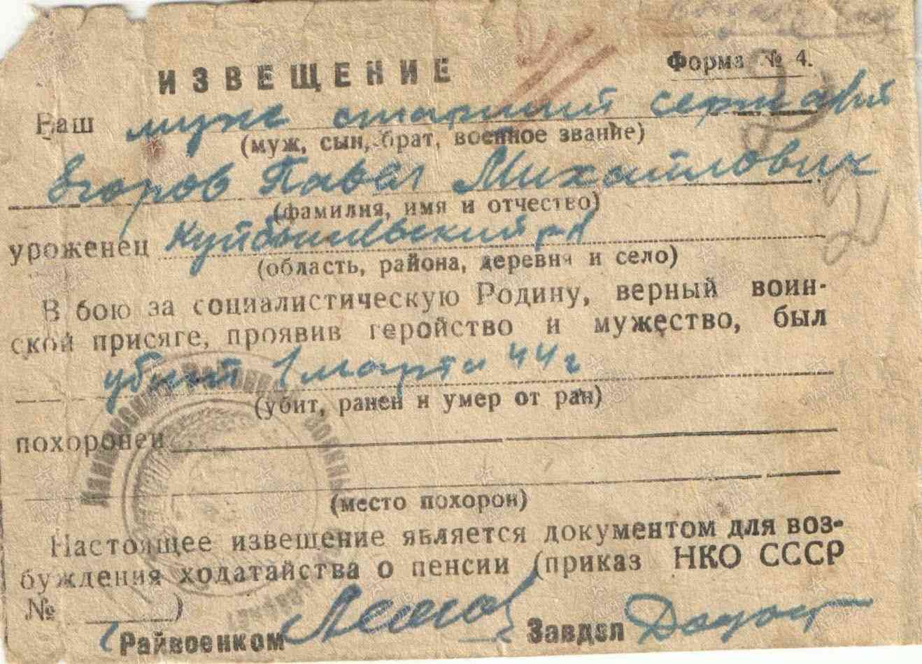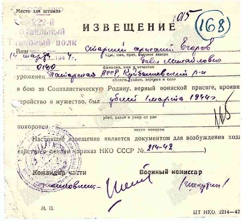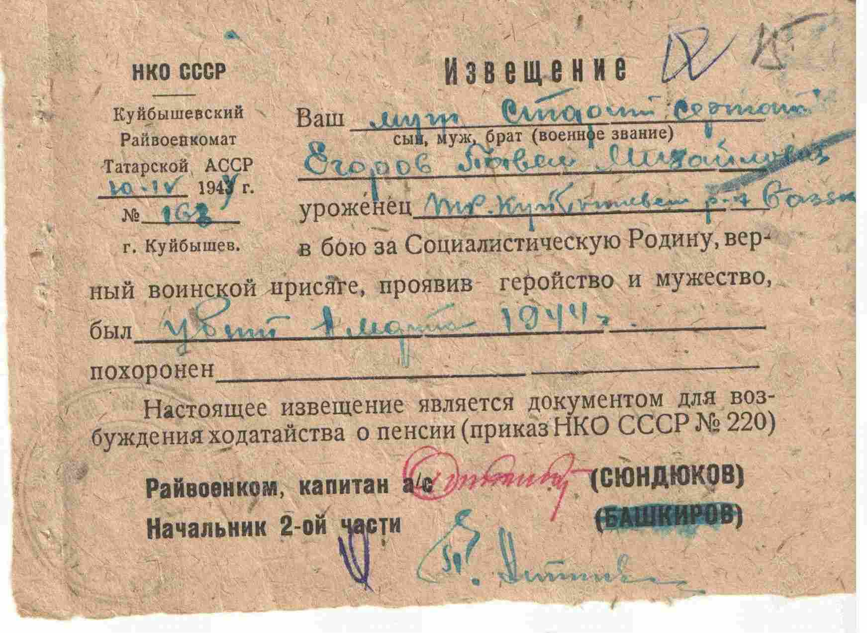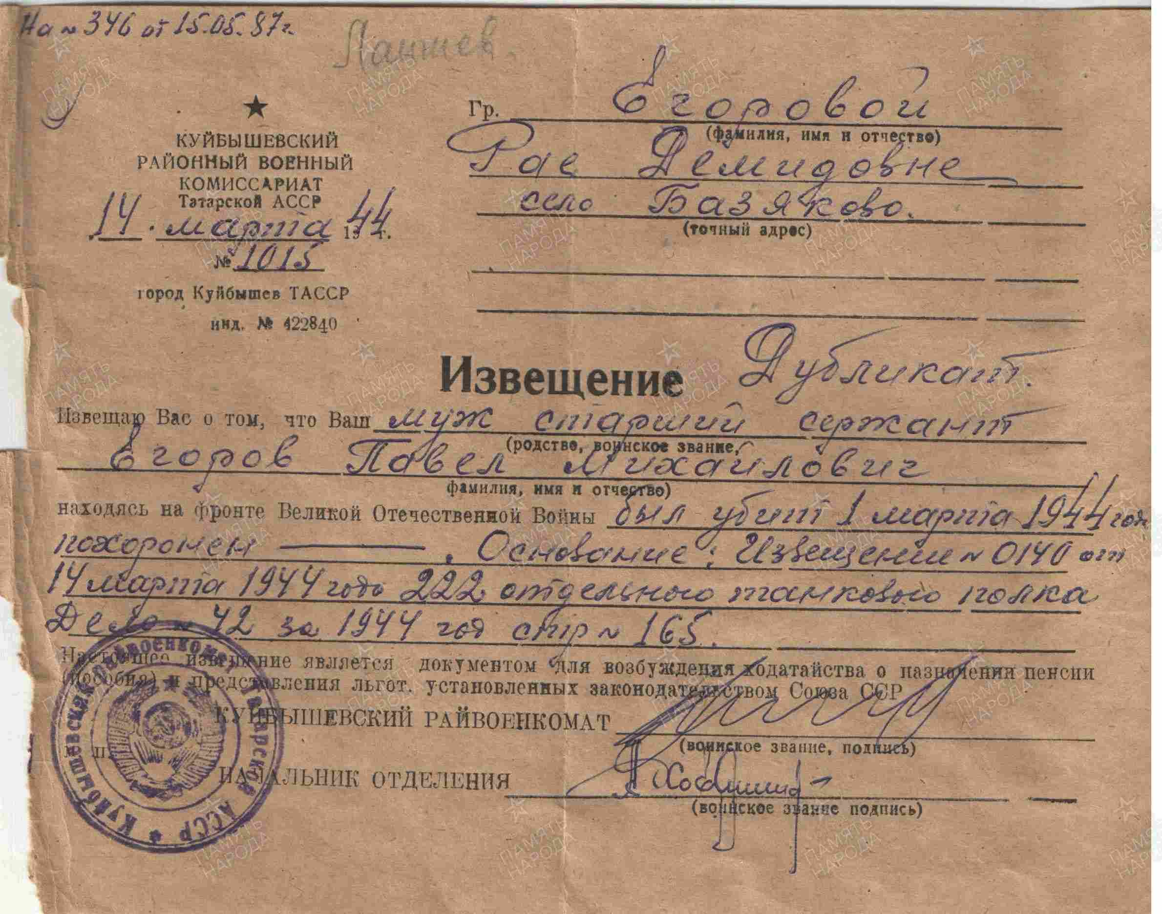 ЕГОРОВ Павел Михайлович, 1918, с. Базяково. Мобилизован 23 авг. 1941 Куйбышевским РВК. Красноармеец/ ст. сержант. Воевал в составе 284 СП 86 СД 67 А Ленинградского фронта, ком. отделения роты автоматчиков 222 отд. ТБр (ТП) 23 А/ 55 А/ 2 УдА ЛенФ. Награждён двумя медалями «За отвагу», медалью «За оборону Ленинграда». Убит 1 марта 1944, ЭстССР, Нарвский р-н (Вируский уезд), д. Ладиска (д. Кяреконна). Увековечен в п. Синимяэ.