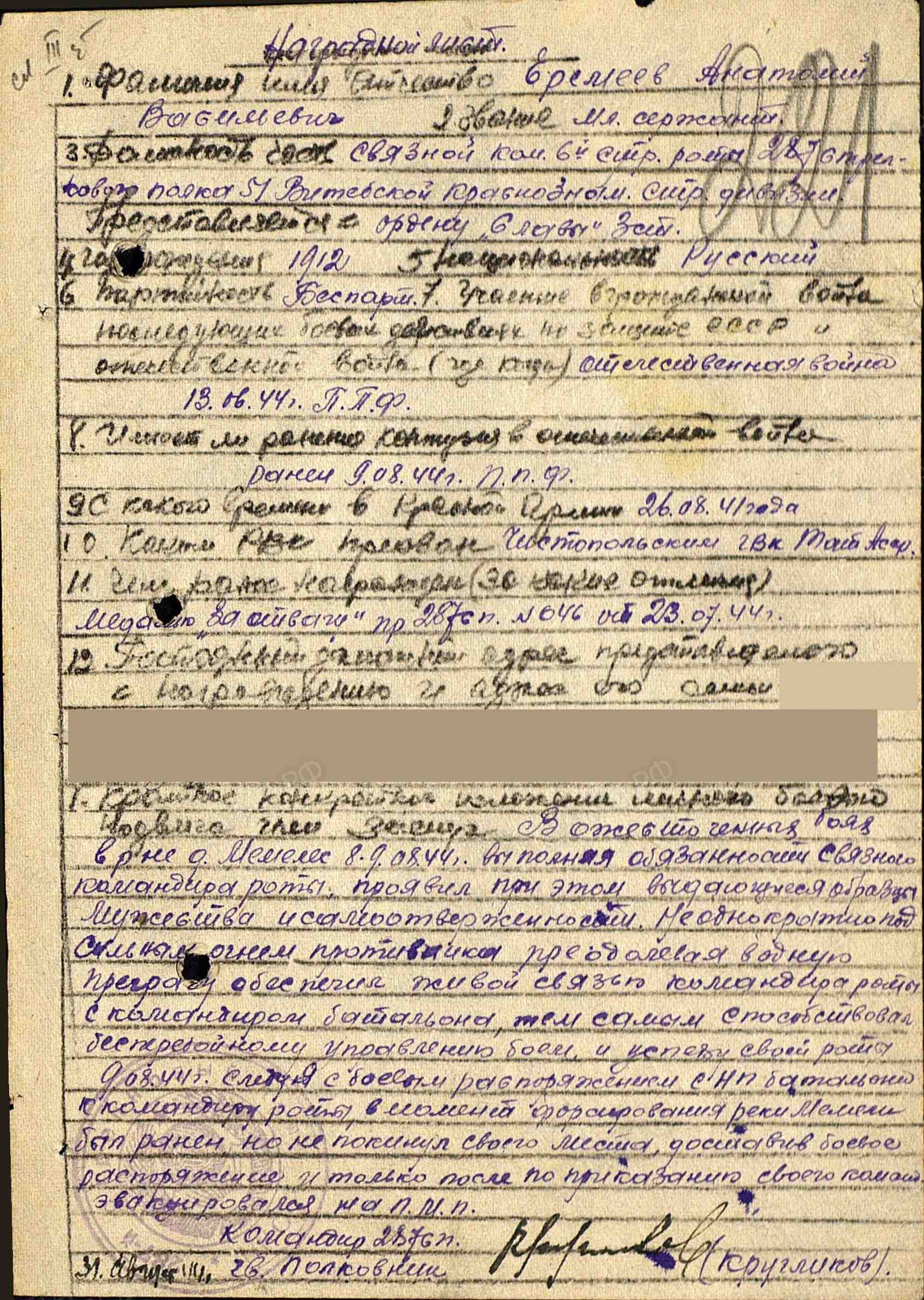 Анатолий Васильевич Еремеев родился в 1912 г. Проживал в г.Чистополе, ТАССР. 26 августа 1941 г. призван в ряды Красной Армии Чистопольским военным комиссариатом. Служил в звании младшего сержанта, в должности связного командира 6-й стр.роты 2876 Стрелкового полка 54 Витебской Краснознаменной стр.дивизии. 9 августа 1944 г. в бою получил ранение.