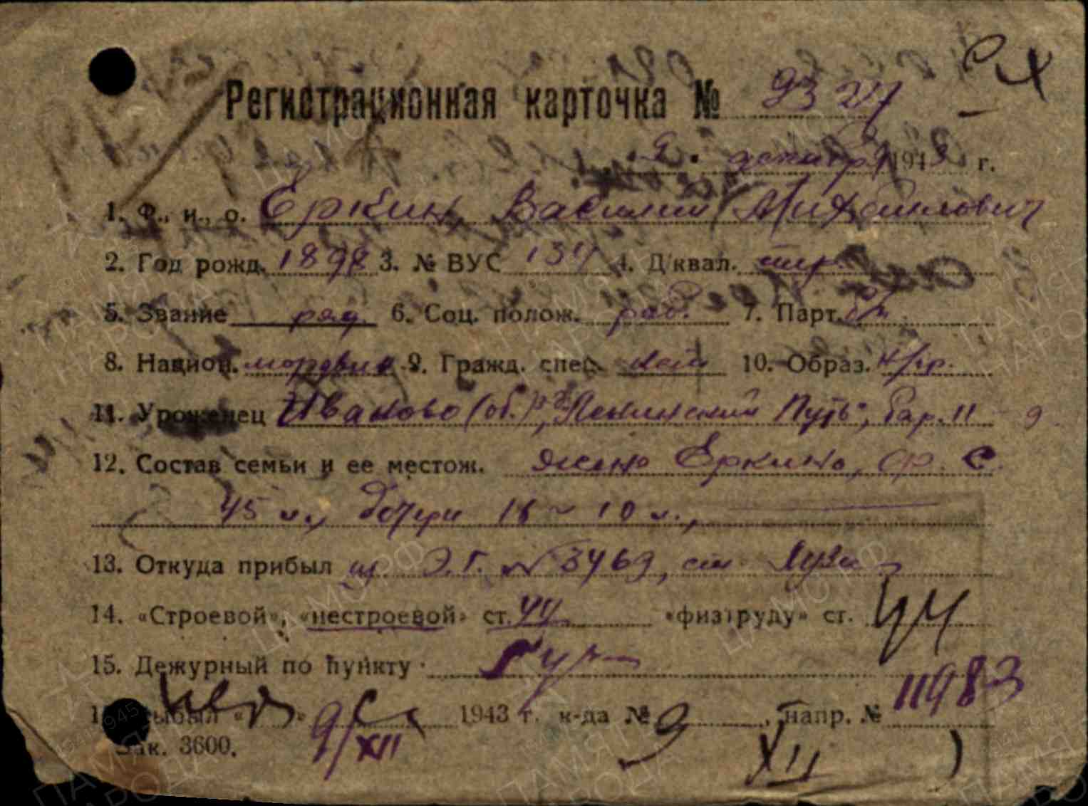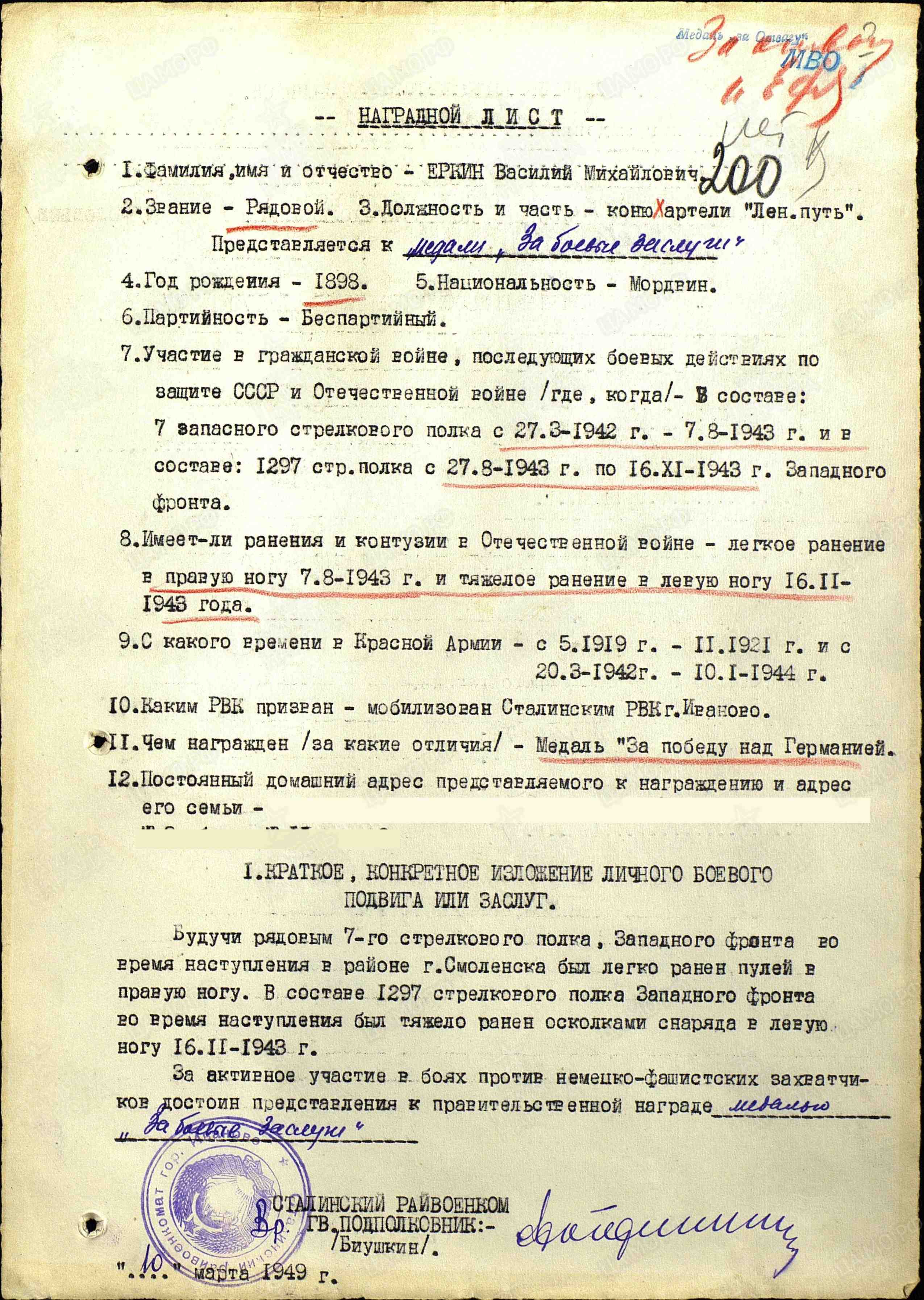 ЕРКИН Василий Михайлович, 1898, д. Лягушкино. Участник Гражданской войны в 1919-1921. До призыва в армию и после демобилизации работал конюхом в артели «Ленинский путь», Ивановская обл. Мобилизован 20 марта 1942 Сталинским РВК г. Иваново. Воевал на Западном фронте в составе 33 А/ 49 А. Красноармеец, стрелок 1297 СП 160 СД. Участник освобождения Смоленщины и Белоруссии. Легко ранен в пр. ногу 7 авг. 1943, тяжело ранен в лев. ногу 16 нояб. 1943. Проходил лечение в ЭГ 2956, г. Малоярославец, ЭГ 1381, ЭГ 3584, г. Калуга, ЭГ 3469, ст. Луза, Кировская обл. С 9 дек. 1943 ВВК установлено ограничение движения коленного сустава. Демобилизован по ранению 10 янв. 1944. По ходатайству РВК награждён медалью «За отвагу» (1951).