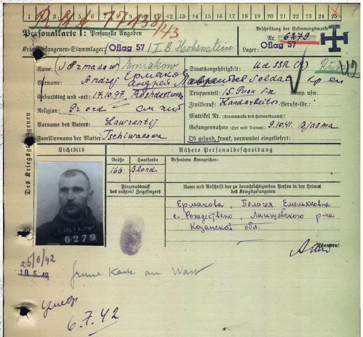 Родился в 1897 г. в с. Рождествено Лаишевского уезда. Мобилизован Лаишевским РВК. Красноармеец, 15 отд. саперный батальон. Попал в плен 9 октября 1941 г. под Вязьмой. Содержался в лагере военнопленных офлаг № 57 IB Хоенштайн. Умер 6 июля 1942 г. Родственники: Ермакова Пелагея Емельяновна, с. Рождествено, Лаишевский р-н ТатАССР.