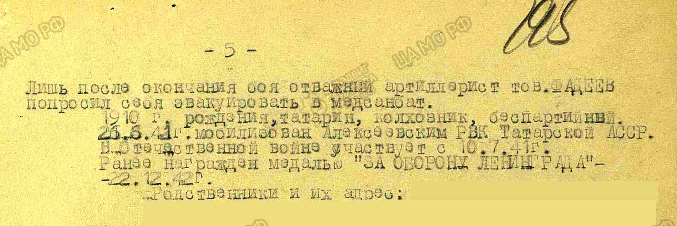 ФАДЕЕВ Полладий Александрович, 1910, с. Крещёный Баран. На войну мобилизован Алексеевским РВК 26 июня 1941г. Уже 10 июля находился в действующей армии на Ленинградском фронте. Служил 14 гв. (бывший 47 кавалерийский артполк) артиллерийском полку. Гв. красноармеец, орудийный номер 76мм пушки. Отличился в бою 2 сентября 1942г, где оставшись один из расчёта орудия, будучи раненым, продолжал огонь, отбивая атаки противника. Награждён медалью "За отвагу" (1945, в наградном документе указано имя ПАЛУЛАДИЙ), "За оборону Ленинграда" (1943), орденом Отечественной войны 2 ст. (1985). После демобилизации в 1945г. трудился разнорабочим в совхозе "Им. Бутлерова". Скончался в 2002г., похоронен в с. Кр. Баран.