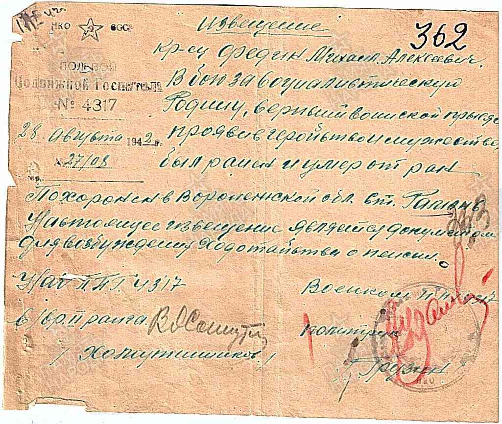 ФЕДИН Михаил Алексеевич, 1903, с. Базяково. Мобилизован 27 авг. 1941 Куйбышевским РВК ТАССР. В 1942 – красноармеец, 383 СП 121 СД 60 А Центрального фронта. В боях за г. Воронеж получил слепое осколочное ранение верхней трети левого бедра. Умер 10 авг. 1942 от осложнения газовой гангрены в ХППГ 4317, ст. Рамонь, п. Бор, Воронежская обл.