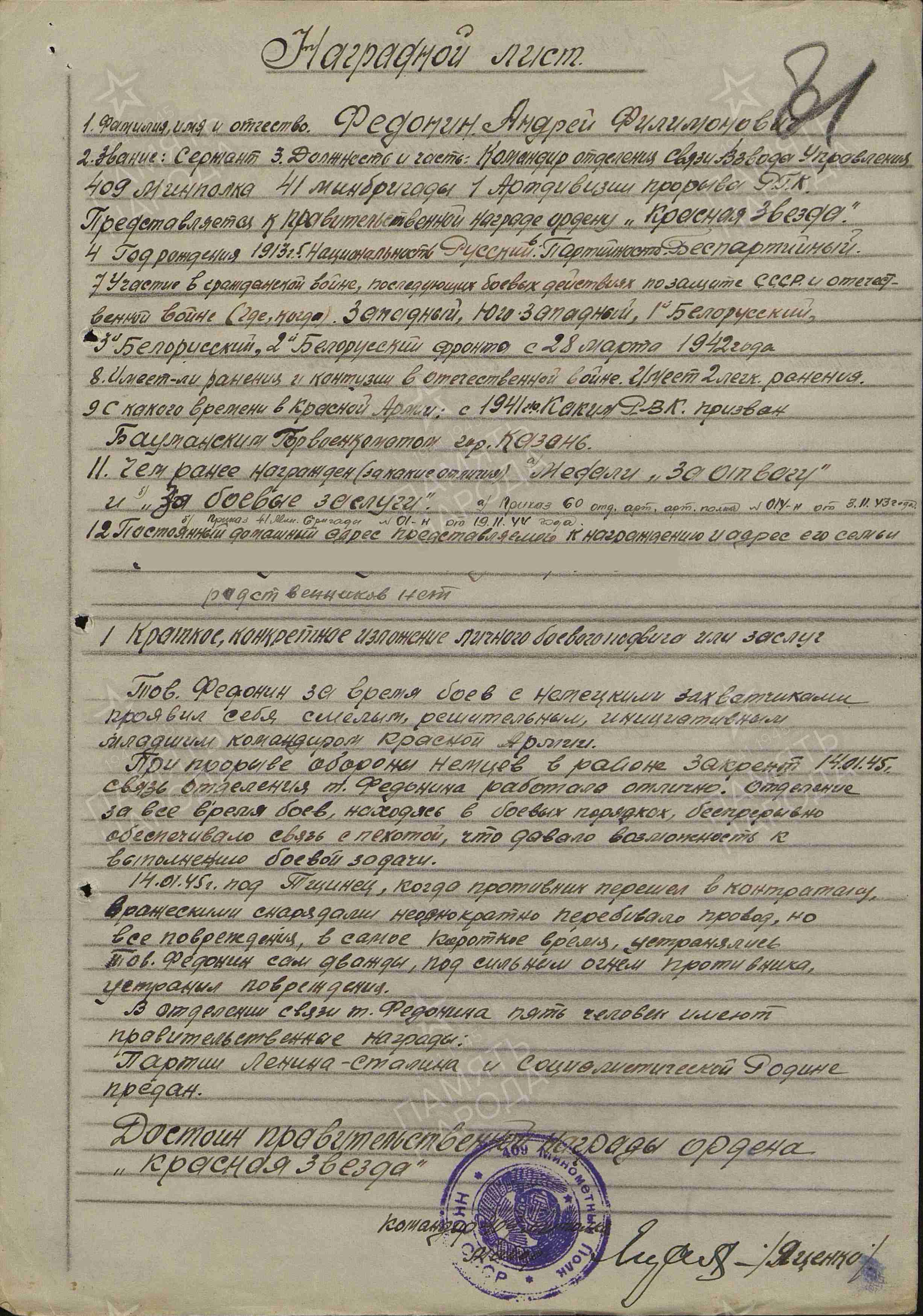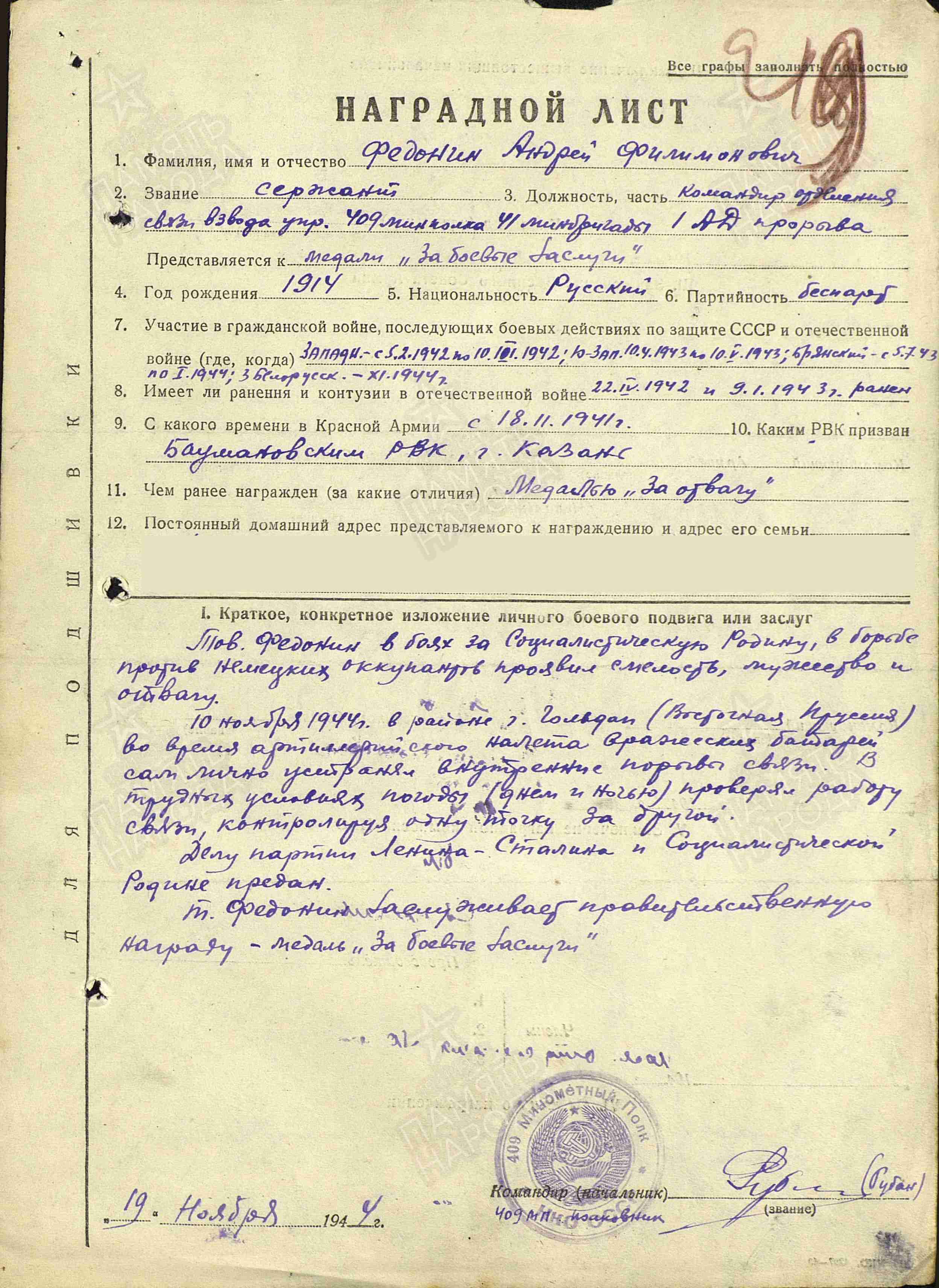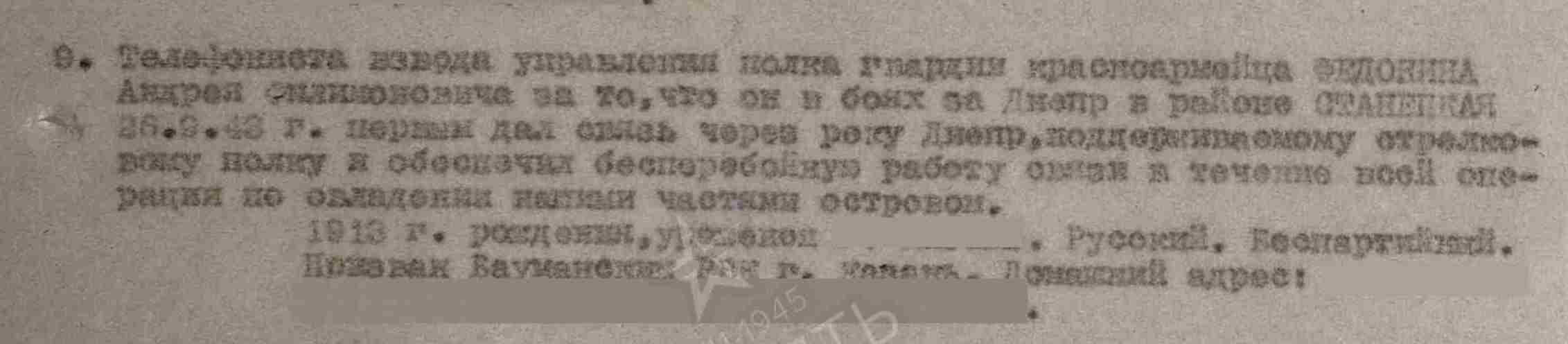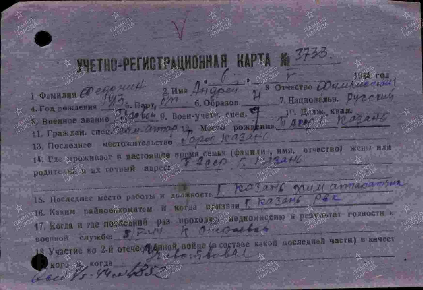 ФЕДОНИН Андрей Филимонович, 1913, д. Ямкино. Мобилизован Бауманским РВК г. Казань 18 нояб. 1941. Воевал на Западном, Юго-Западном, Брянском, 1, 3, 2 Белорусском фронте. Ранен 22 апр. 1942, ранен в правое бедро 9 янв. 1943, был на излечении в ЭГ 3168, ст. Просница, Кировская обл. Гв. красноармеец, телефонист взвода управления 60 гв. корп. АП 9 гв. СК 61 А/ сержант, ком. отделения связи 409 МинП 41 МинБр 1 АртД прорыва РГК. Награждён медалями «За отвагу», «За боевые заслуги», орденом Красной Звезды.