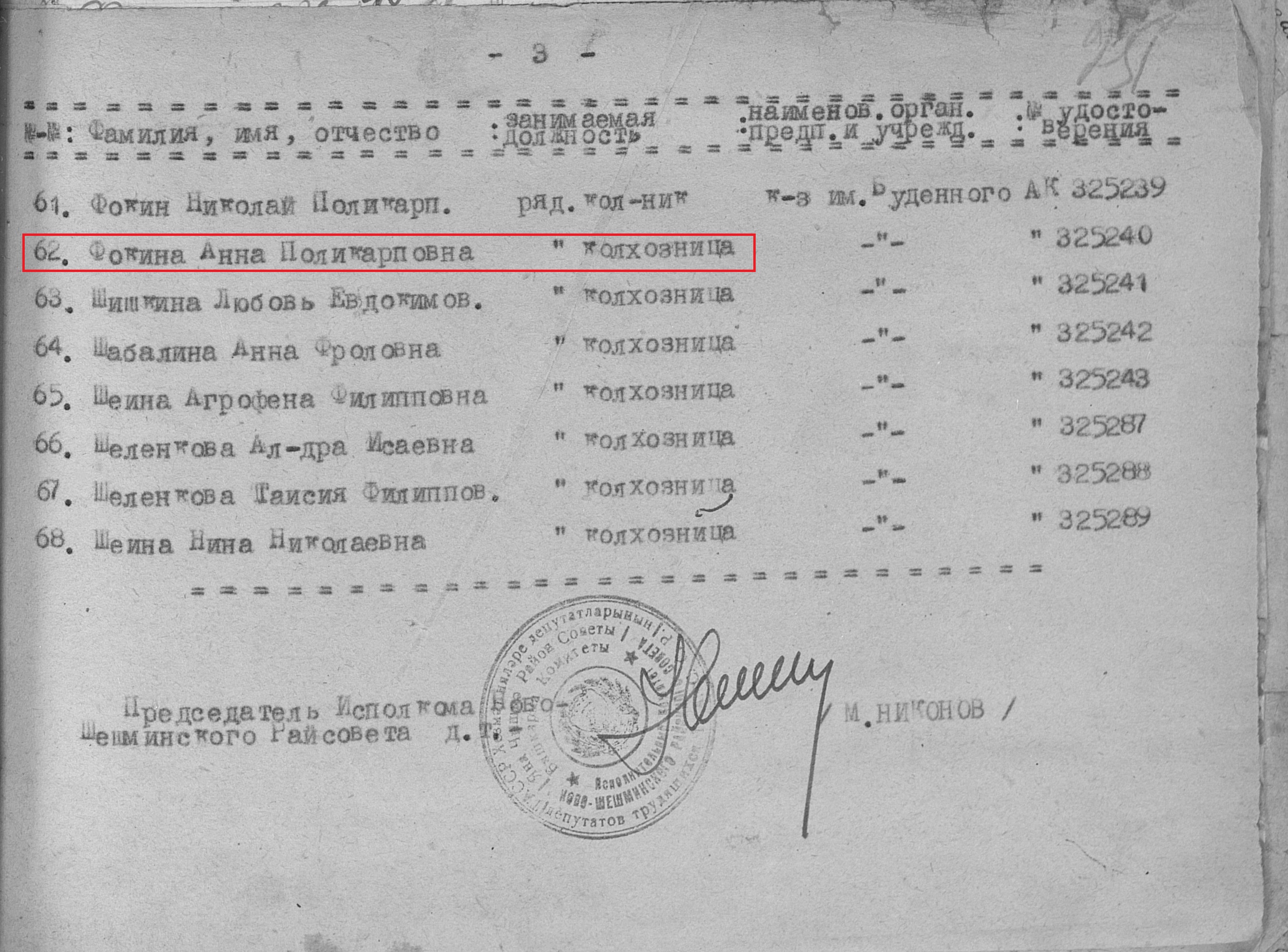 Фокина Анна Поликарповна родилась в 1930 году. Место жительства: д.Дальняя Ивановка Ново-Шешминский район ТАССР (ныне Альметьевский район РТ). В годы Великой Отечественной войны работала в колхозе им.Буденого рядовой колхозницей. Награждена медалью "За доблестный труд в Великой Отечественной войне 1941–1945 гг." (Акт от 20 февраля 1946г., Фонд 3610, опись 2, дело № 470, лист 250, АК № 325240).