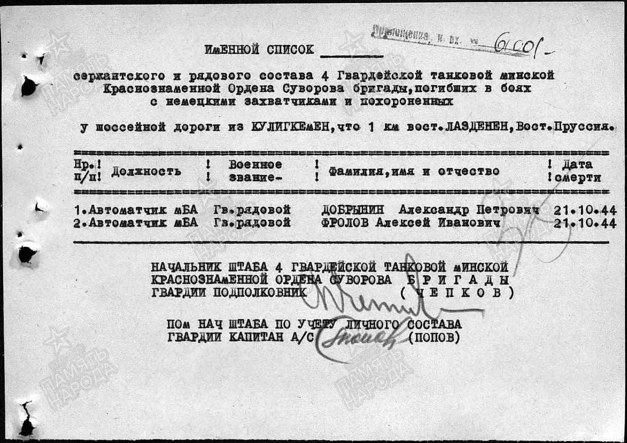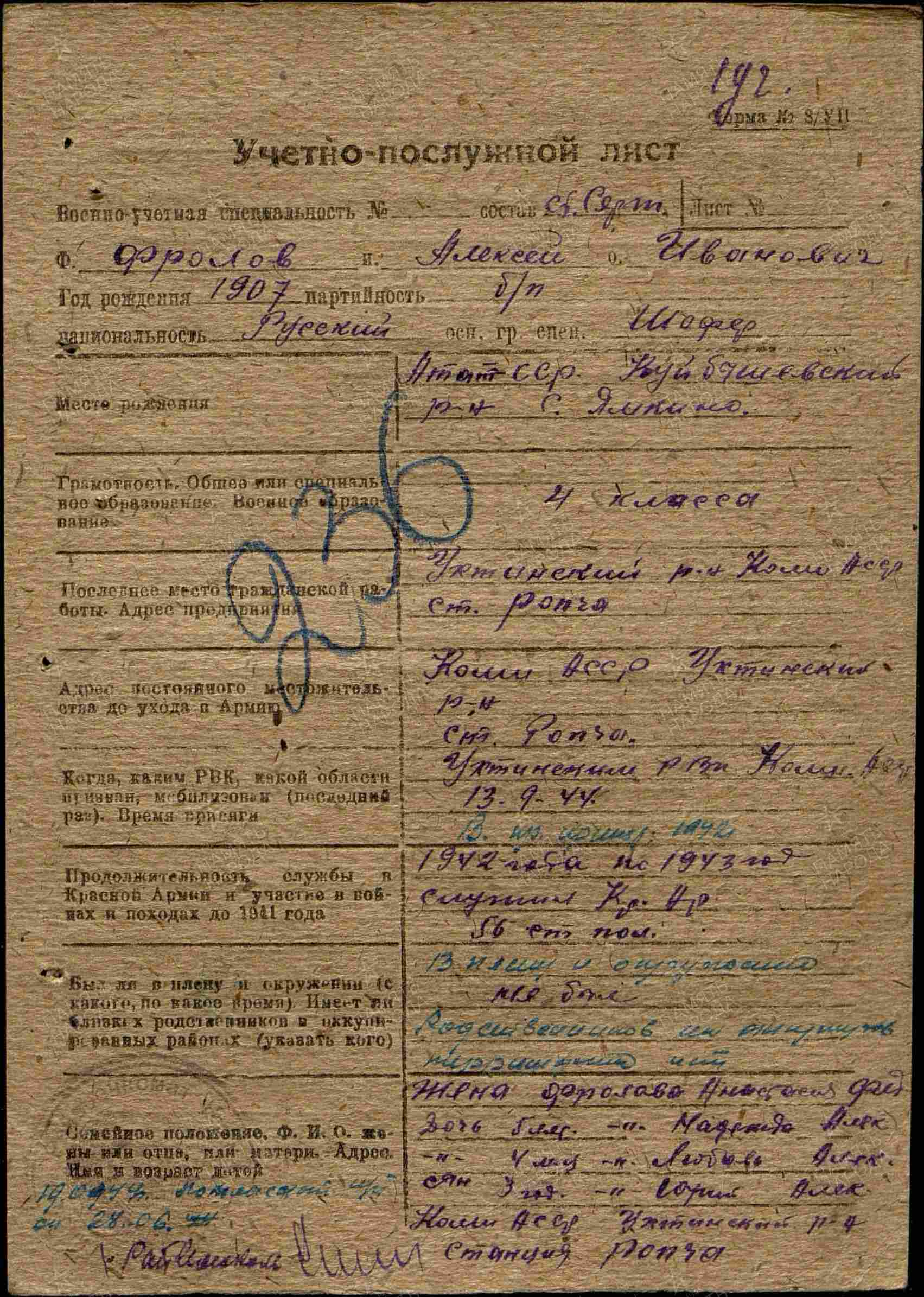 ФРОЛОВ Алексей Иванович, 1907, д. Ямкино. Мобилизован Кожвинским РВК КомиАССР. Ст. сержант, ком. отделения 213 СП 56 СД 55 А Ленинградского фронта. Осуждён военным трибуналом 56 СД 28 окт. 1942 к 10 годам ИТЛ. Повторно мобилизован в 1944 Ухтинским РВК. Гв. красноармеец, автоматчик мотобатальона 4 гв. ТБр 2 гв. ТК 3 Белорусского фронта. Убит 21 окт. 1944, шоссе Кулигкемен – Лазденен, р-н Пилькаллен, окр. Гумбинен, Вост. Пруссия, Германия.