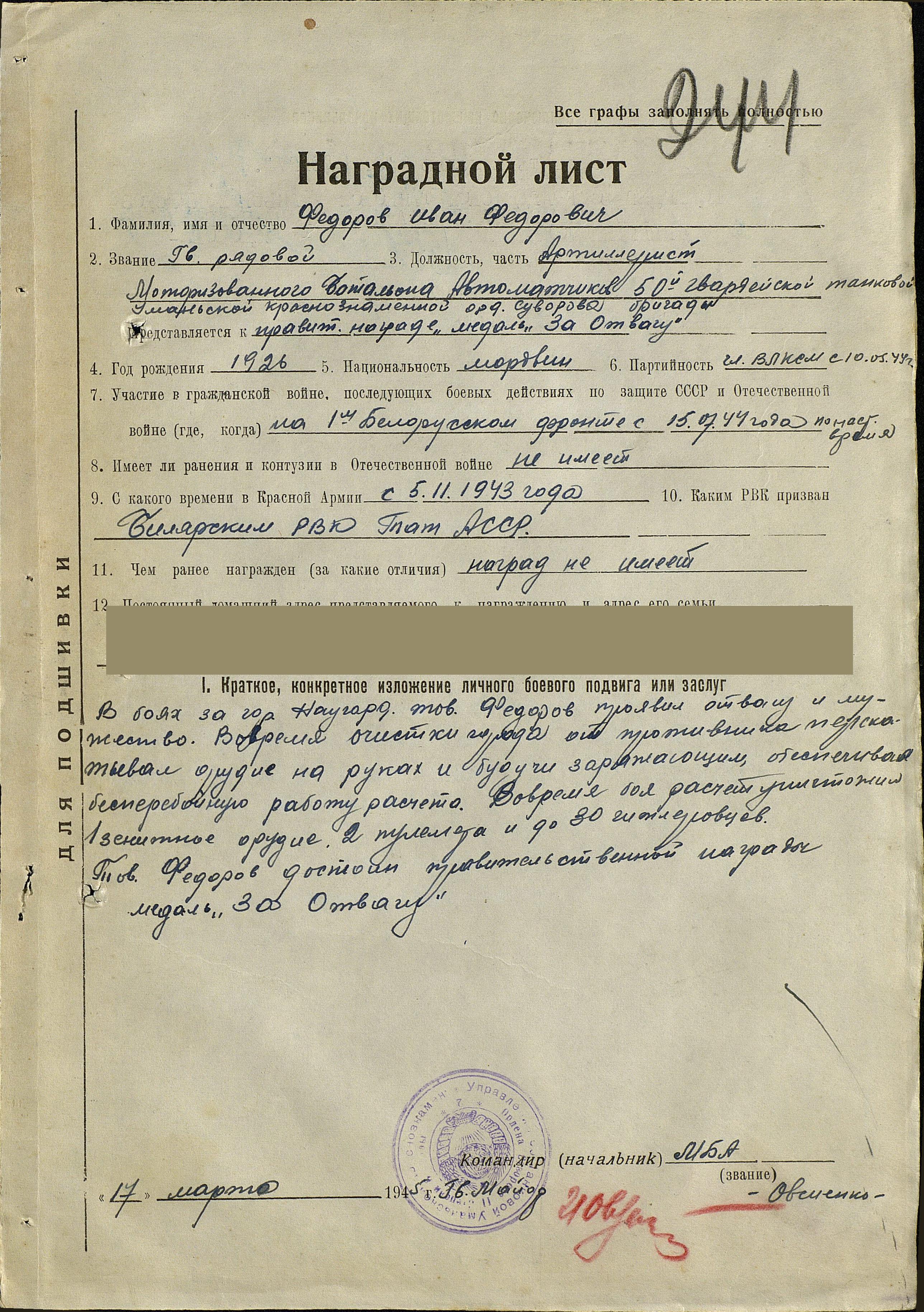 ФЁДОРОВ Иван Фёдорович, 1926, д. Андреевка (сейчас не существует). До призыва в армию работал в к-зе "Красная нива". Мобилизован Билярским РВК в ноябре 1943 г. На фронте с июля 1944 г. Воевал в Белоруссии, Польше, Германии. Гв. рядовой, номер орудийный батареи ПТО моторизированного батальона автоматчиков 50 гв. танковой бригады. Участник освобождения Варшавы и штурма Берлина. Награждён орденом Красной Звезды (май 1945), медалями "За отвагу" (март 1945), "За освобождение Варшавы", "За взятие Берлина".