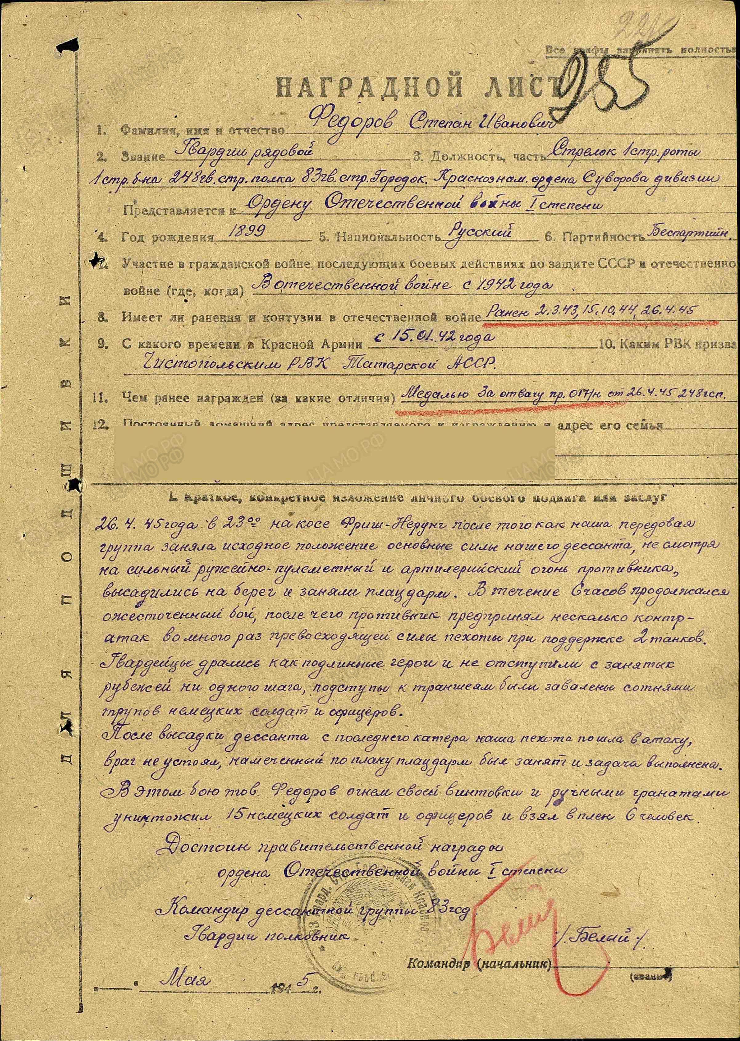 стрелок Фёдоров С.И. В справке Центрального архива Министерства обороны от 19.05.1998 г. указано, что гвардии рядовой Фёдоров Степан Иванович был награждён медалью «За отвагу» (приказ от 26.04.45г.), орденом Отечественной войны 1 степени (приказ от 18.05.45г.). Награды после войны вручены его сыну.