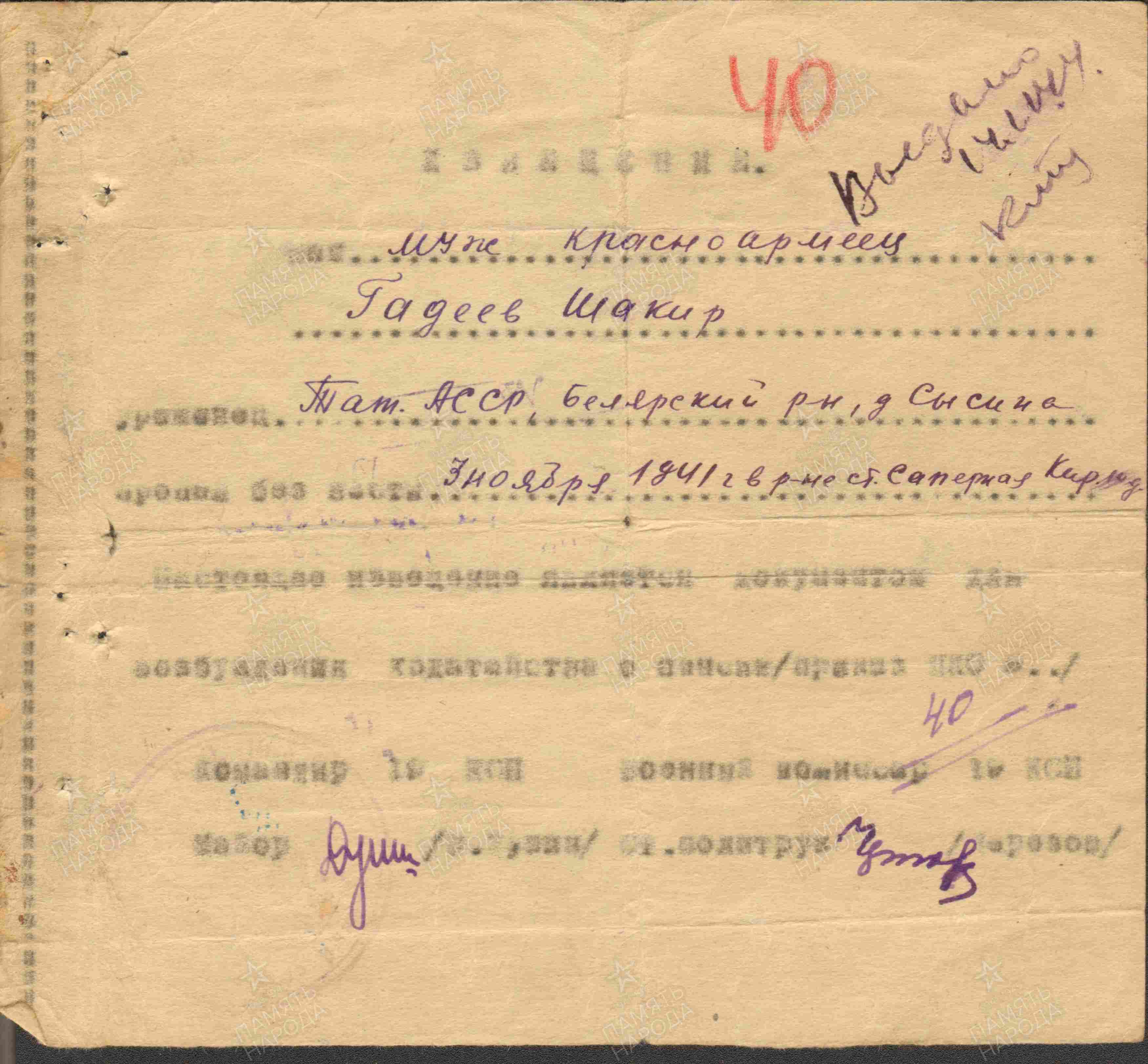 ГАДЕЕВ Шакир, 1914, с. Ошняк. Призван Сталинским РВК г. Иваново 21 июня 1940. Красноармеец, пекарь 168 полевой хлебопекарни 90 СД. Легко ранен 1 окт. 1941 в боях за Ленинград. 17 окт. 1941 выписан в батальон выздоравливающих из СЭГ 1170, далее направлен в 19 СП 90 СД 55 А Ленинградского фронта. Пропал без вести 3 нояб. 1941 у р. Тосно близ ст. Сапёрная, Колпинский р-н, Ленинградская обл.