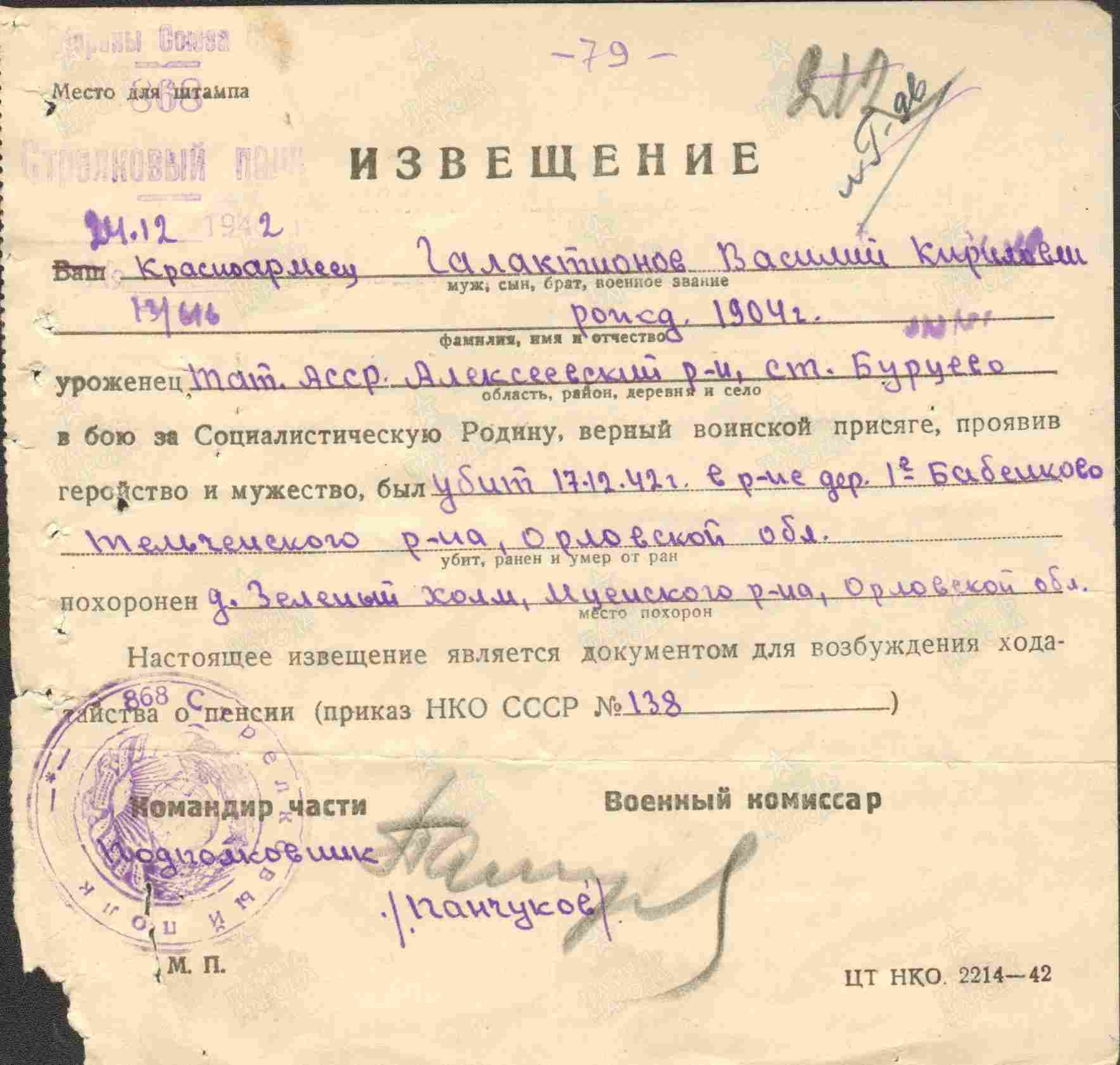 ГАЛАКТИОНОВ Василий Кириллович, 1904, д. Бурцево. Мобилизован Алексеевским РВК 13 нояб. 1941. Красноармеец, 868 СП 287 СД Брянского фронта. Погиб 17 дек. 1941, п. Зелёный Холм, Мценский р-н, Орловская обл.