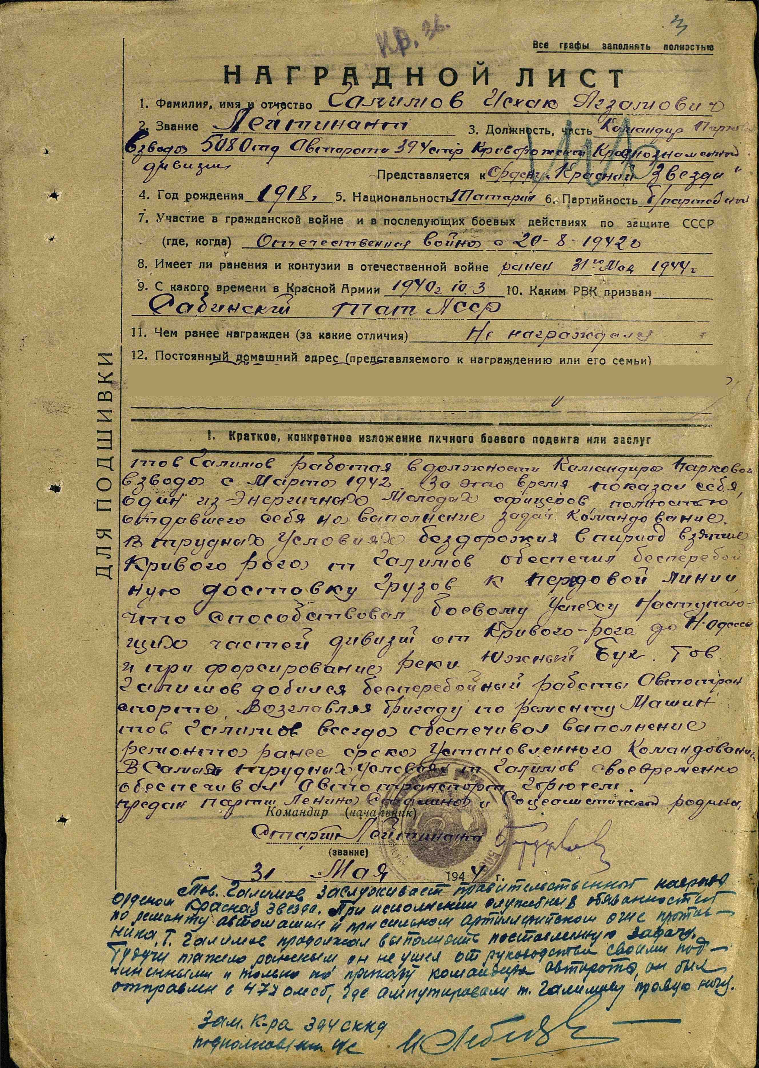 Был награжден орденом Красной Звезды (08.07.1944).