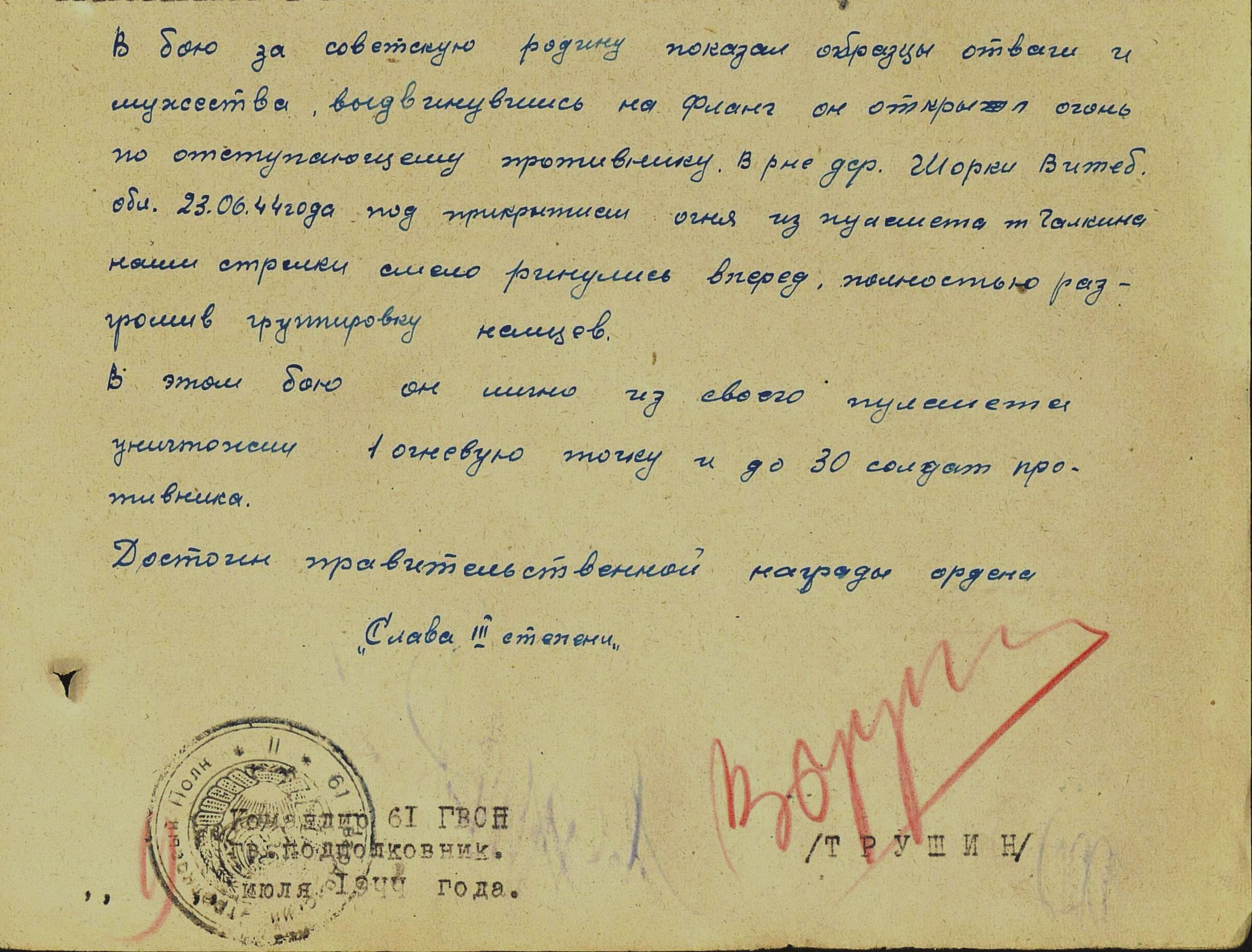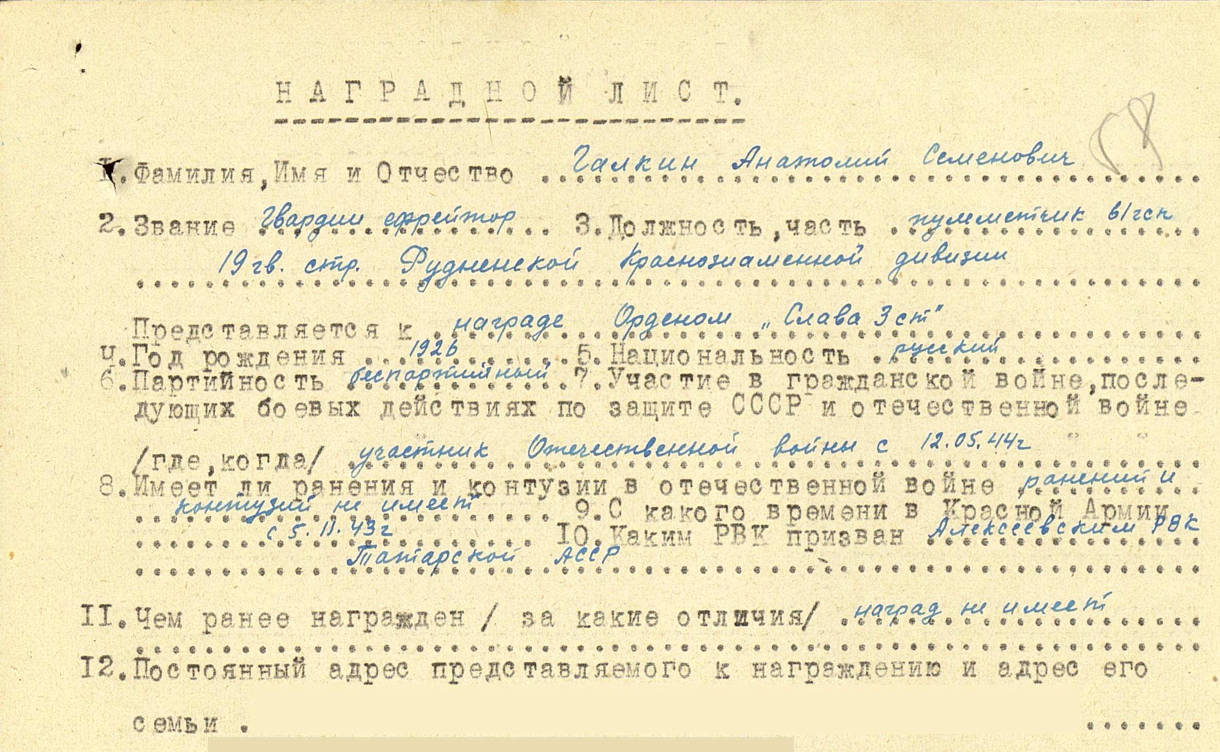 ГАЛКИН Анатолий Семёнович, 1926, д. Бурцево. Мобилизован Алексеевским РВК в 1943 г. На фронте с мая 1944 г., гв. ефрейтор, пулемётчик 61 гв. СП 19 гв. СД. Отличился в боях на территории Белоруссии. Награждён орденом Славы 3 ст. По словам родственников с войны боец не вернулся, однако данные о его гибели на фронте в "ОБД-мемориал" найти не удалось.