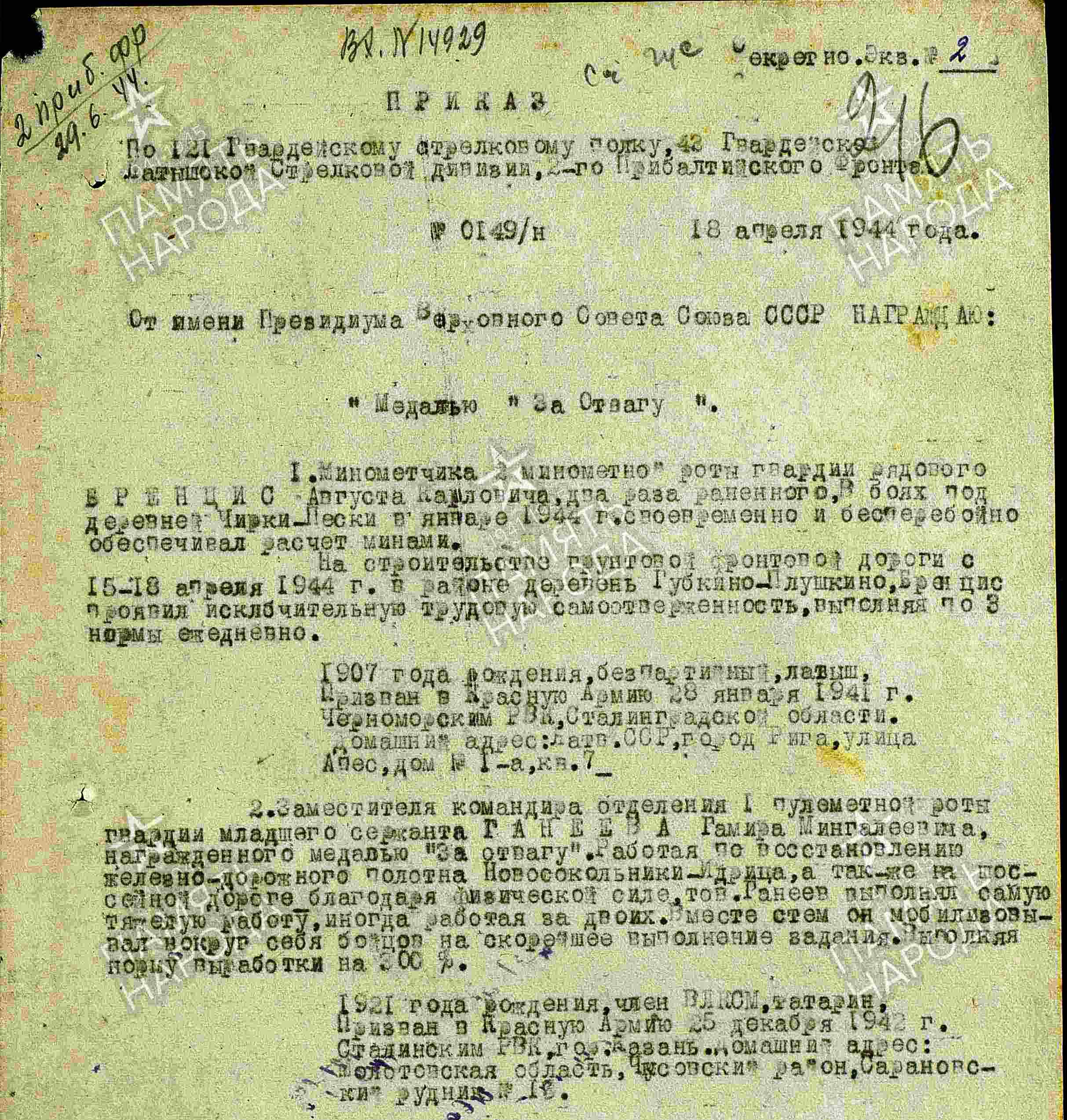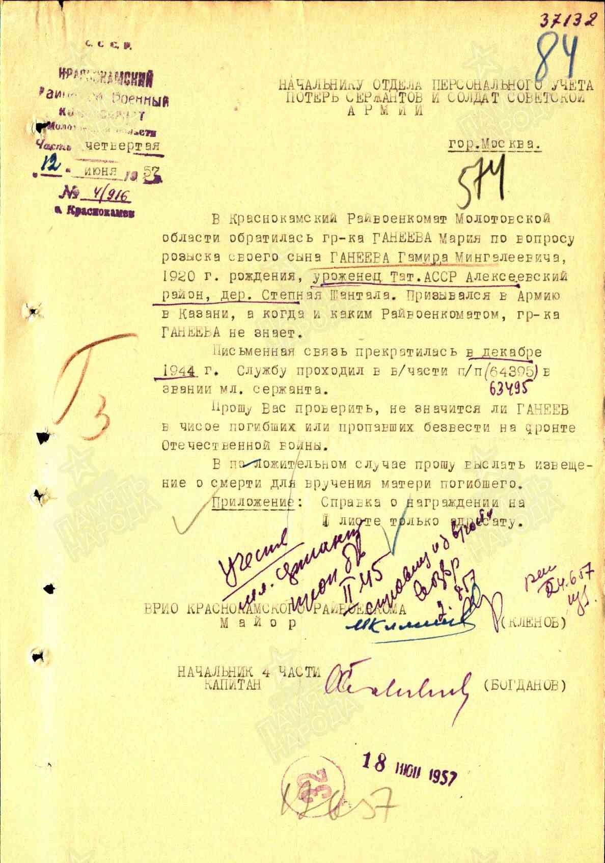 ГАНЕЕВ Гамир Мингалеевич, 1920, с. Степная Шентала. Член ВКП(б). До призыва в армию работал в тыловой промышленности. Мобилизован Сталинским РВК г. Казань 25 дек. 1942. На передовой с 18 фев. 1943. Ранен в первом бою. Гв. ефрейтор/ гв. мл. сержант, стрелок, наводчик роты ПТР, зам. ком. отделения пулемётной роты 121 гв. СП 43 гв. СД 11 А/ 27 А/ 68 А/ 34 А Северо-Западного фронта, 22 А 2 Прибалтийского фронта. «При атаке на д. Пески, смело и мужественно бросившись вперёд, первым ворвался в траншею противника, огнём автомата уничтожил трёх фашистов, убил одну вражескую лошадь. Работая на восстановлении ж/д полотна Новосокольники – Идрица и шоссейной дороги, благодаря физической силе, выполнял самую тяжёлую работу, часто работая за двоих, выполняя норму на 300 %. В бою 25 июля 1944 огнём из ПТР поджог строение с огневой точкой врага, уничтожил НП, обратил вспять вражеский танк». Награждён двумя медалями «За отвагу», орденом Славы 3 ст. Письменная связь с семьёй прекратилась в дек. 1944. Учтён пропавшим без вести.