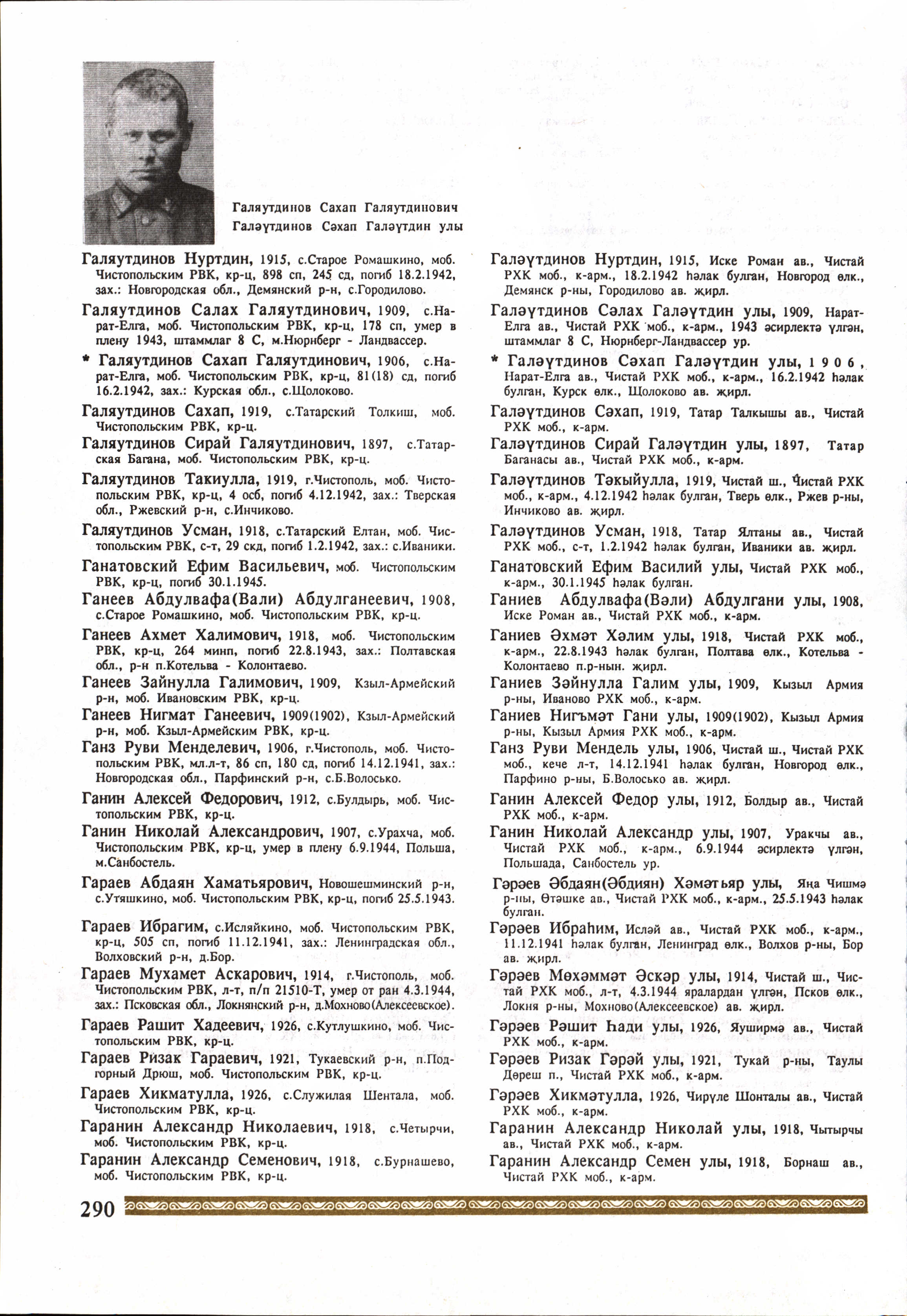 Родился 6 июня 1907 г. в с. Урахча. Мобилизован Чистопольским РВК. Содержался в шталаге X B. Лагерный номер 131476. Рядовой Ганин Николай Александрович погиб в плену 6 сентября 1944 г. Место захоронения: Германия, Рорзен (по другим сведениям: Польша, м. Санбостель).