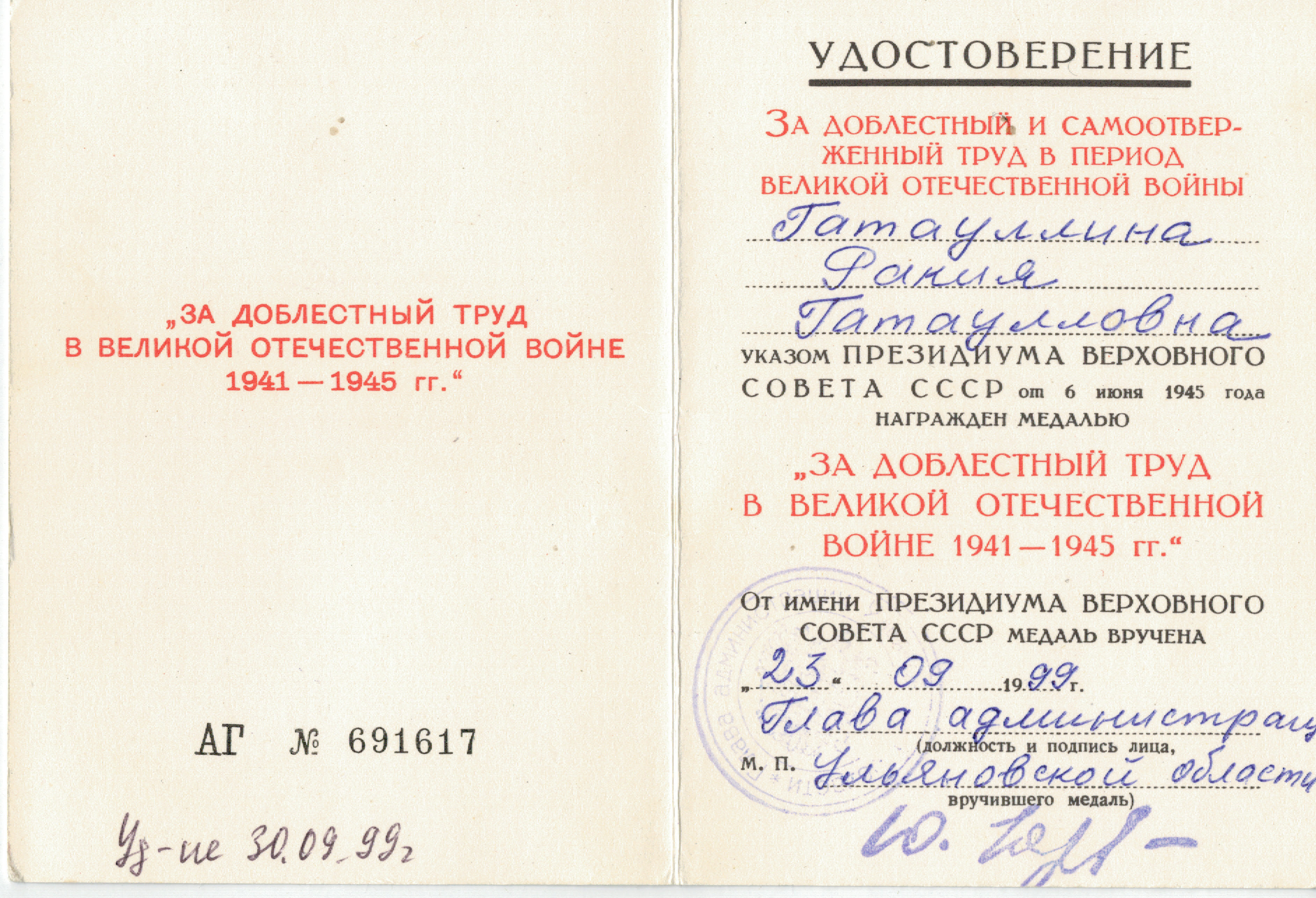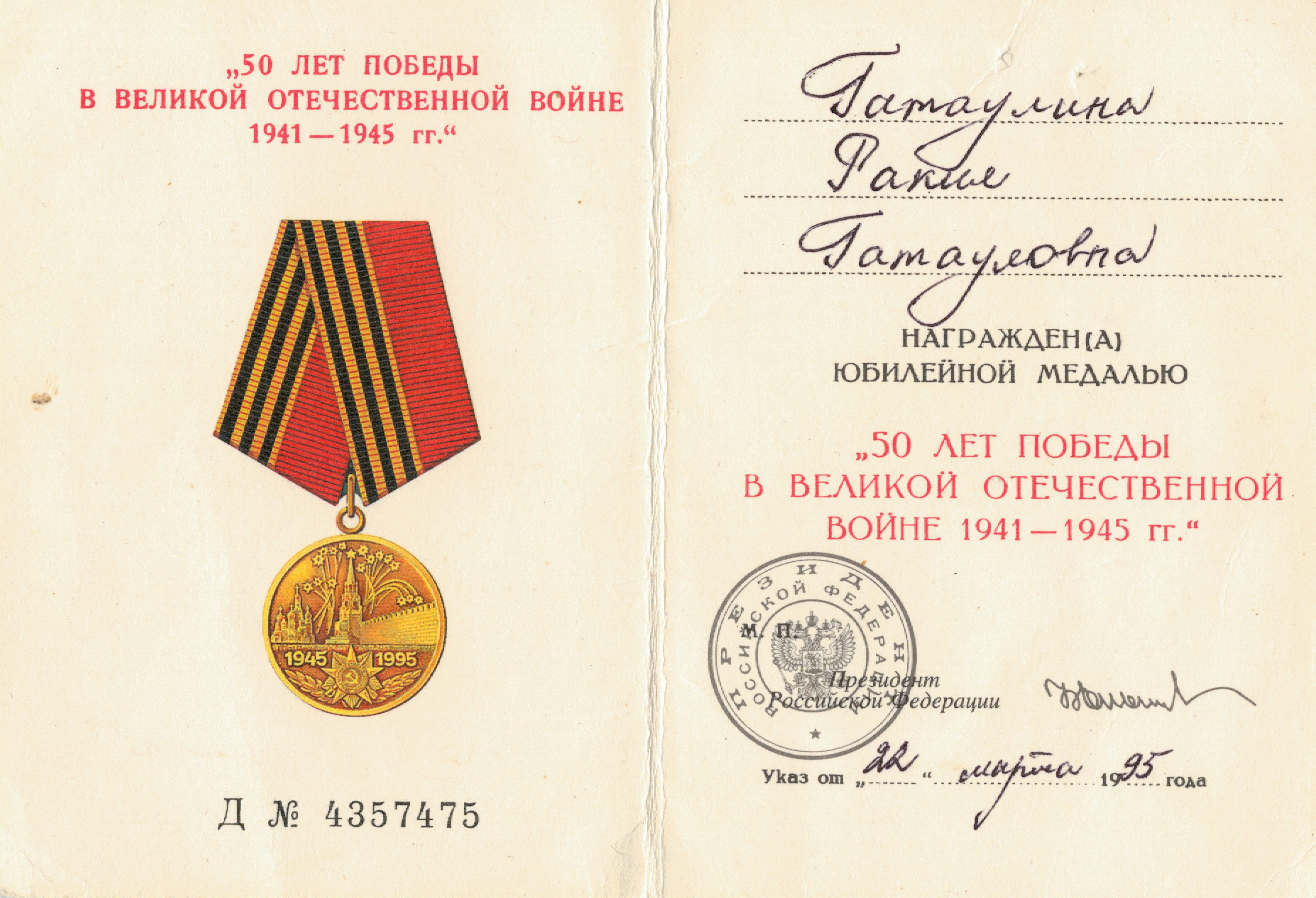Гатауллина Рокия Гатаулловна, родилась 30.06.1916 г. в дер. Б. Тиганы Спасского уезда Казанской губернии. В 1939г. по направлению комсомольской организации поехала в Московскую область жить и работать в Московском государственном торфяном тресте (Комсомольское транспортное управление). В период с 1939 г. по 1955 г. (в т.ч. в годы войны) работала в отделении пути в качестве ремонтного рабочего, за что была удостоена медалью «За доблестный труд в Великой Отечественной Войне 1941-1945 гг.».