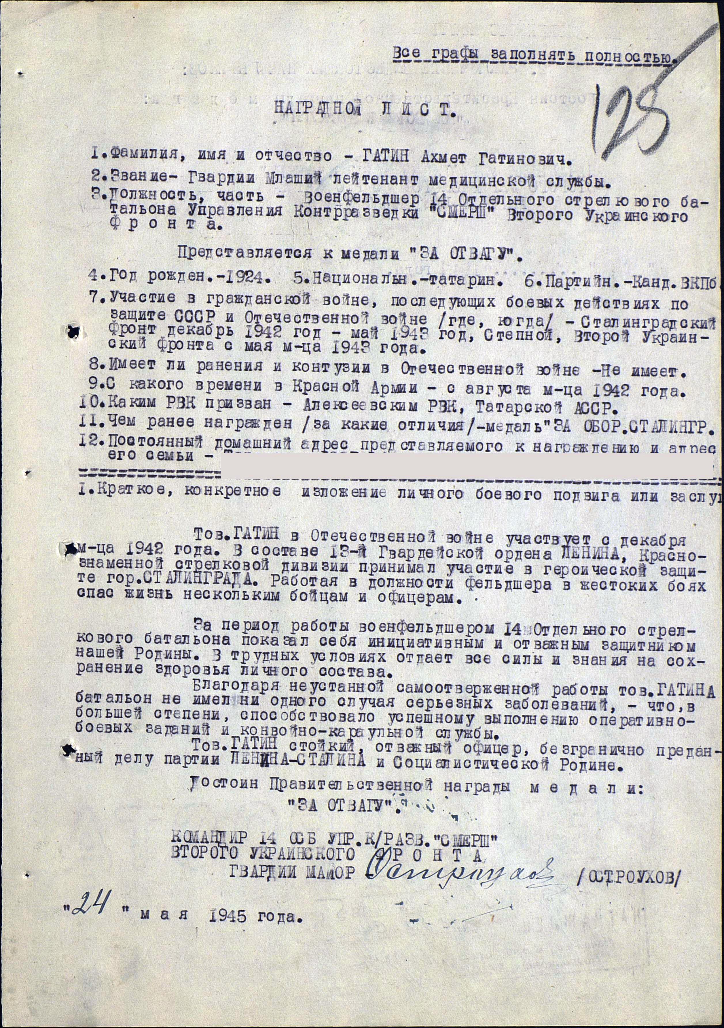 ГАТИН Ахмет Гатинович, 1924 г.р., с. Нижн. Тиганы. Моб. в 1942 г. Гв. мл. лейтенант мед. службы, военфельдшер 14 отд. стрелк. бат-на Упр. контрразведки «СМЕРШ». Участник боёв на Сталинградском (13 гв. СД), Степном, 2 Укр. фронтах. Награждён медалью "За боевые заслуги", "За оборону Сталинграда". После войны служил медиком в частях ВМФ в Севастополе.
