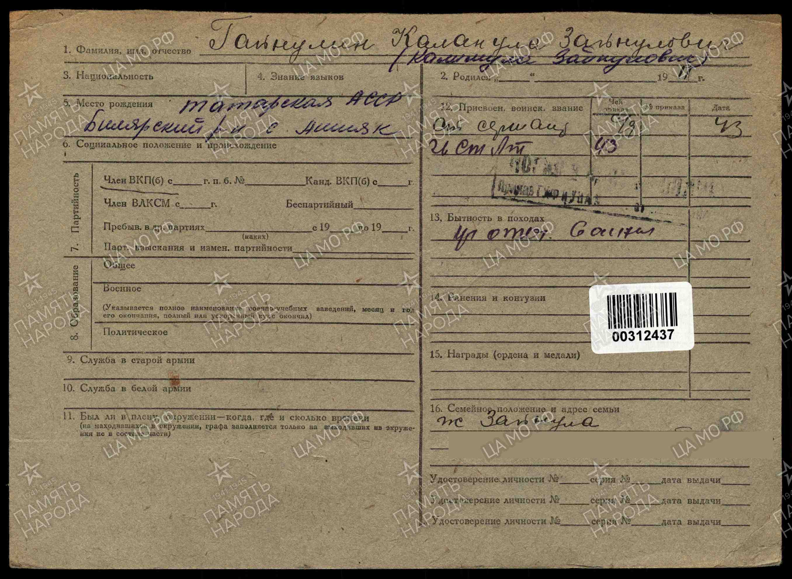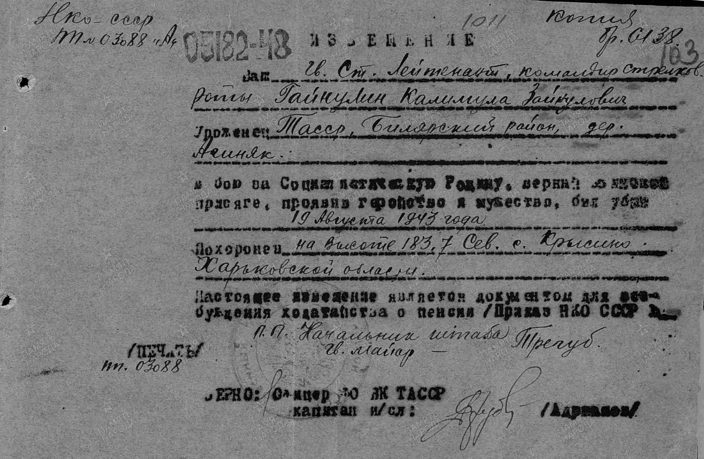 ГАЙНУЛЛИН Калимулла Зайнуллович, 1911, д. Ошняк. Член ВКП(б). Мобилизован Билярским РВК в 1933, 1940 и 24 июля 1941. Сержант. В 1943 – гв. лейтенант/гв. ст. лейтенант, ком. миномётного взвода, ком. роты 34 гв. СП 13 гв. СД 5 гв. А Степного и Воронежского фронта. Участник битвы на Курской дуге (южный фас, наступательный этап). Убит 19 авг. 1943, выс. 183,7, с. Крысино, Богодуховский р-н, Харьковская обл., УССР.