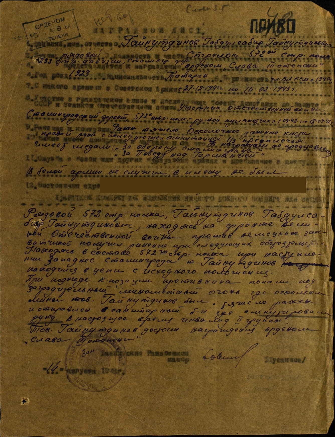 Рядовой 572-го стрелкового полка Гайнутдинов Габдулсабир, участвуя в боевых действиях при наступлении западнее Сталинграда, находился в цепи исходного положения. При подходе к позиции противника его полк попал под заградительный миномётный огонь, где осколком мины он получил осколочное ранение с последующей ампутацией 1/3 предплечья. Гайнутдинов Г.Г. был отправлен в санаторный батальон, где его комиссовали. Он стал инвалидом 2 - ой группы, и за этот бой награждён орденом Славы 3 – ей степени.