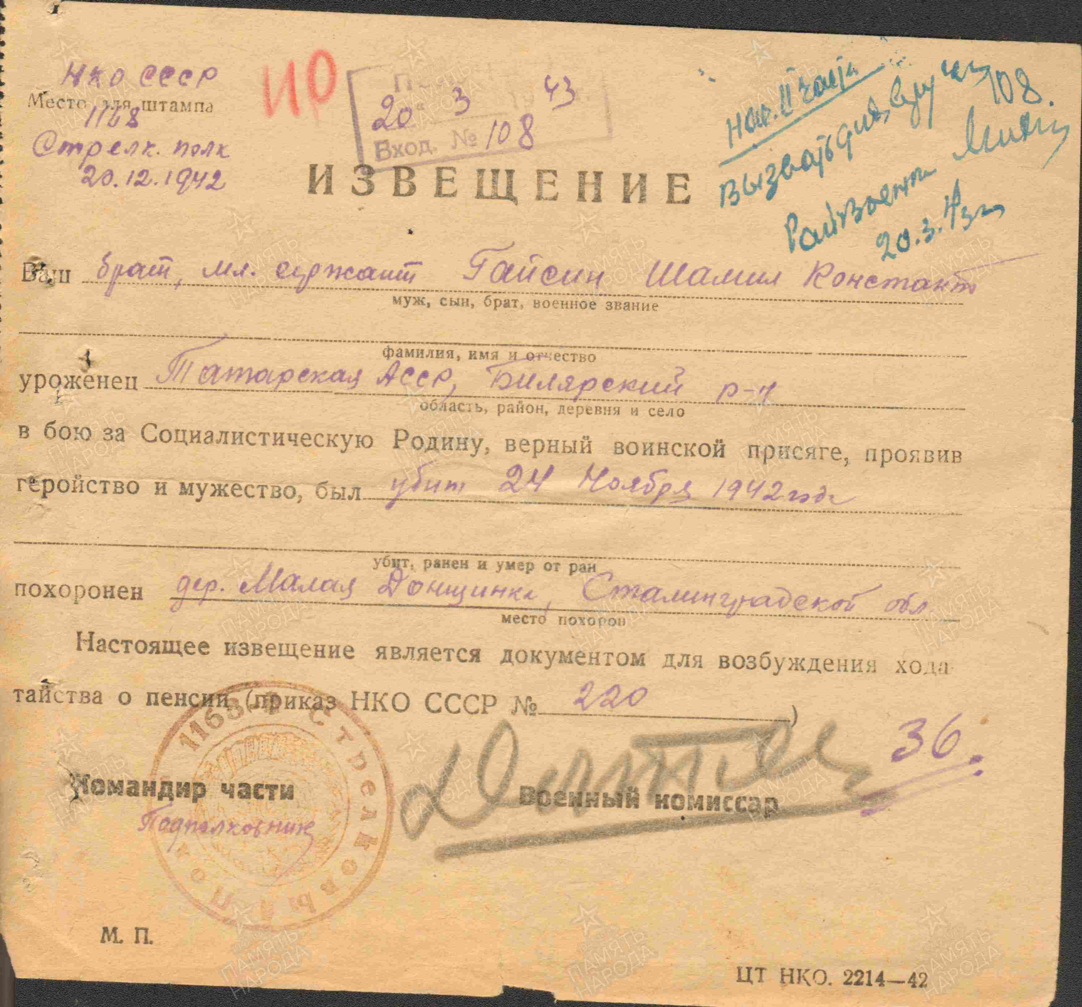 ГАЙСИН Шамиль Камалович, 1917 (1918), с. Шама. Мобилизован 25 окт. 1939 Билярским РВК. Член ВЛКСМ. Мл. сержант, пулемётчик 1168 СП 346 СД 5 ТА Юго-Западного фронта. Погиб 24 нояб. 1942, хут. Малая Донщинка, Клетский р-н, Сталинградская обл.