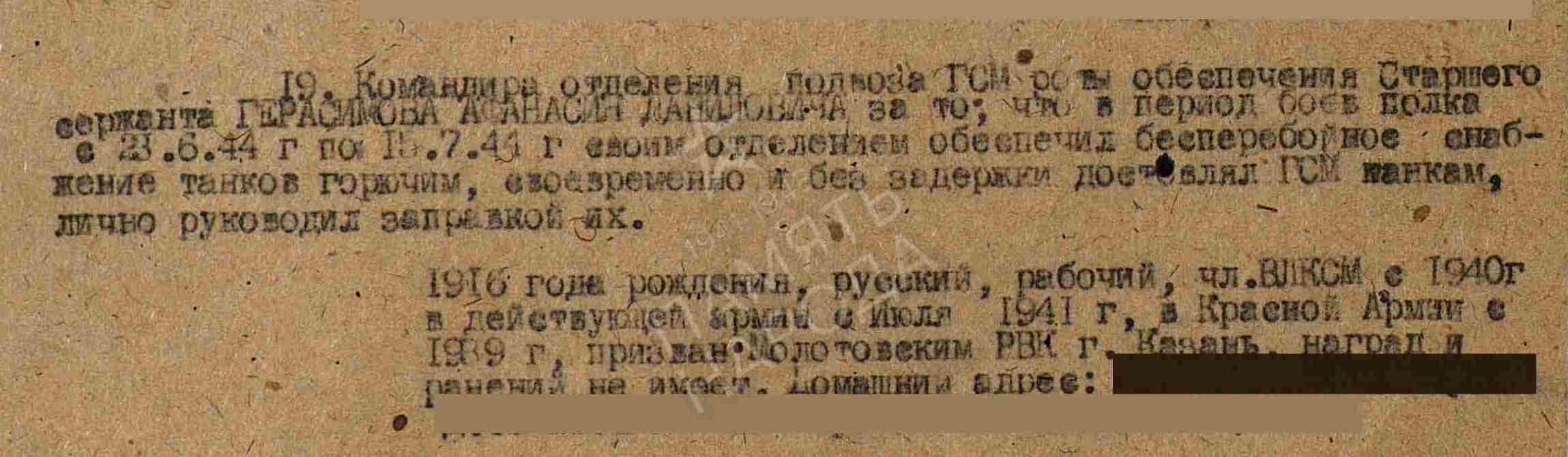 ГЕРАСИМОВ Афанасий Данилович, 1916, д. Бутлеровка. Мобилизован Молотовским РВК г. Казань в 1939. Красноармеец, 409 отд. автотранспортный батальон. Член ВЛКСМ. В действующей армии – с июля 1941. Участвовал в сражениях за Москву, Сталинград, Кёнигсберг. В 1944-1945 – ст. сержант, ком. отделения подвоза ГСМ роты обеспечения 148 инженерно-танкового полка 2 гв. мотризованной штурмовой инженерно-сапёрной бригады 28 А 3 Белорусского фронта. Награждён медалями «За отвагу», «За оборону Москвы», «За оборону Сталинграда», «За взятие Кёнигсберга».