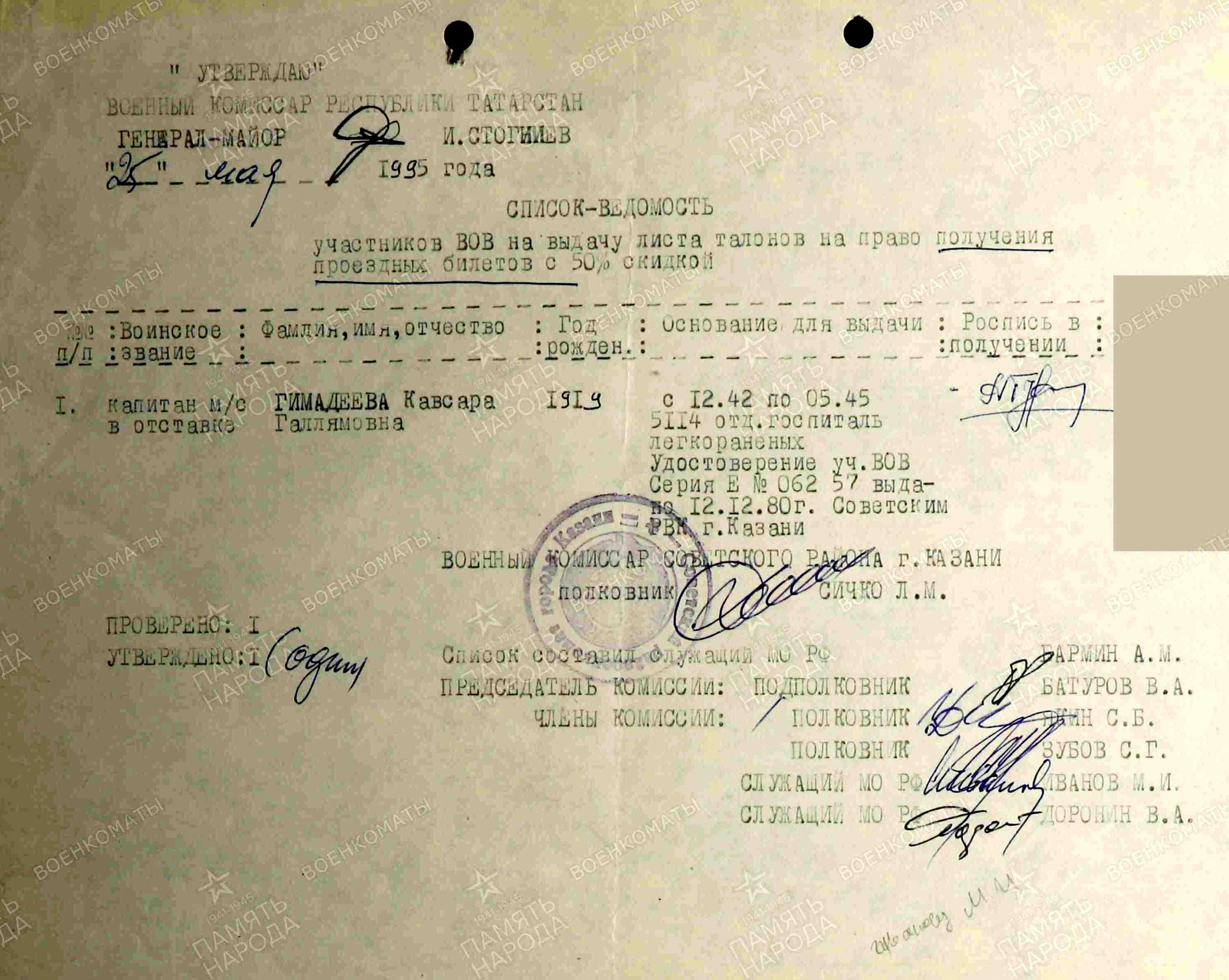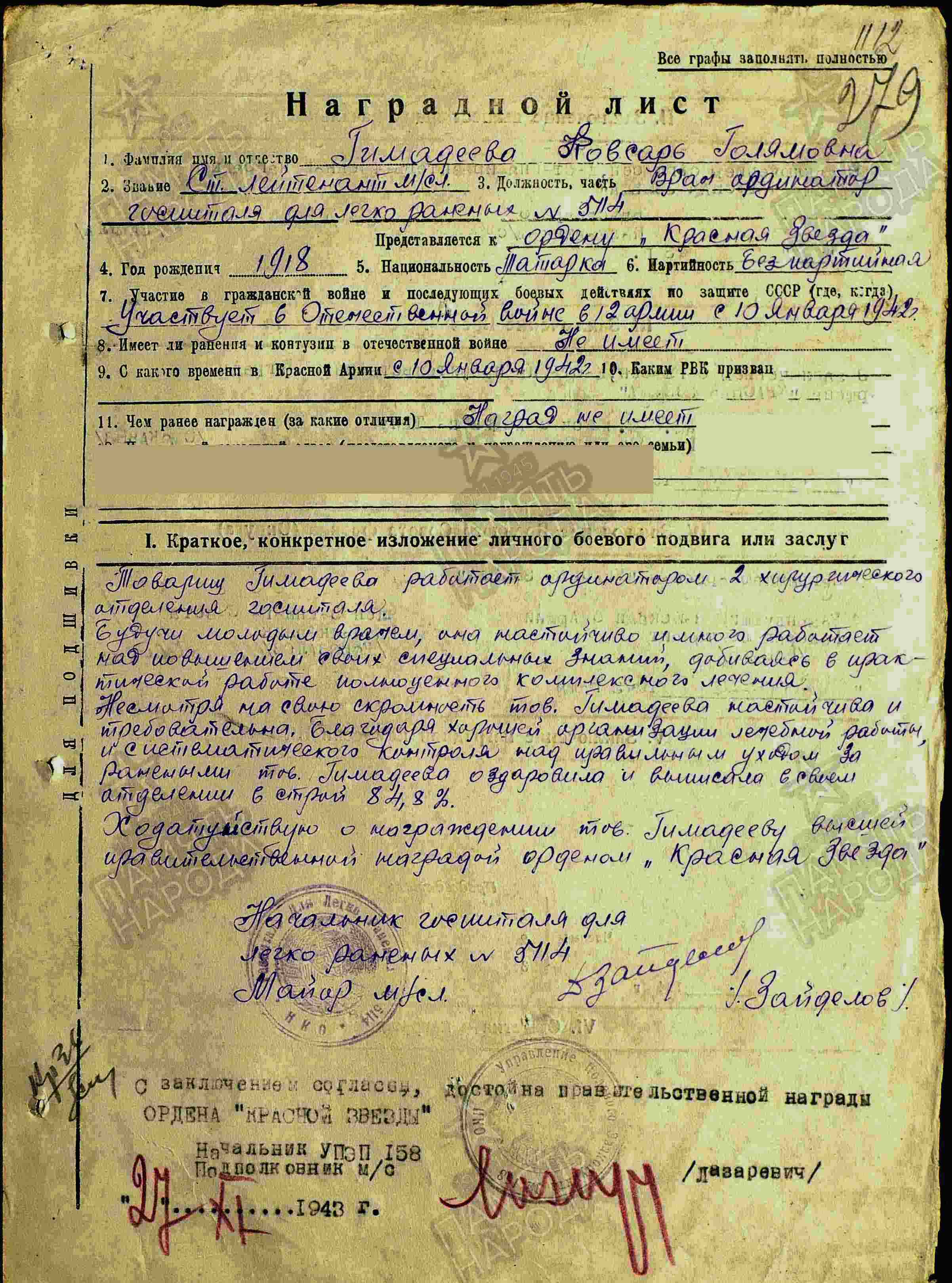 ГИМАДЕЕВА Кавсара Галлямовна, 1918 (1919), с. Шама. В армии с 1942. Ст. лейтенант, капитан медицинской службы, подвижной полевой госпиталь 2236, врач-ординатор 2 хирургического отделения госпиталя легко раненых № 5114 Управления ПЭП 158 в составе 12 А, 6 А Воронежского, Юго-Западного, 3 Украинского фронта, 164 отд. МСБ 10 А. «Благодаря хорошей организации лечебной работы и правильного ухода врач-ординатор Гимадеева добилась оздоровления и выписки 84% раненых хирургического отделения ГЛР 5114». Уволена в запас 24 авг. 1946. Жила в г. Казань, работала врачом кожно-венерологического диспансера на ул. Гладилова, 28. Награждена орденами Красной Звезды (1943), Отечественной войны 2 ст. (1985).