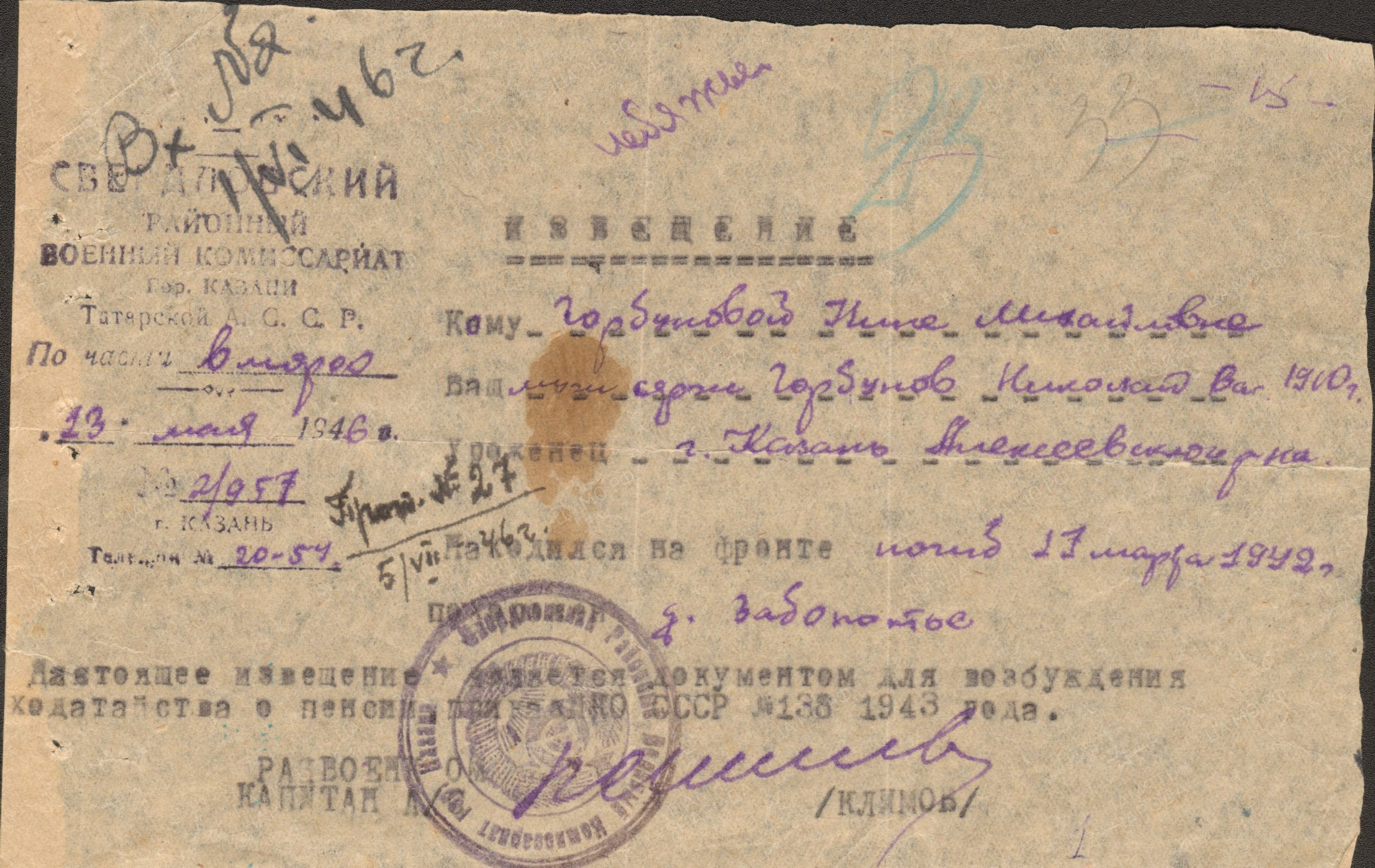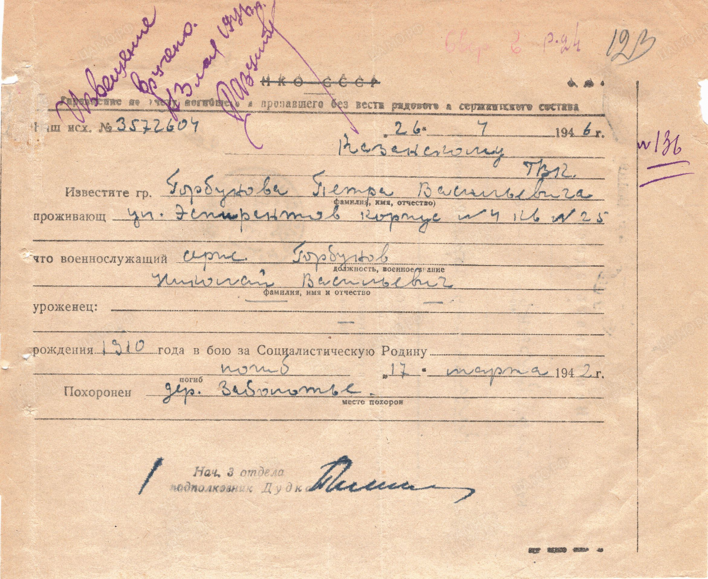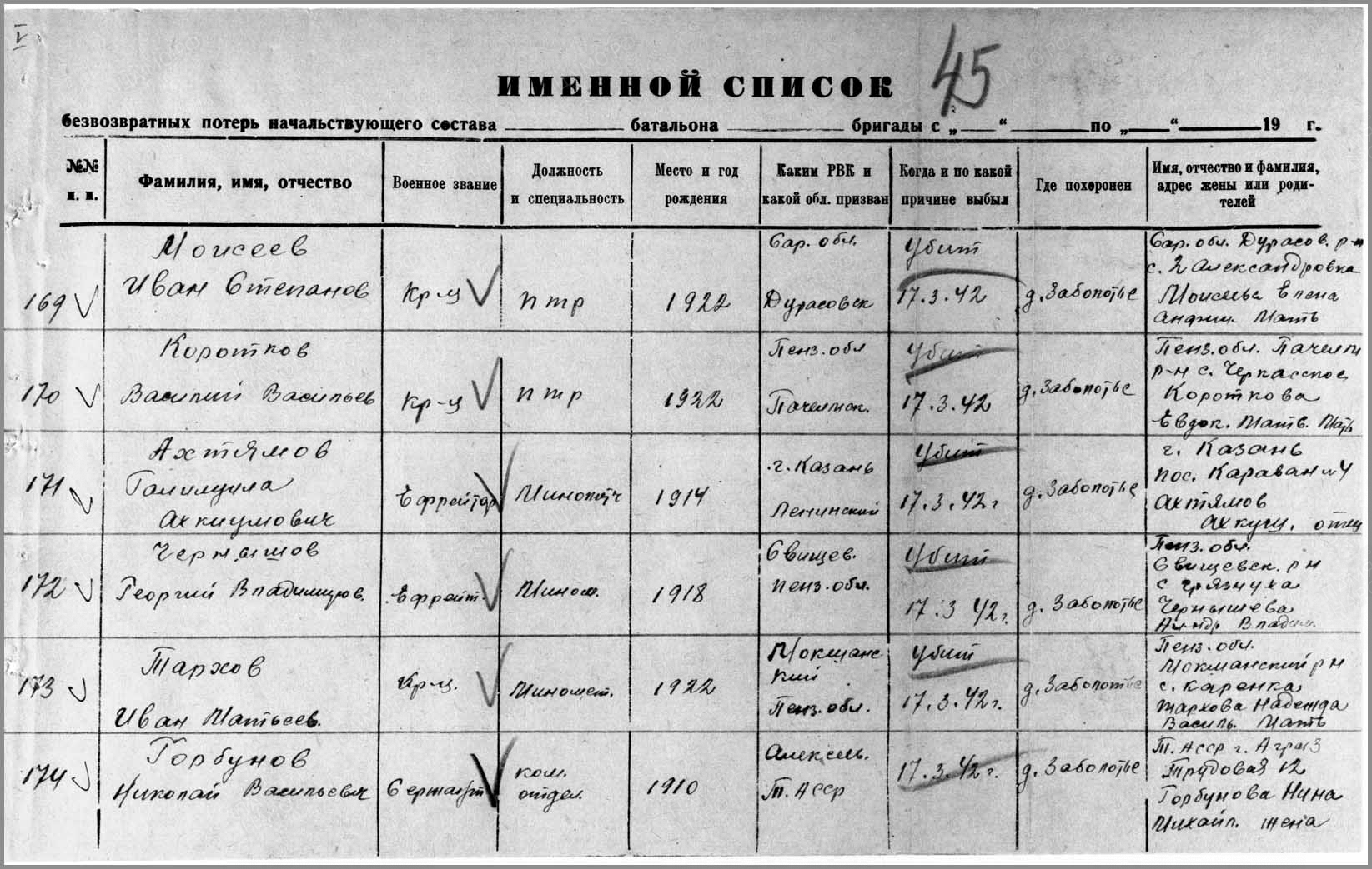 ГОРБУНОВ Николай Васильевич, 1910, с. Лебяжье. Мобилизован Свердловским РВК г. Казань в 1941. Сержант, ком. отделения 2 маневренной воздушно-десантной бригады Северо-Западного фронта. Погиб 17 марта 1942 у д. Заболотье Лычковского (Демянского) р-на Новгородской обл.