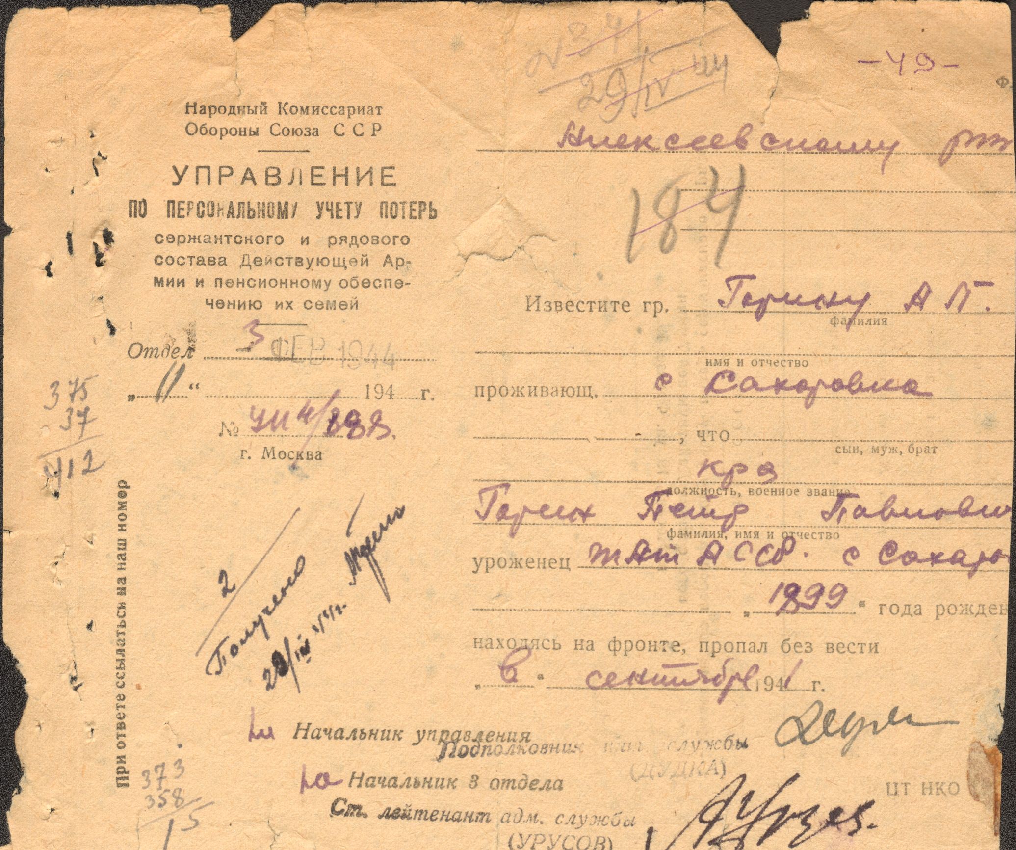 ГОРИН Петр Павлович, 1899, ТАССР, Алексеевский р-он, с. Сахаровка. Место призыва: Кимрский РВК, Калининская обл.,Кимрский р-он. Место службы: 1028 СП, красноармеец. Пропал безвести в Смоленской области в августе - сентабре 1941 г.