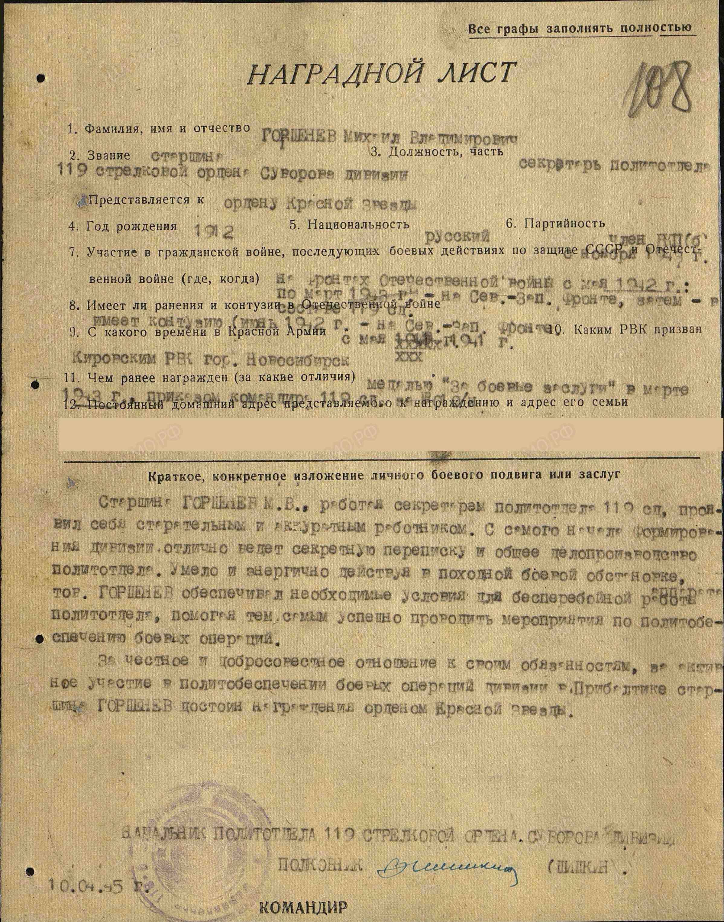 Михаил Владимирович Горшенев родился в 1912 г. в г.Чистополе, ТАССР. В 1939 г. призван в ряды Красной Армии Кировским военным комиссариатом, г. Новосибирск. Служил в звании старшины, в должности секретаря полит.отдела 119 Стрелковой ордена Суворова дивизии. В бою был ранен (контузия).