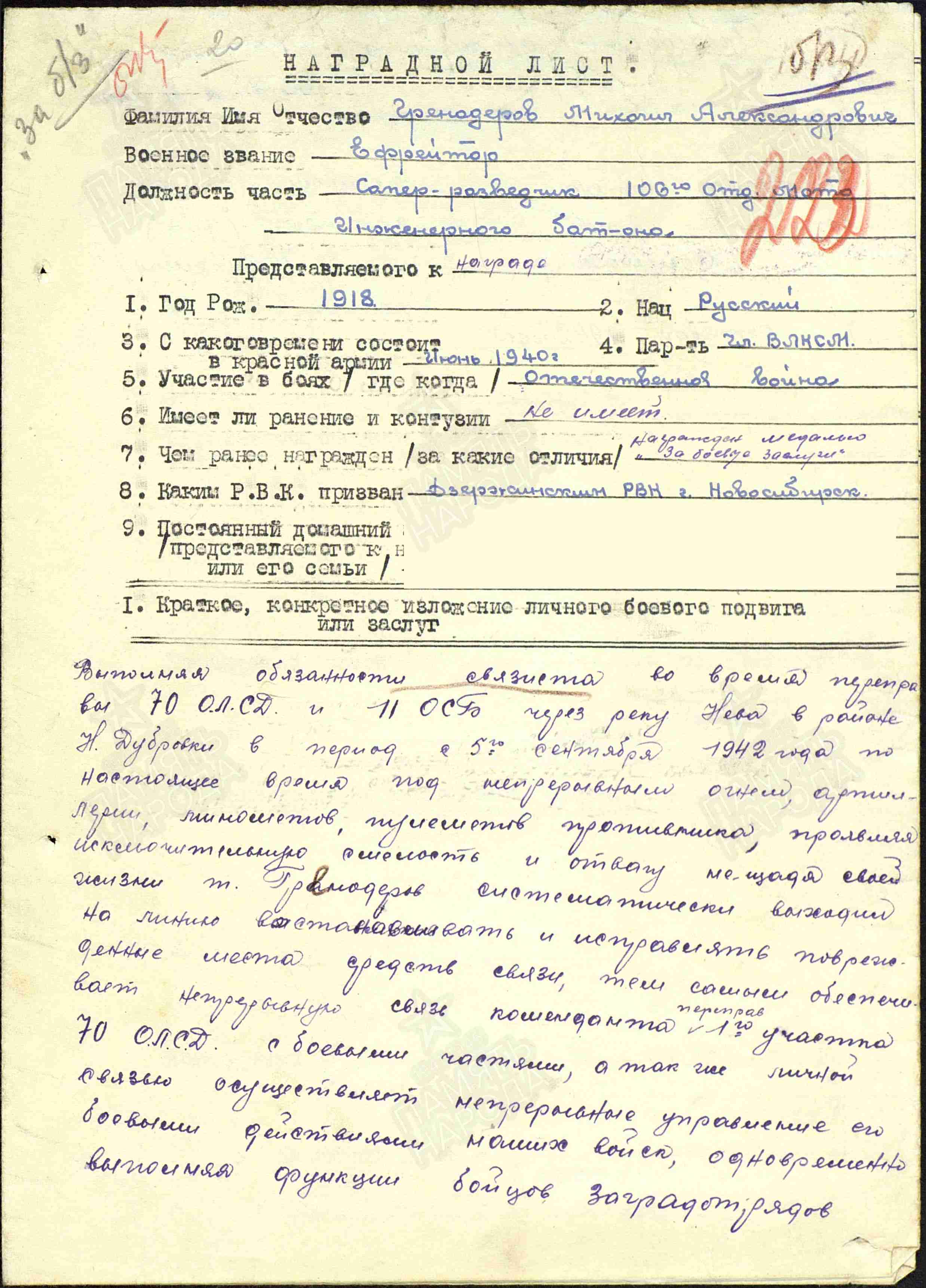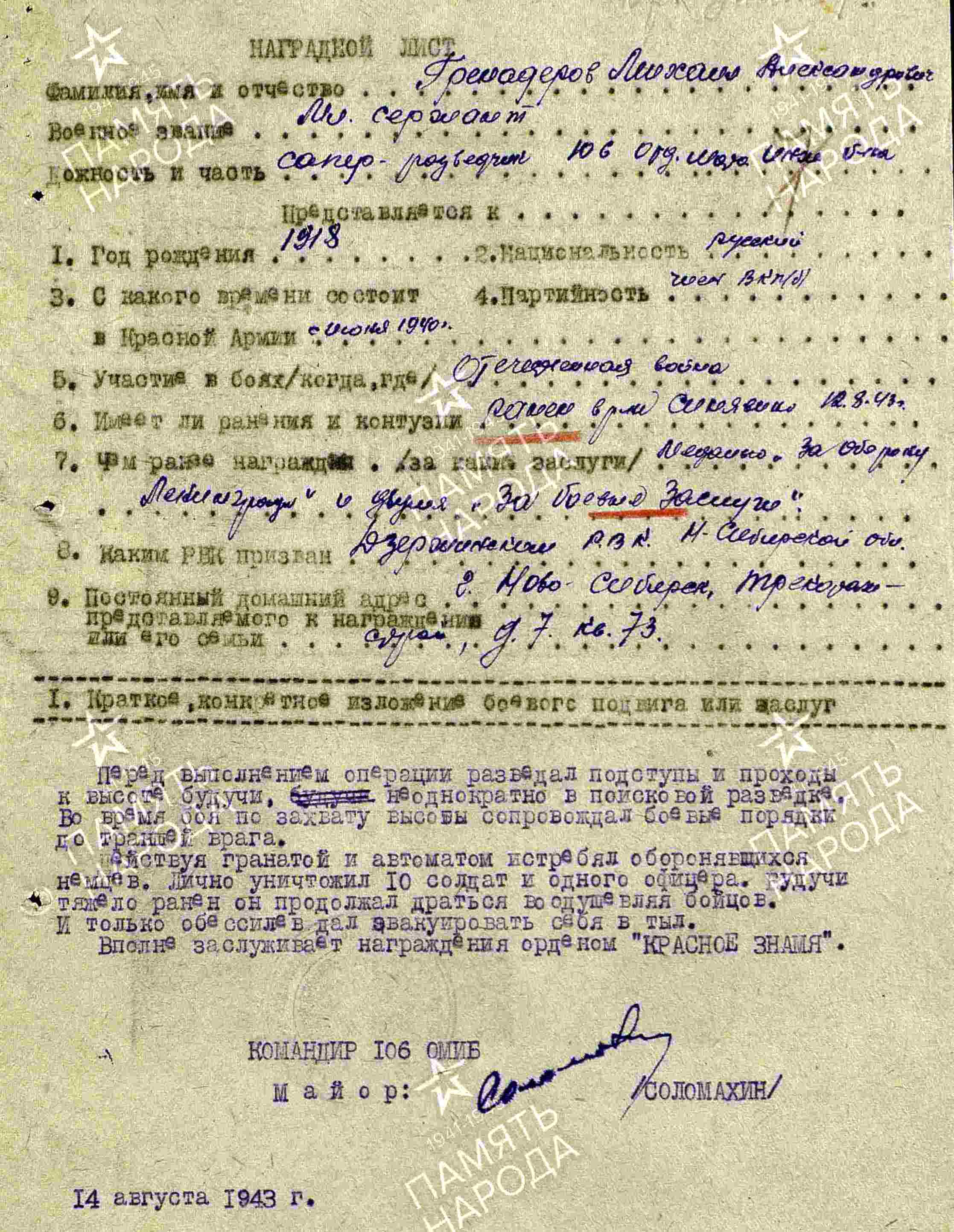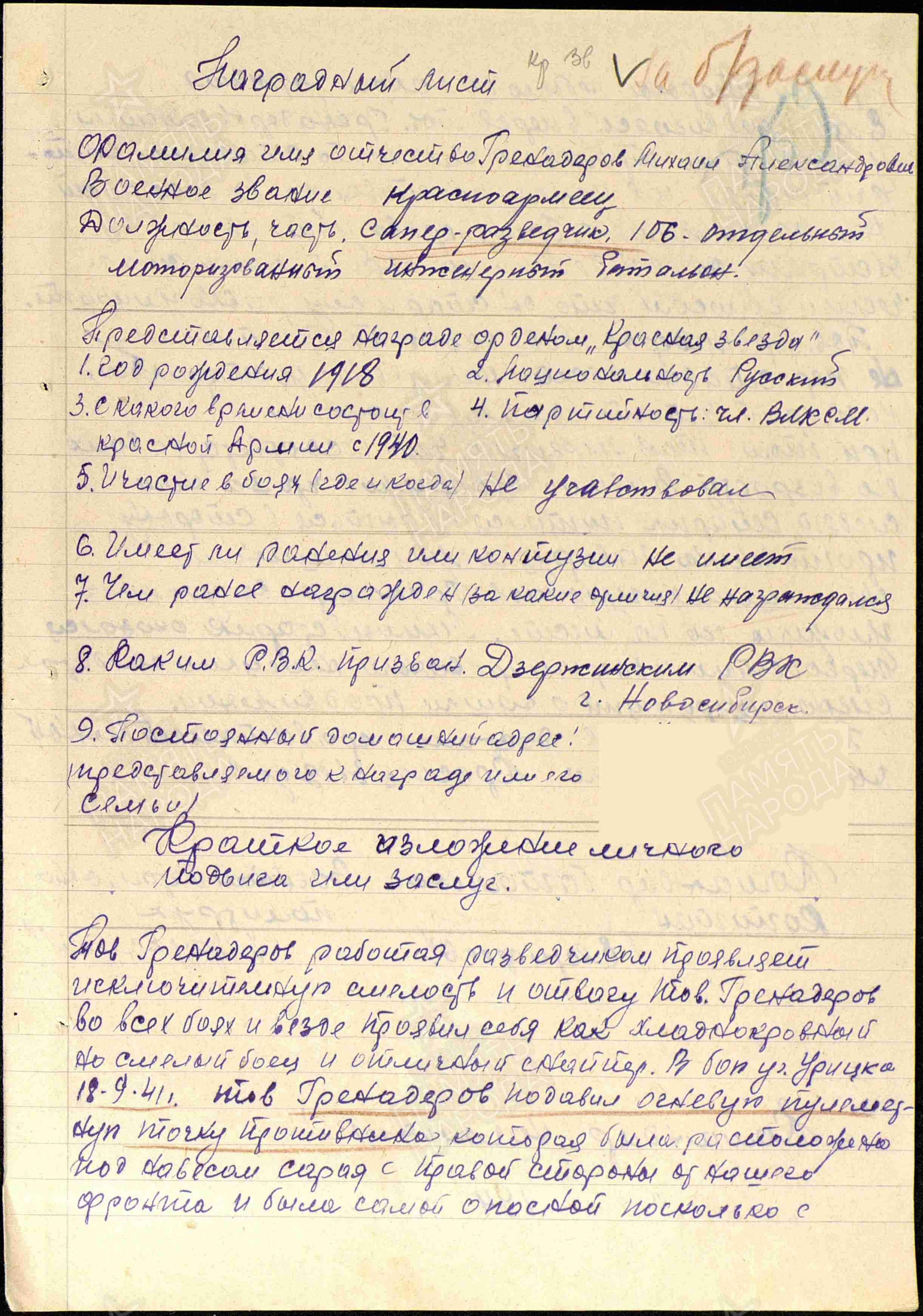 ГРЕНАДЁРОВ Михаил Александрович, 1918, с. Алексеевское. Призван в РККА в июне 1940 Дзержинским РВК г. Новосибирск. Член ВЛКСМ/ ВКП(б). Красноармеец/ ефрейтор/ мл. сержант, сапёр-разведчик, связист 106 отд. моторизованного инженерного батальона 42 А Ленинградского фронта. Тяжело ранен 12 авг. 1943 в боях за п. Синявино. Находился на лечении в ЭГ 442, г. Вологда. 20 нояб. 1943 признан негодным к службе и демобилизован. Награждён двумя медалями «За боевые заслуги», медалью «За оборону Ленинграда», орденами Красного Знамени, Отечественной войны 2 ст. (1985).