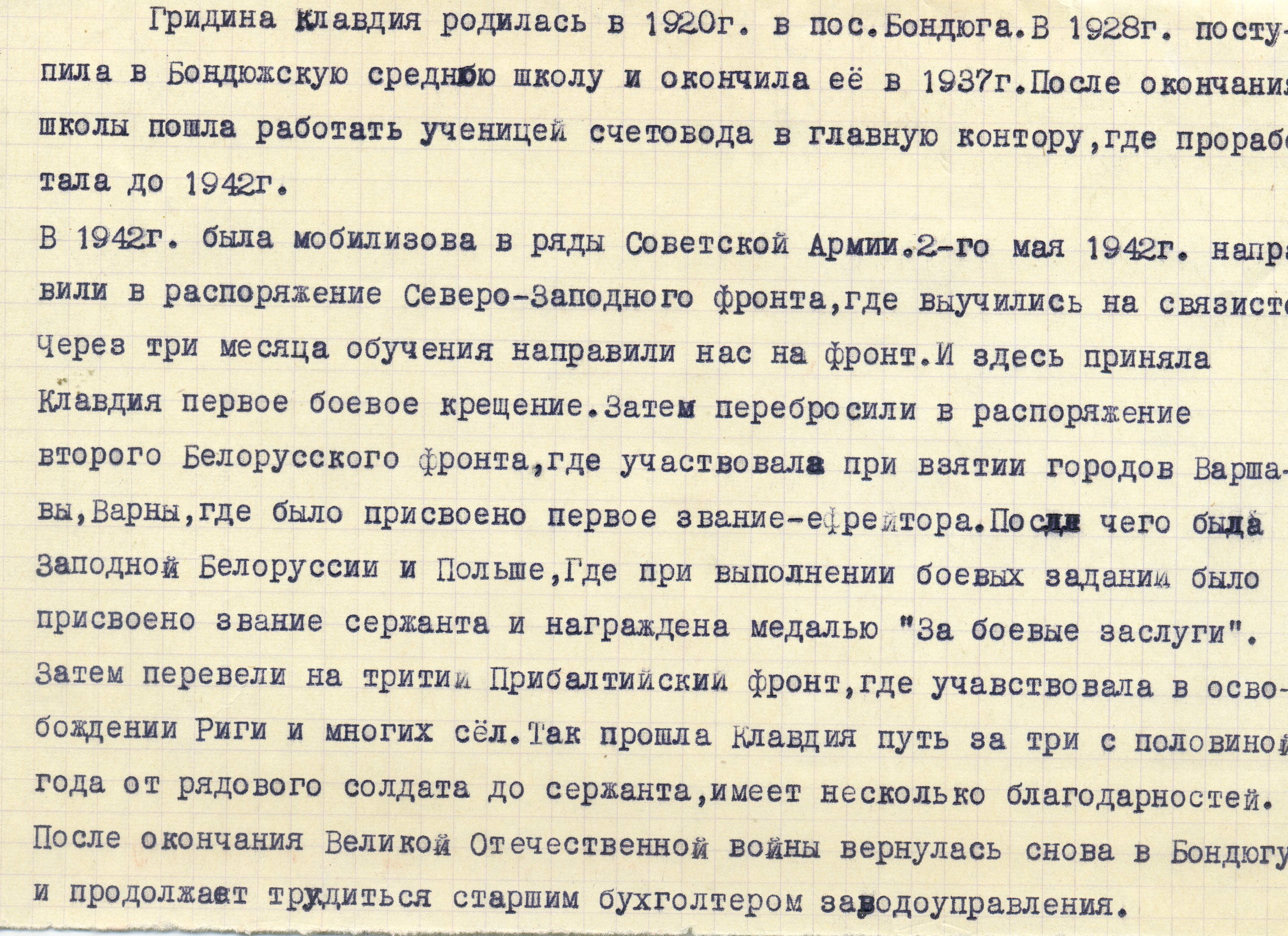 После войны работала бухгалтером на химическом заводе имени Карпова. Спутником жизни Клавдии Ивановны стал фронтовик Леонид Александрович Гридин.