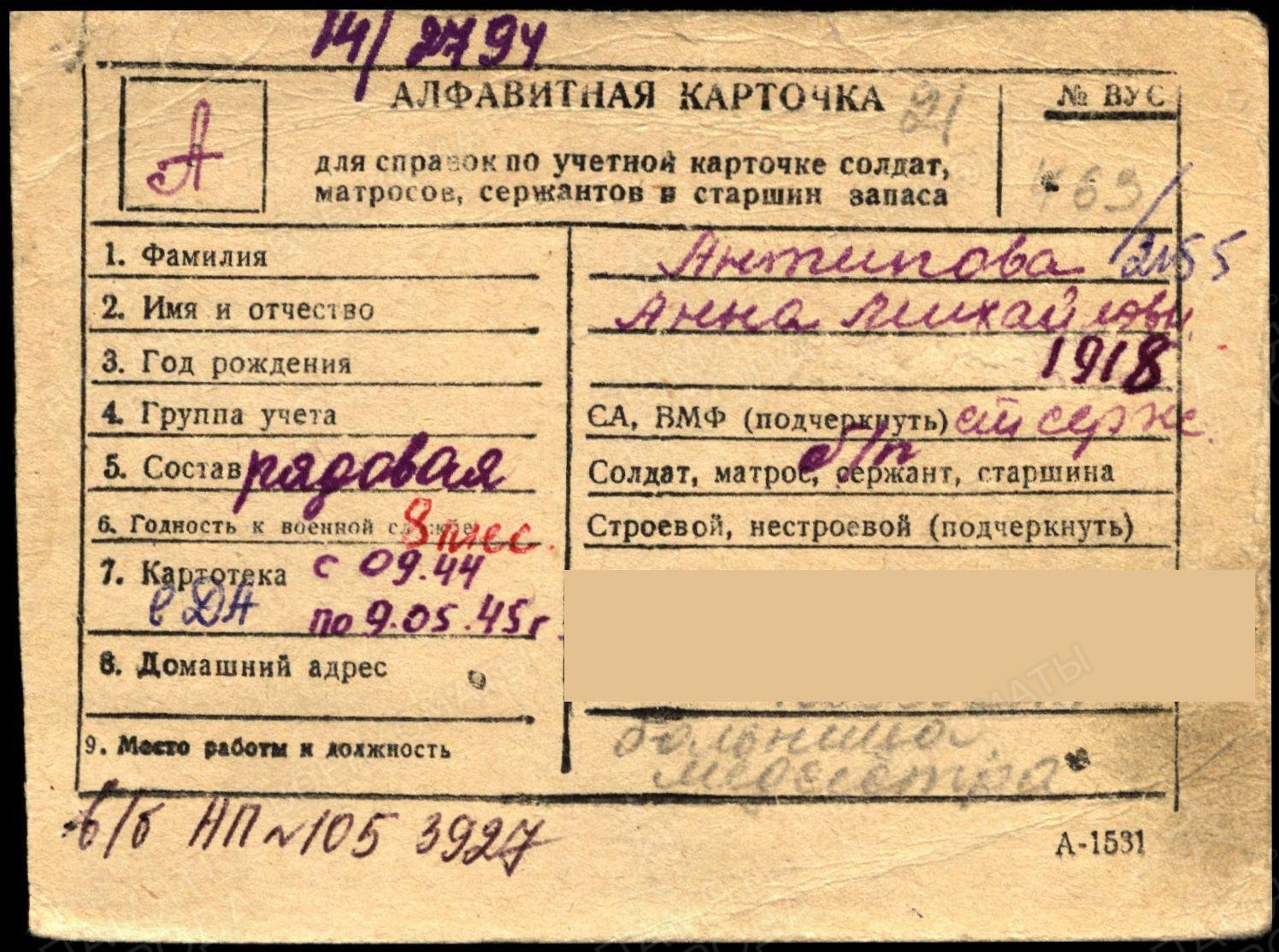 "Моя прабабушка Антипова Анна Михайловна родилась в 1918 году в селе Федотовка Лениногорского района Республики Татарстан. Она окончила школу ясельных сестер в городе Казани в 1938 году. Основной ее специальностью была специальность медсестры. В Великой Отечественной войне участвовала с 1943 года. В 1944 году ее направили на линию Первого Белорусского фронта. Она служила в полевом госпитале медсестрой в звании старшего сержанта до 1945 года. После войны работала медсестрой в Шугуровской участковой больнице.»
