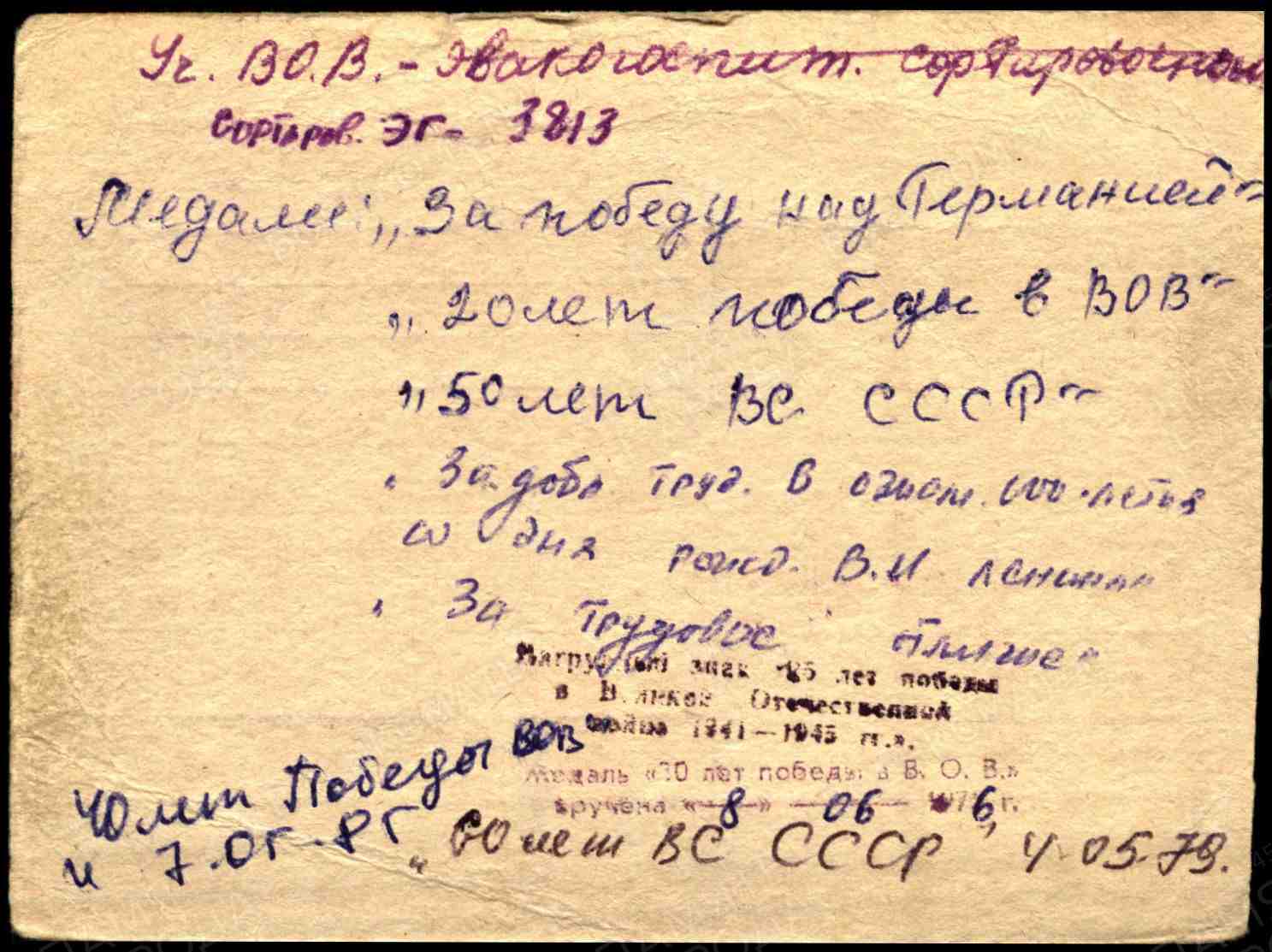 Воинское звание старший сержант медсестра СЭГ-3813. Демобилизована в 1945 г.