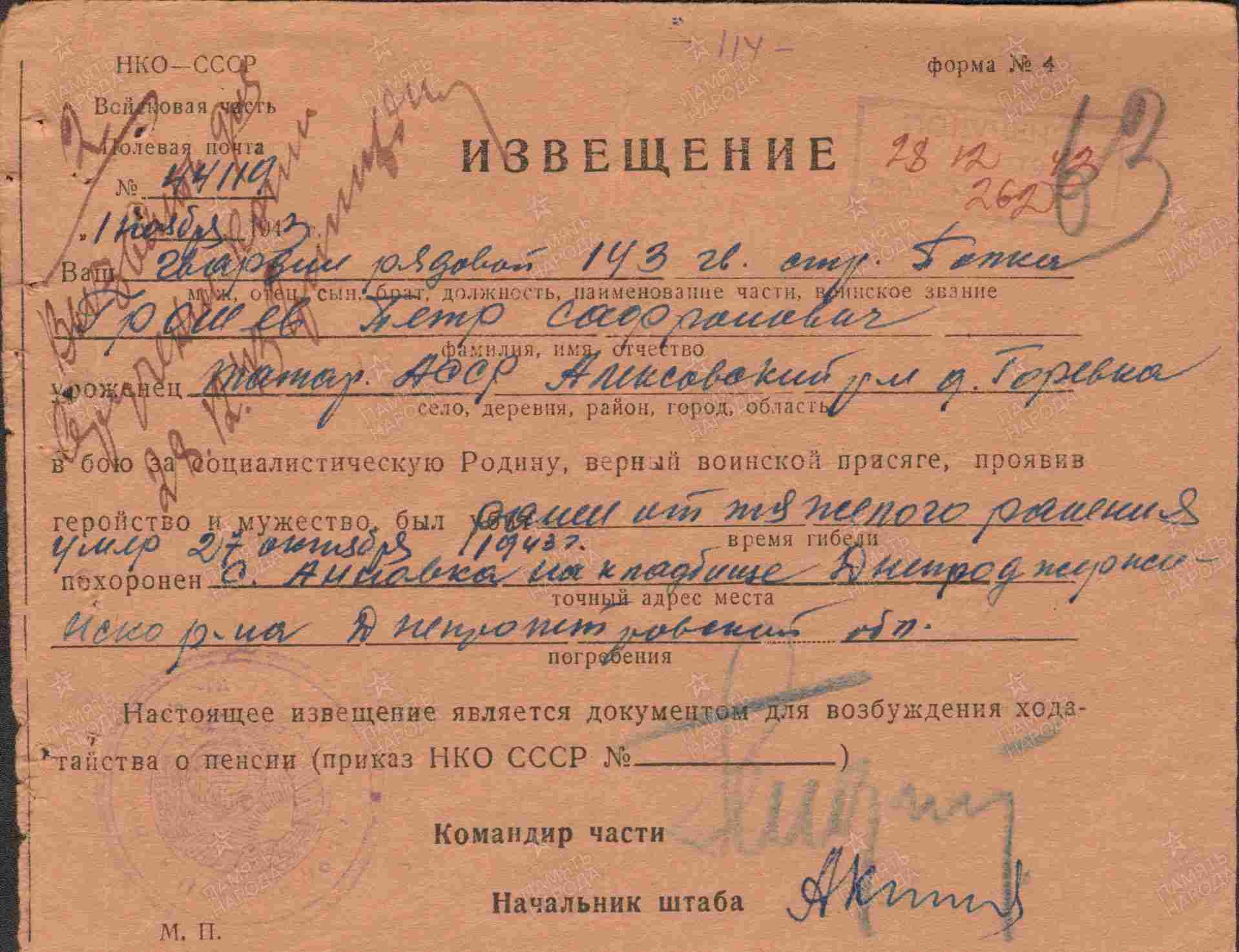 ГРОШЕВ Пётр Сафронович, 1925, д. Гурьевка. До призыва в армию работал в к-зе «Доброволец». Мобилизован Алексеевским РВК в янв. 1943. Гв. красноармеец, 146 гв. СП 48 гв. СД 6 А/ 57 А Юго-Западного, Степного, 2 Украинского фронта. Участник битвы на Курской дуге. Тяжело ранен в битве за Днепр. Умер от ран в 54 отд. МСБ 27 окт. 1943. Похоронен в д. Анновка, Днепродзержинский р-н, Днепропетровская обл., УкрССР.