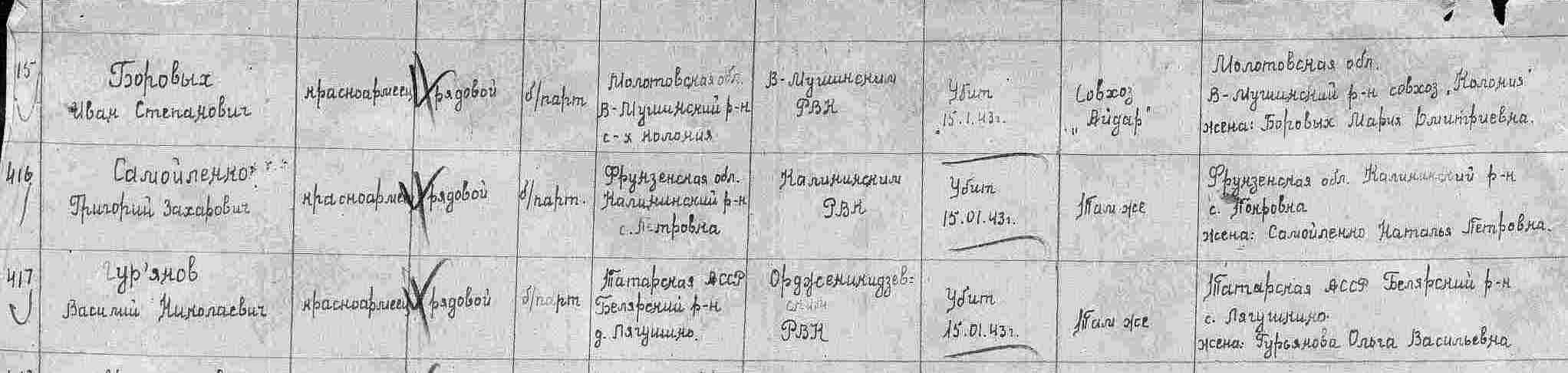ГУРЬЯНОВ Василий Николаевич, (год рождения не установлен), с. Лягушкино. Пунктом мобилизации указан Орджоникидзевский РВК. Красноармеец, 1176 СП 350 СД 6 А Юго-Западного фронта. Погиб 15 янв. 1943, с-з «Айдар», Белолуцкий р-н, Ворошиловградская (Луганская) обл.