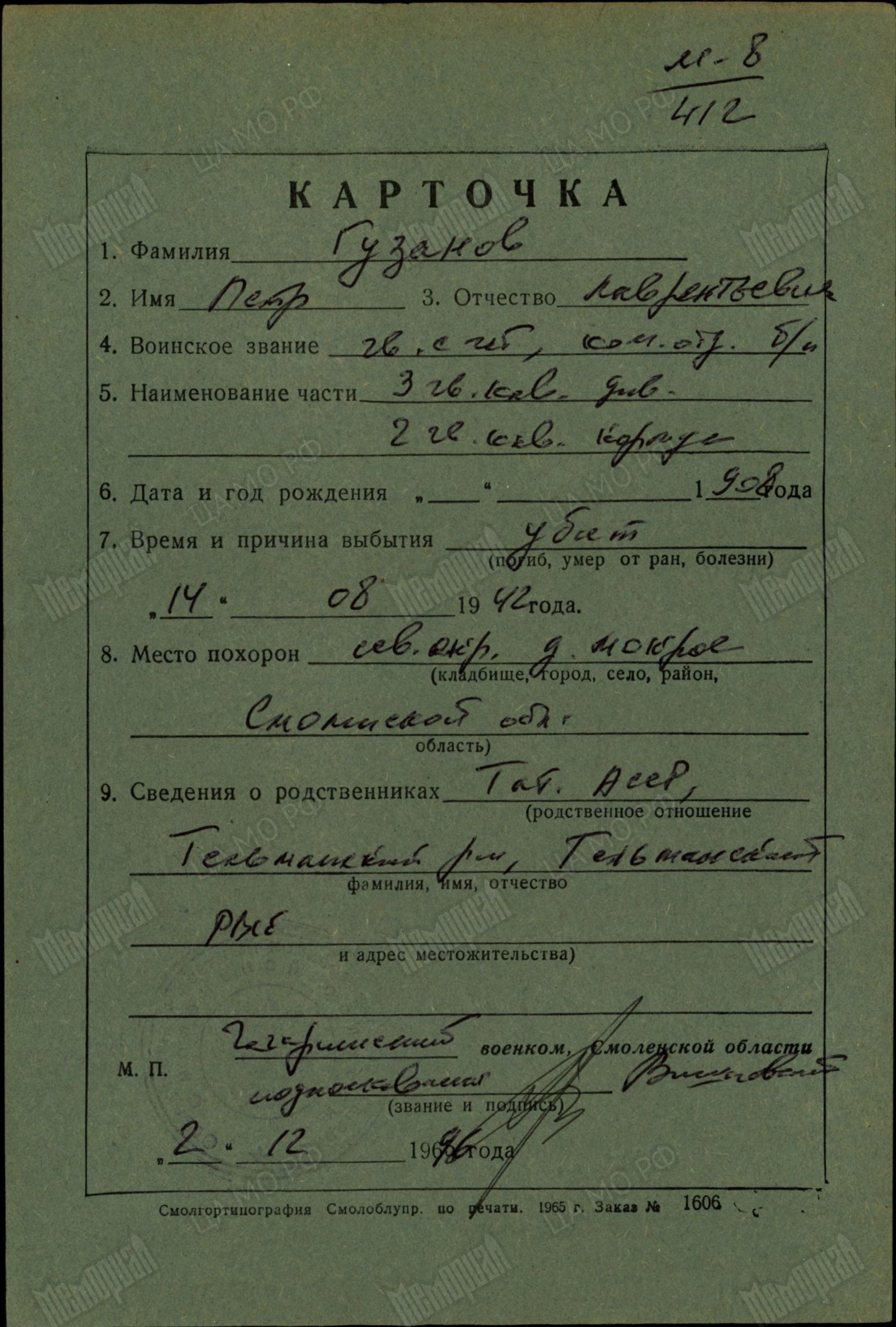 ГУЗАНОВ Пётр Лаврентьевич, 1908, с. Старое Альметьево. Проживал в с. Билярск. Работал фельдъегерем Билярского райотдела НКВД. В марте 1937 г. предъявлено обвинение по ст. 58-12 за "связь с контрреволюционными элементами" и взята подписка о невыезде. Военным трибуналом ПриВО 13 февраля 1938 г. дело было прекращено за недостаточностью улик. На фронт мобилизован Тельманским РВК. В 1942 г. - командир отделения 9 гв. кав. полка 3 гв. кав. дивизии, гв. сержант. Погиб в бою 14 августа 1942 г. у д. Мокрое Сычёвского (ныне Гагаринского) района Смоленской обл.