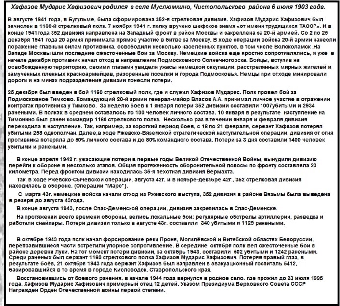 ХАФИЗОВ МУДАРИС ХАФИЗОВИЧ Район: ЧистопольскийПрикреплённые изображения: Фронтовики Опубликовано 12 мая, 2020 - 22:23 пользователем Чистопольский м...