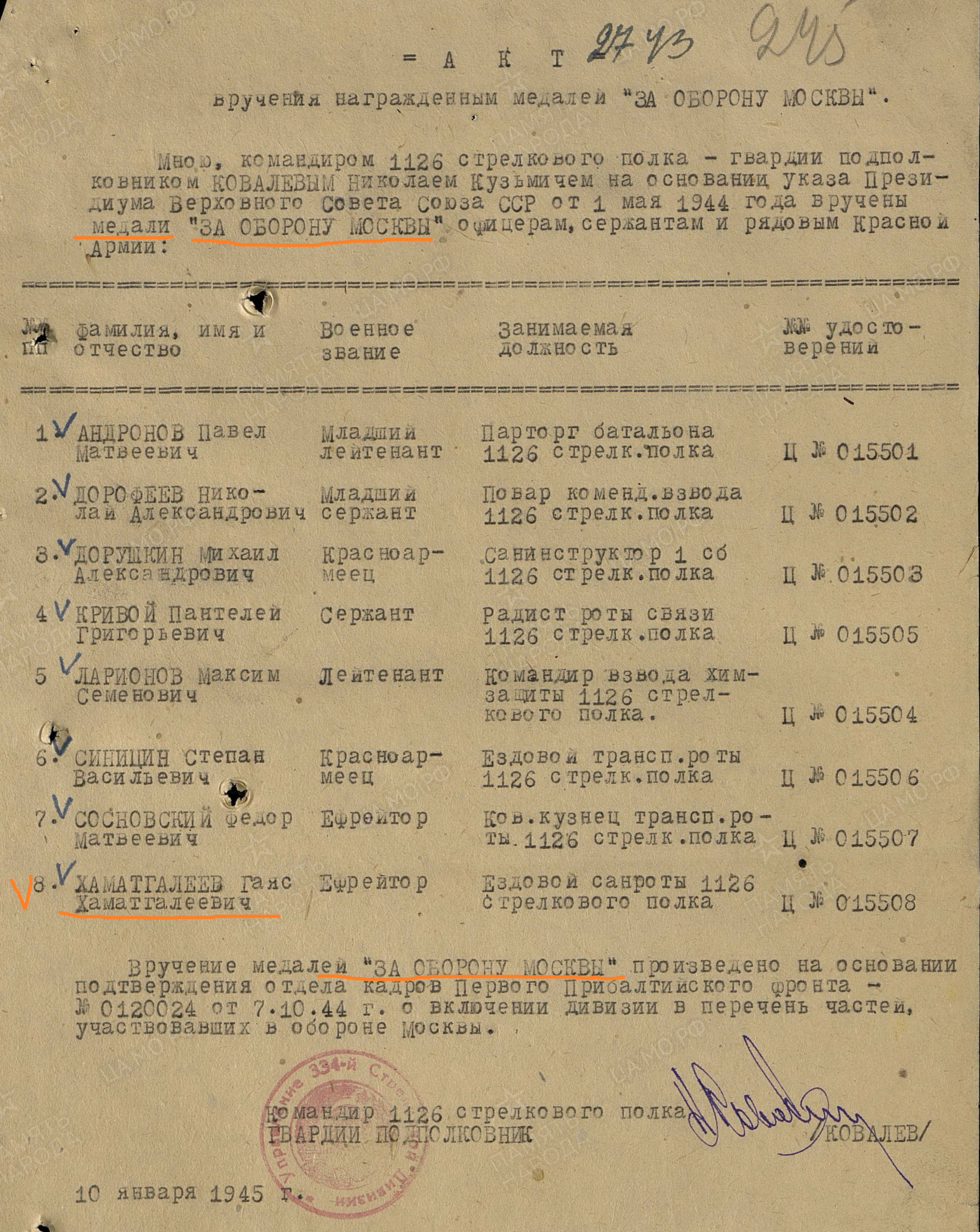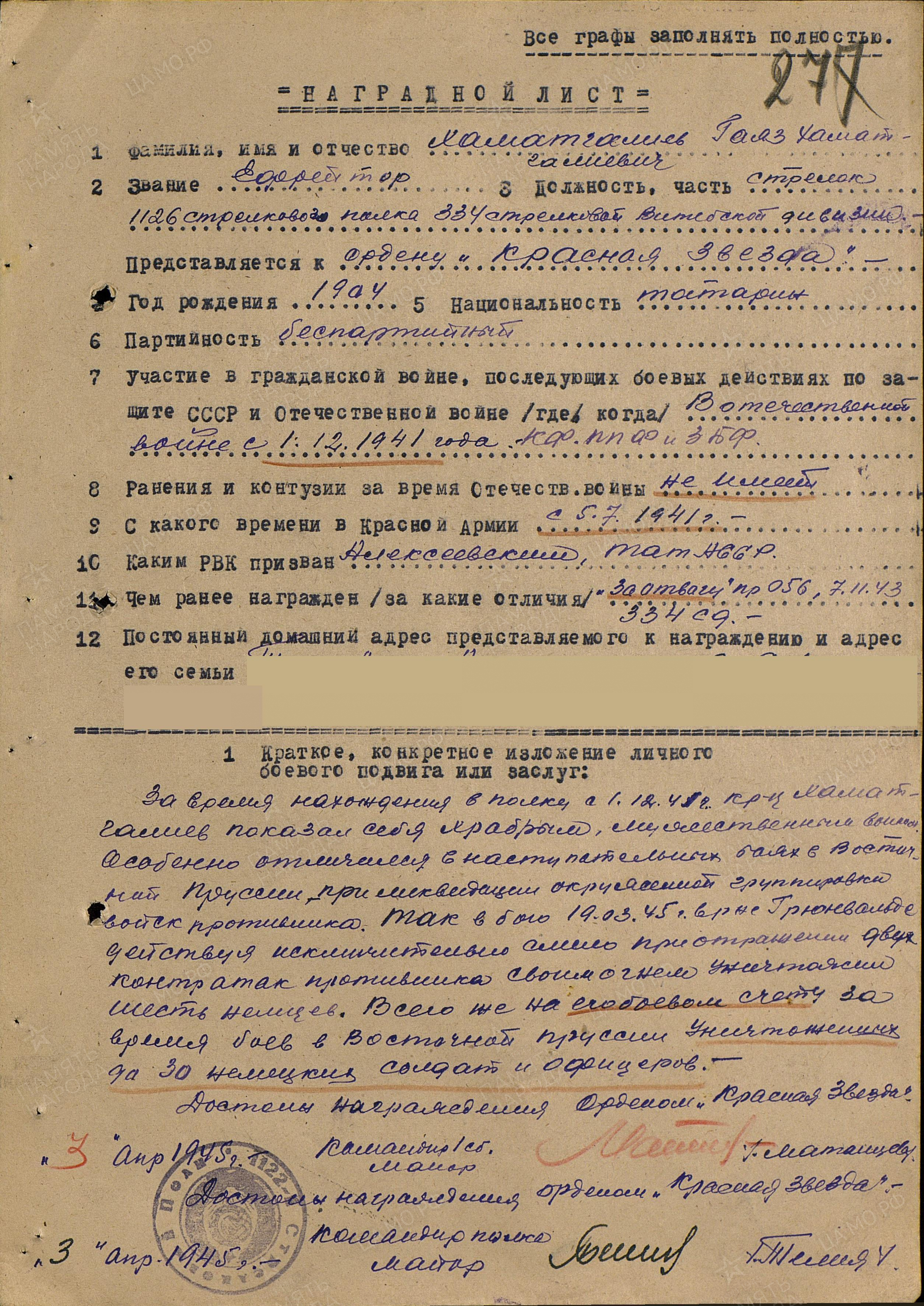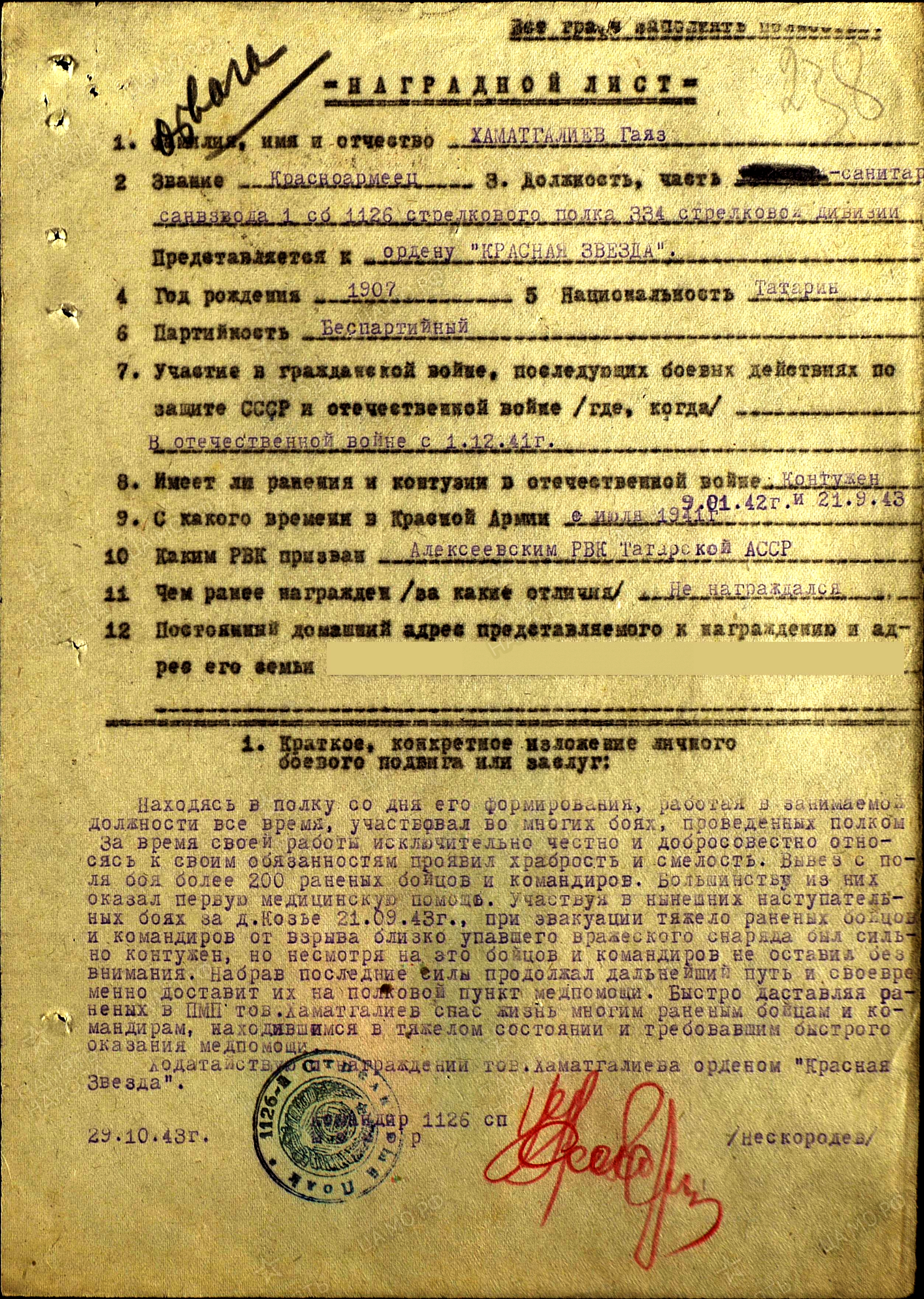 ХАМАТГАЛИЕВ Гаяз Хаматгалиевич, 1904(7), с. Степная Шентала. Мобилизован Алексеевским РВК 5 июля 1941. Ефрейтор, санитар-ездовой санитарной роты, стрелок 1126 СП 334 СД в составе 4 УдА СЗФ и 24 А КалинФ, 43 А и 51 А 1 ПрибФ, 2 гв. А 3 БелФ. Участвовал в обороне Москвы, боях под Нелидово и Велижем, освобождении Белоруссии, Прибалтики, боях в Вост. Пруссии. Дважды представлялся к ордену Красной Звезды. Был контужен 9 янв. 1942 и 21 сент. 1943. В должности санитара вывез с поля боя на ПМП более 200 раненых бойцов и командиров, оказав им первую помощь, тем самым спасая их жизнь. За период боёв под Кёнигсбергом, в январе-апреле 1945, из личного оружия уничтожил до 30 гитлеровцев. Награждён медалями «За оборону Москвы», «За отвагу», орденом Славы 3 ст.