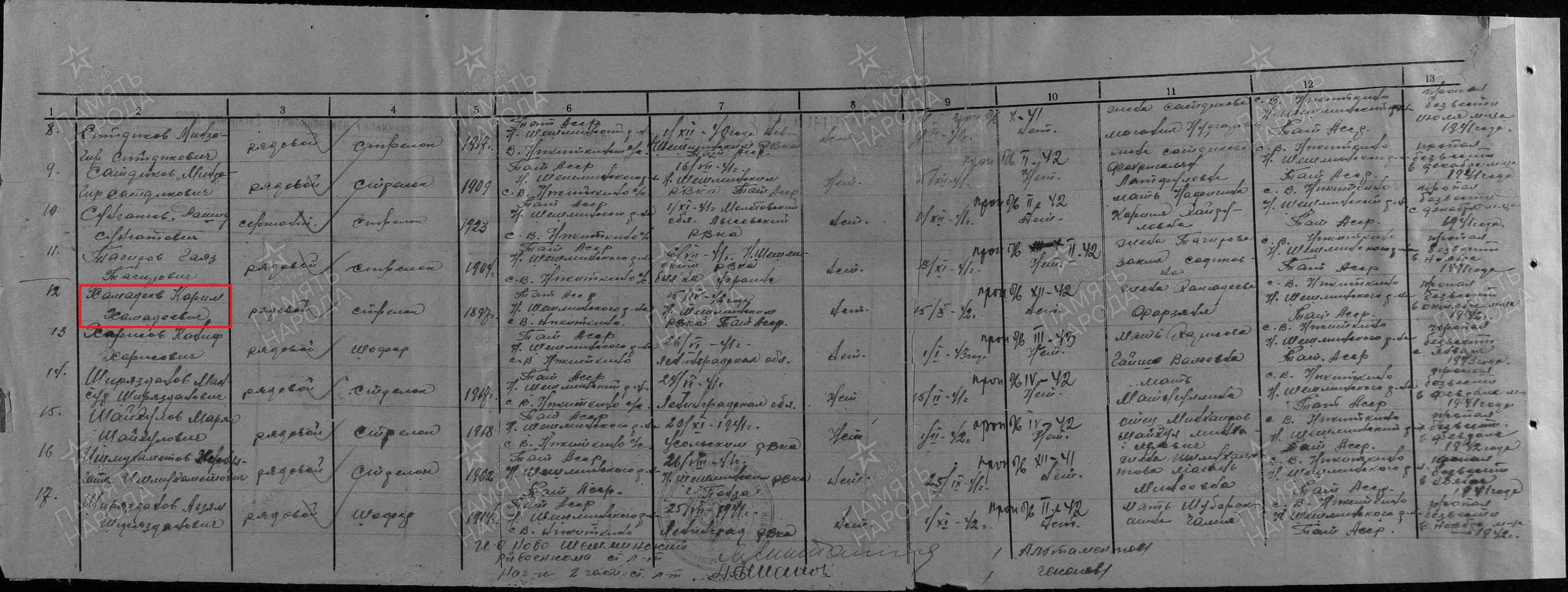ХАРИСОВ КАНИФ ХАРИСОВИЧ родился в с.Верхнее Никиткино Казанской губернии Чистопольского уезда Ерыклинской волости (ныне с. Тубылгы-Тау Новошешминского района РТ). Дата и место призыва 26.06.1941 неизвестный РВК, Ленинградская обл., рядовой. Пропал без вести: 03.1943 г.