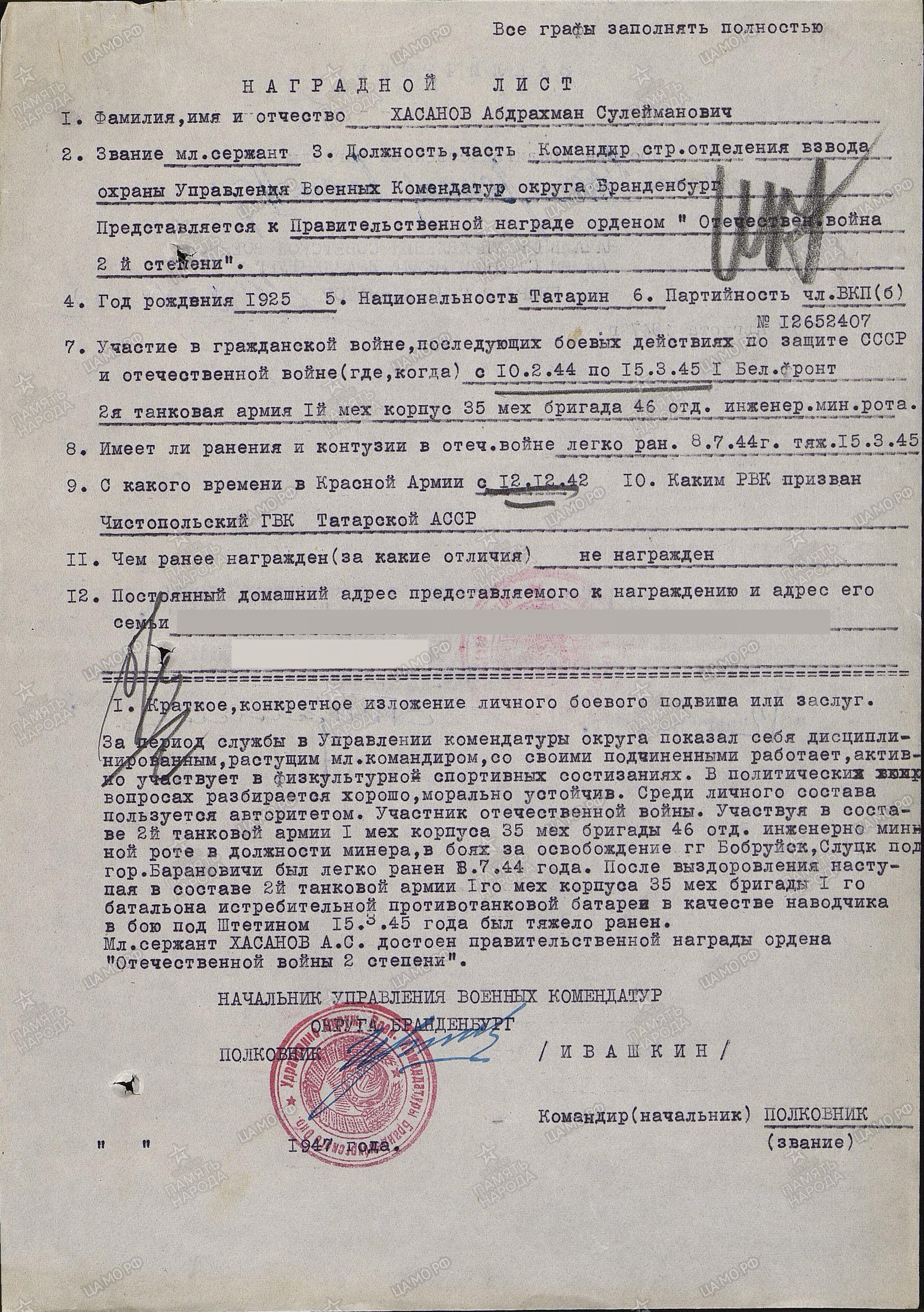 Хасанов Абдрахман Сулейманович родился в 1925 году. Был призван в ряды Красной Армии ГВК 12 декабря 1942 года.